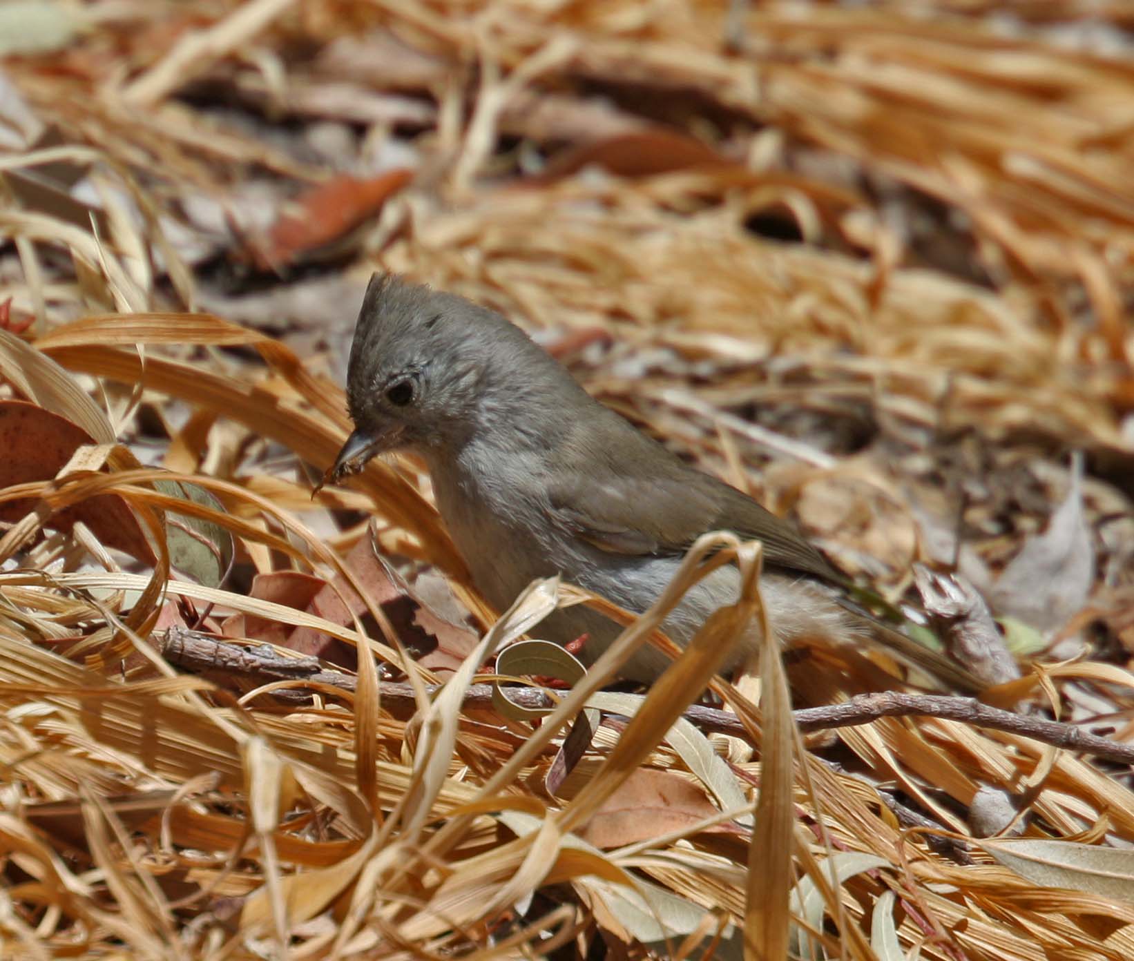The Oak Titmouse is a small passerine that is resident year-round on the Pacific coast from southern Oregon to Baja California. They eat insects and spiders and sometimes will also eat berries, acorns, and some seeds.