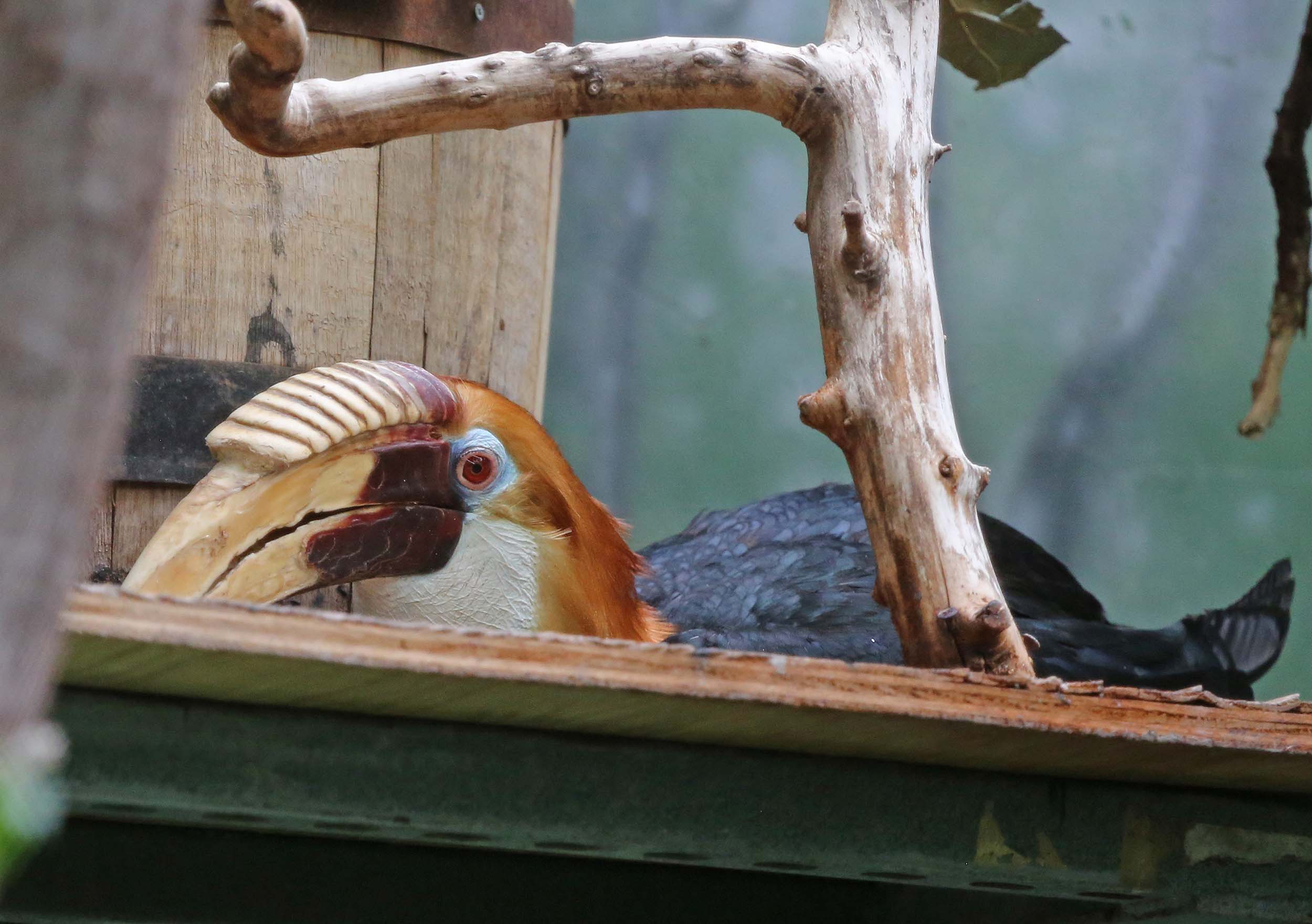 The Papuan Hornbill or Blyth's Hornbill and are found in the Moluccas, New Guinea, the Bismarck Archipelago and the Solomon Islands. They are sexually dimorphic. The male has a black body, rufous colored head, white throat and a white tail. Bill is pale yellow with a brown base. Females are black with a white throat and tail. Their bill is also pale yellow with a smaller brown base.