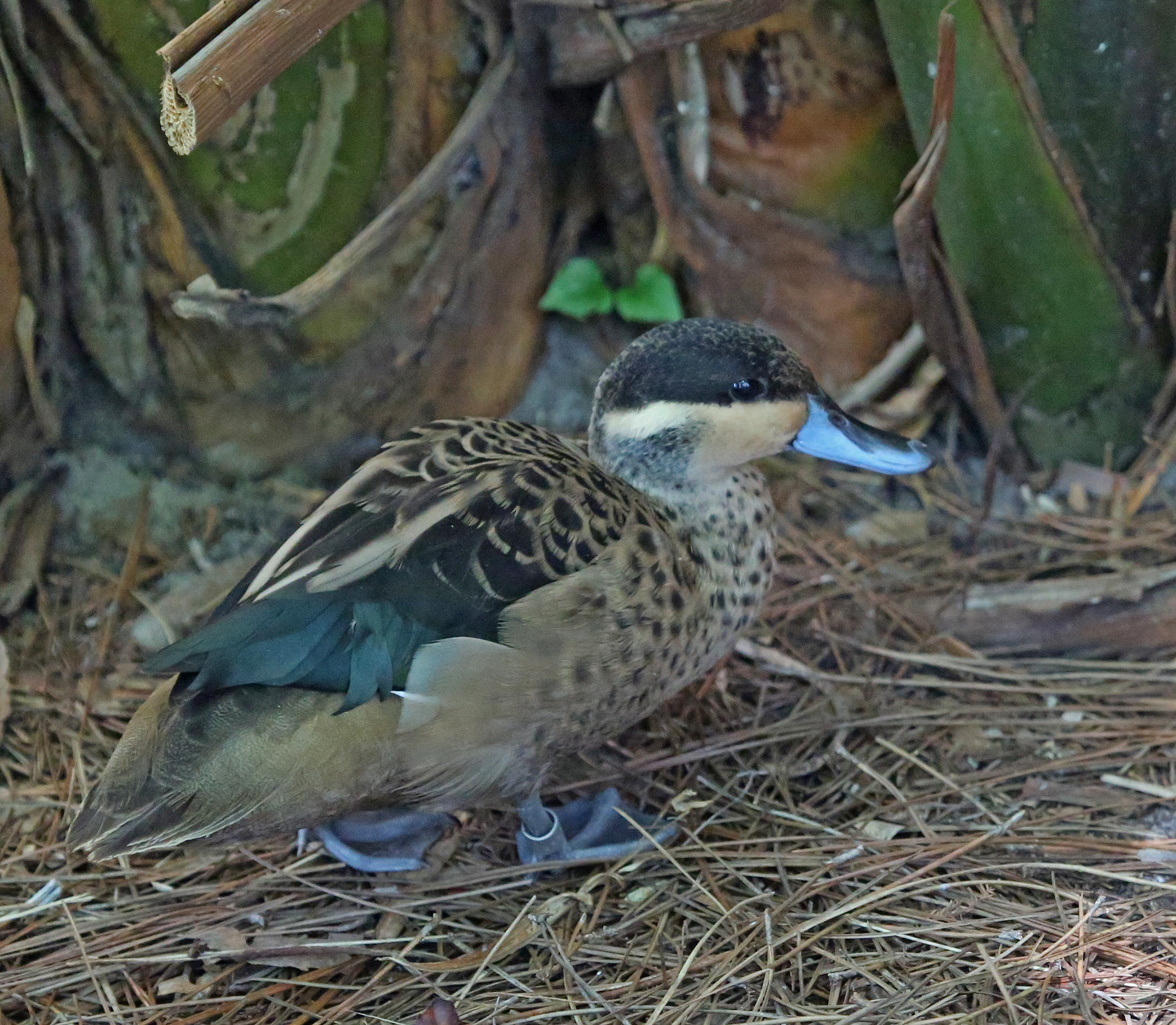 The Puna Teal is a dabbling duck that is found in South America. They are also known as the Silver Teal. Puna Teals have a black cap that extends below the eyes. The rest of the face and neck are white. They bill is large and a powder blue color with a black strip down the middle. Their body is a combination of mottled browns and grays and they have brown eyes and dark grey legs and feet.