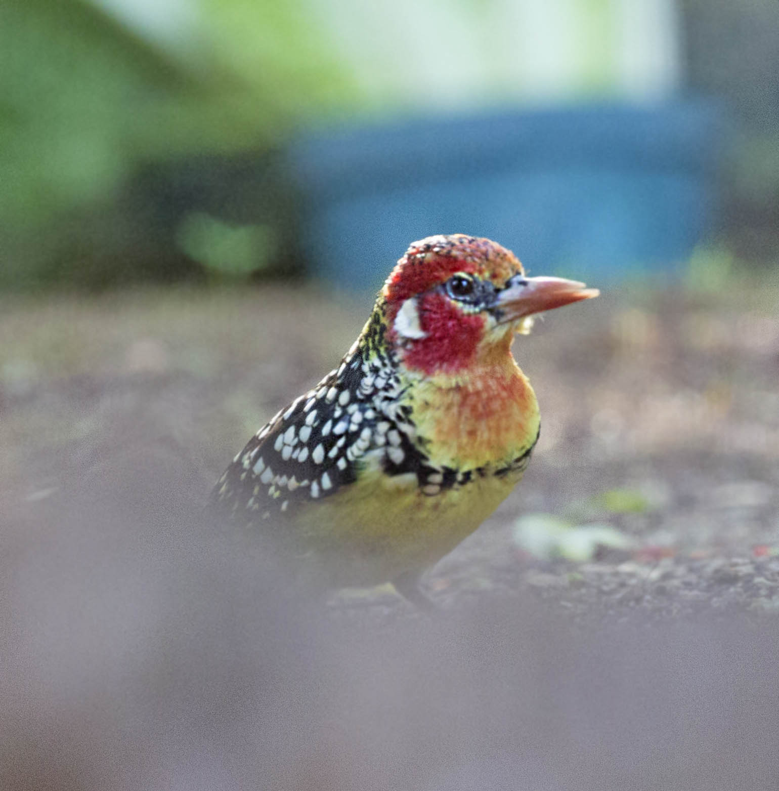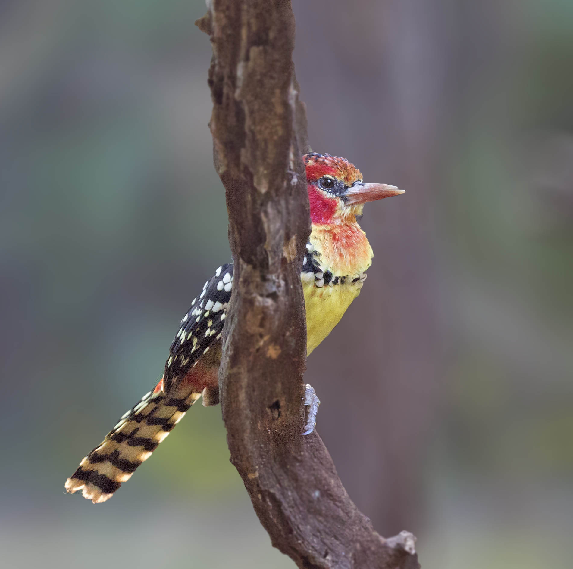 The Red-and-yellow Barbet is found in eastern Africa. Sexes are similar but females and juveniles are less brightly colored. They eat seeds, fruit and invertebrates.