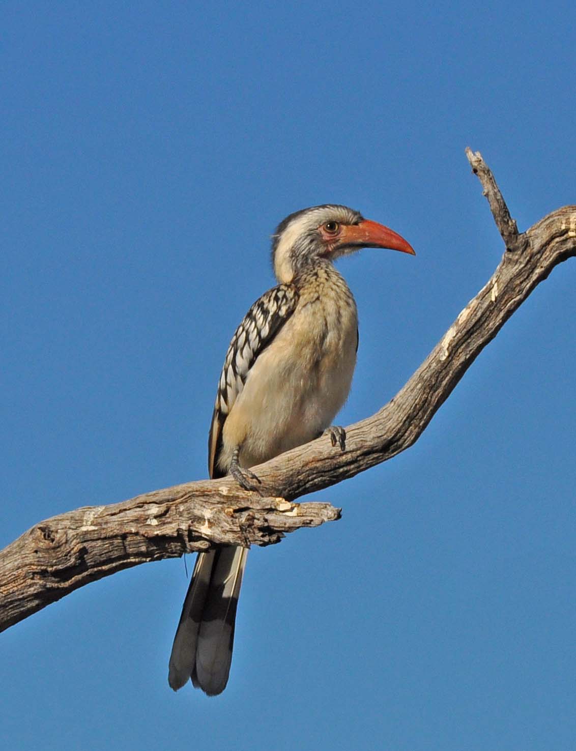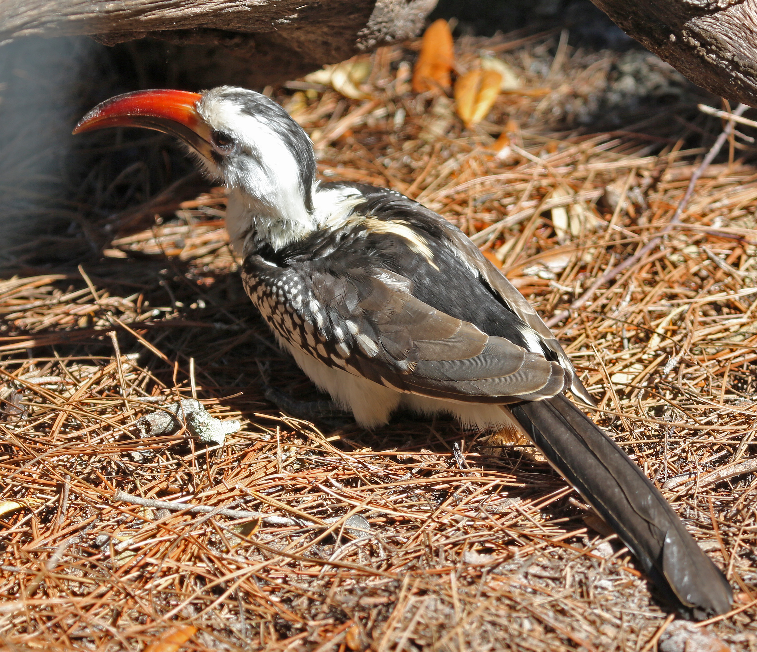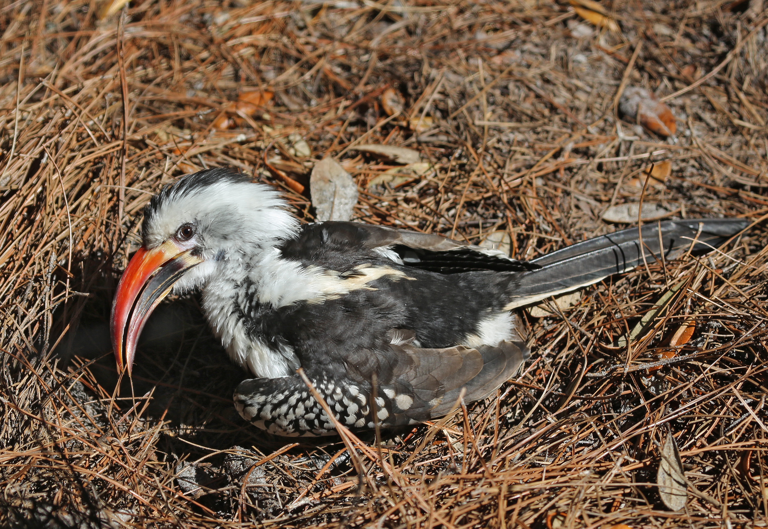 The Red-billed Hornbill are found in savanna and woodlands in sub-Saharan Africa. Sexes are similar but the female has a smaller bill. The nest is blocked off with a plaster wall made of mud, droppings and fruit pulp. Both the female and eggs are inside of this nest. A small hole is left in the wall so the male can provide food to the mother and chicks. When the nest becomes too small, the female will break out, she will rebuild the wall and then both parents will continue to feed the chicks.