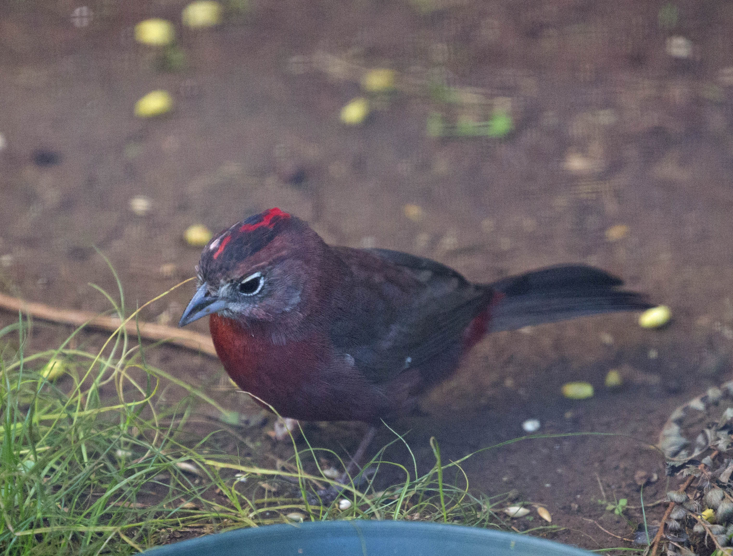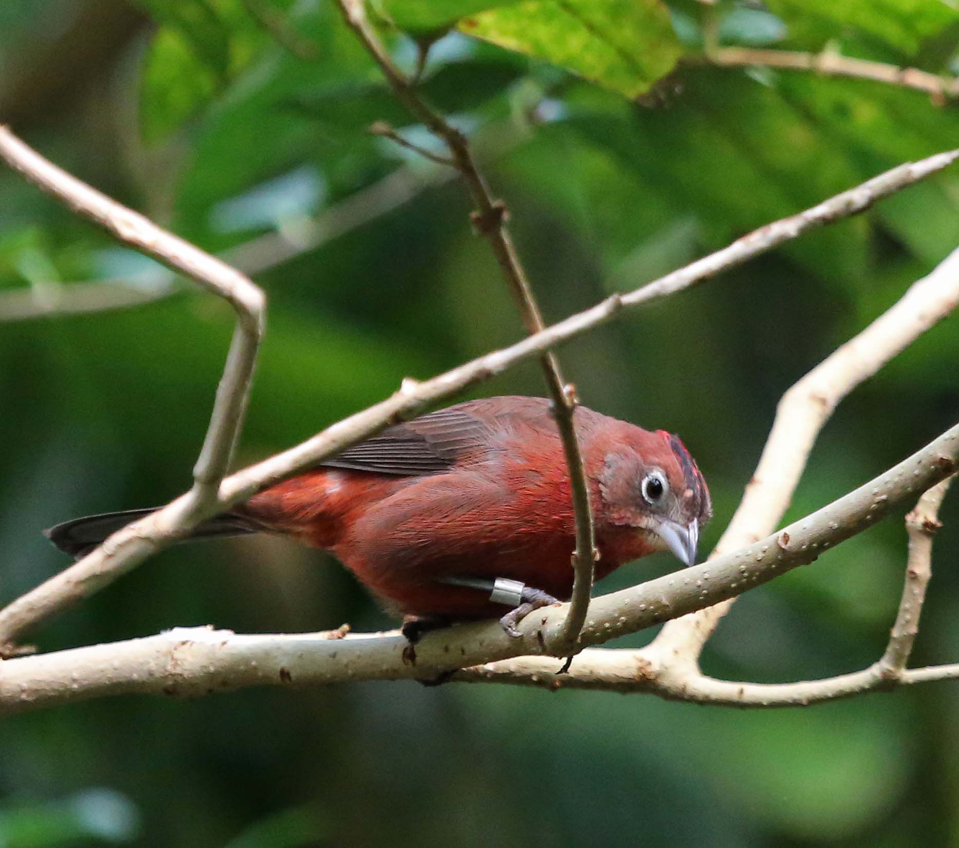 The Red-crested Finch or Red-pilated Finch is found mainly in central South America and can be found in parts of Brazil, Paraguay, Uruguay, Argentina and Guianas. The sexes are sexually dimorphic. The male is mostly a dark red with a black crown with a red stripe. Eyes are dark brown with a white eye ring. Females are more light brown with a whitish throat and a crimson rump.