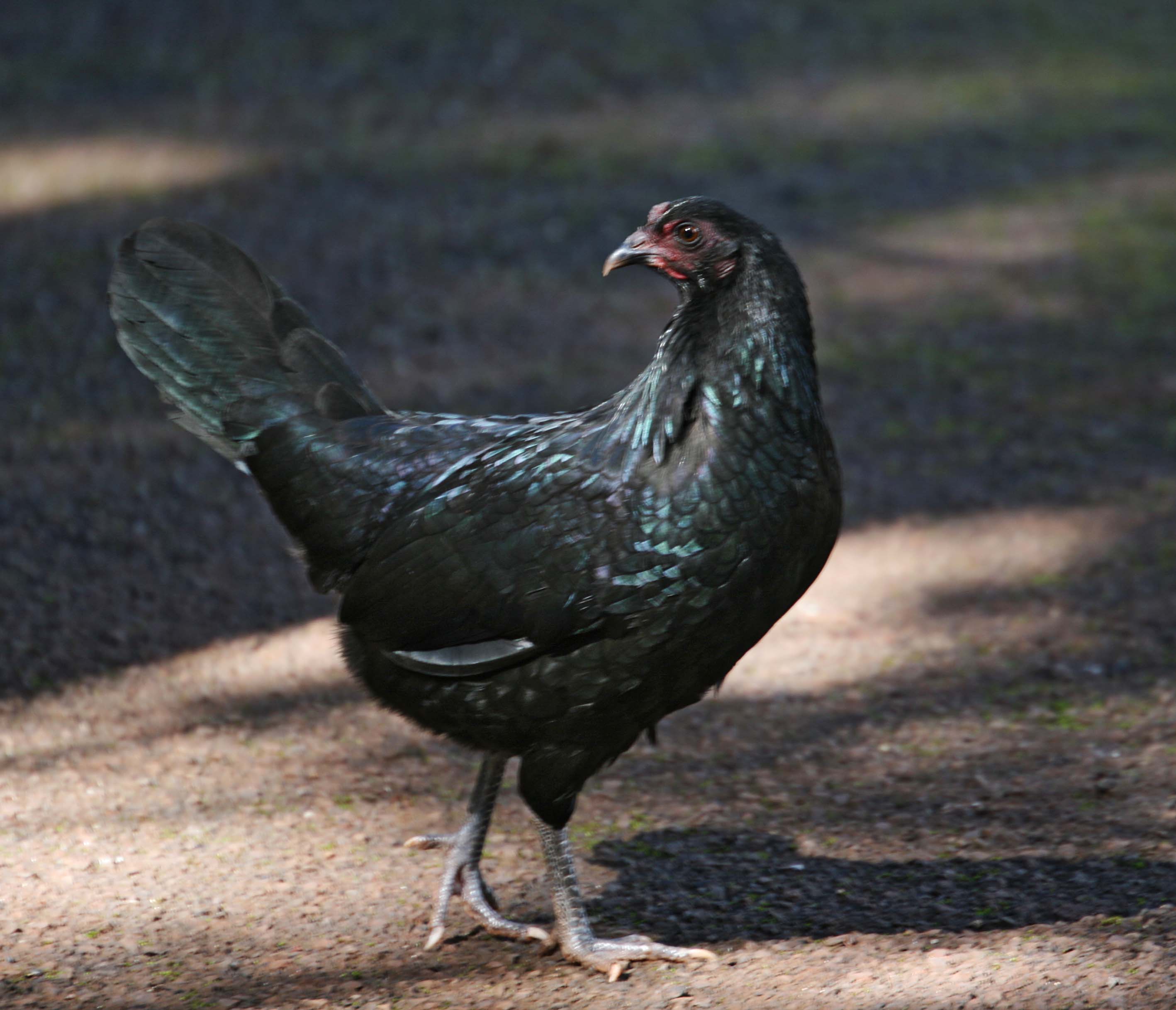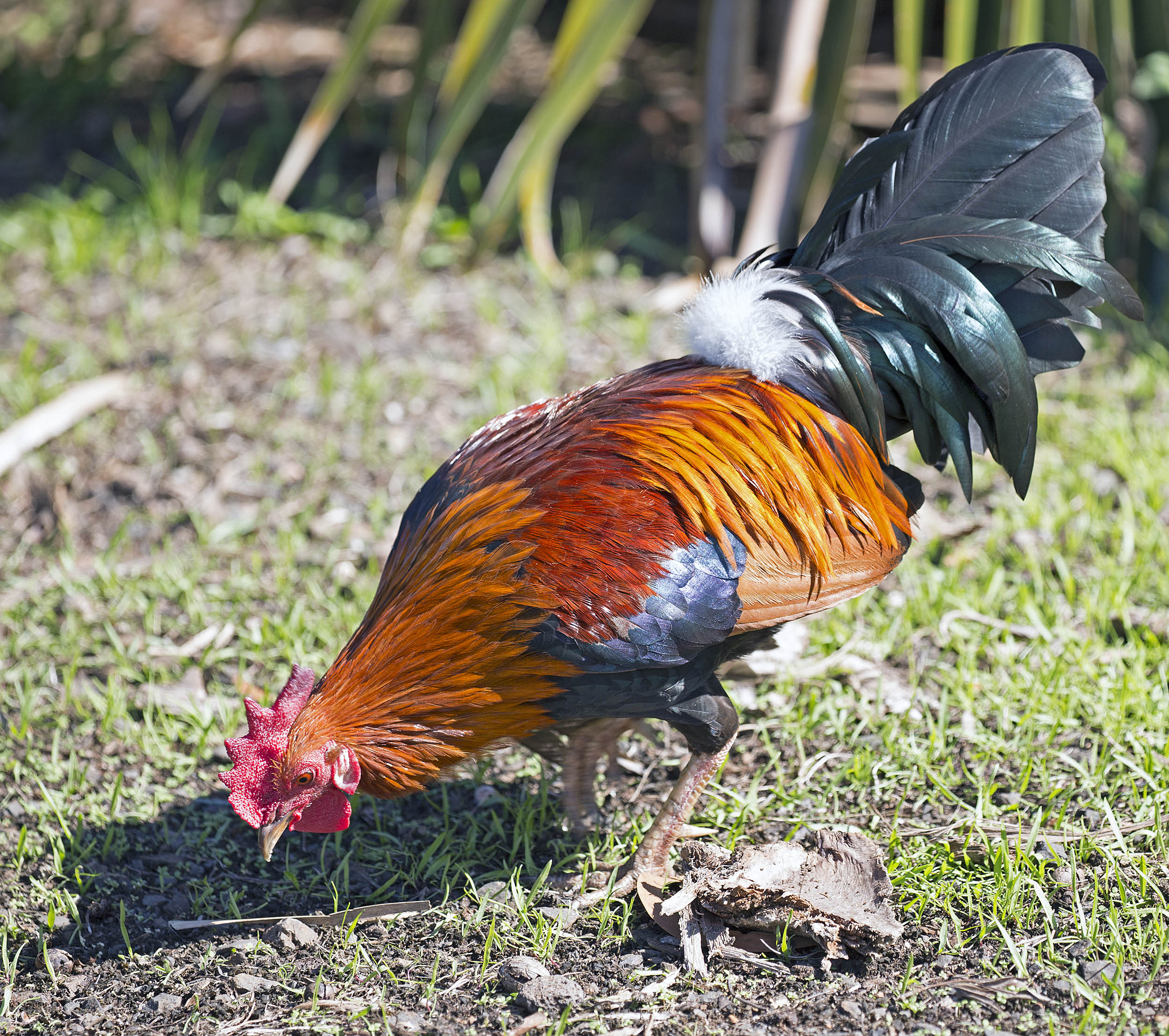 The Red Junglefowl is a tropical member of the Pheasant family. It was first raised in captivity several thousand years ago on the Indian subcontinent. They run wild on several of the Hawaiian Islands, but these birds are probably feral descendants of domestic chickens.