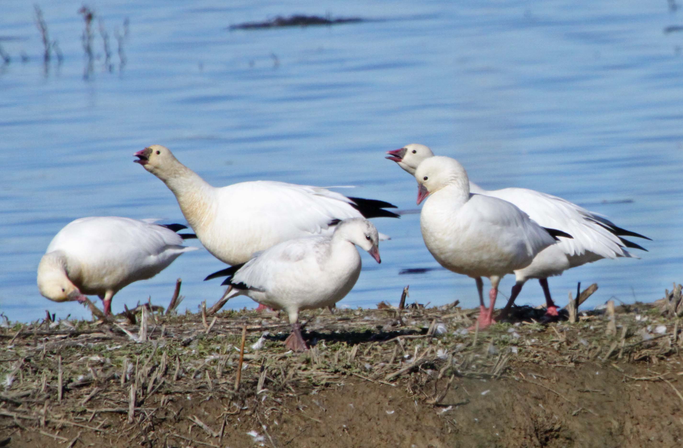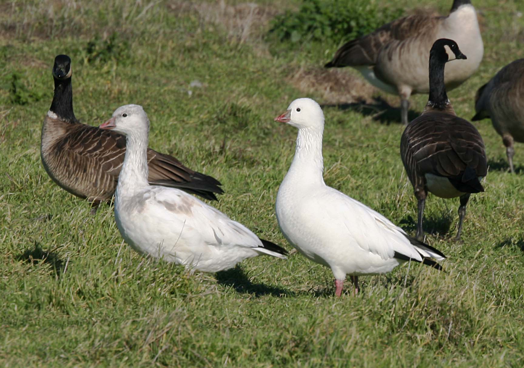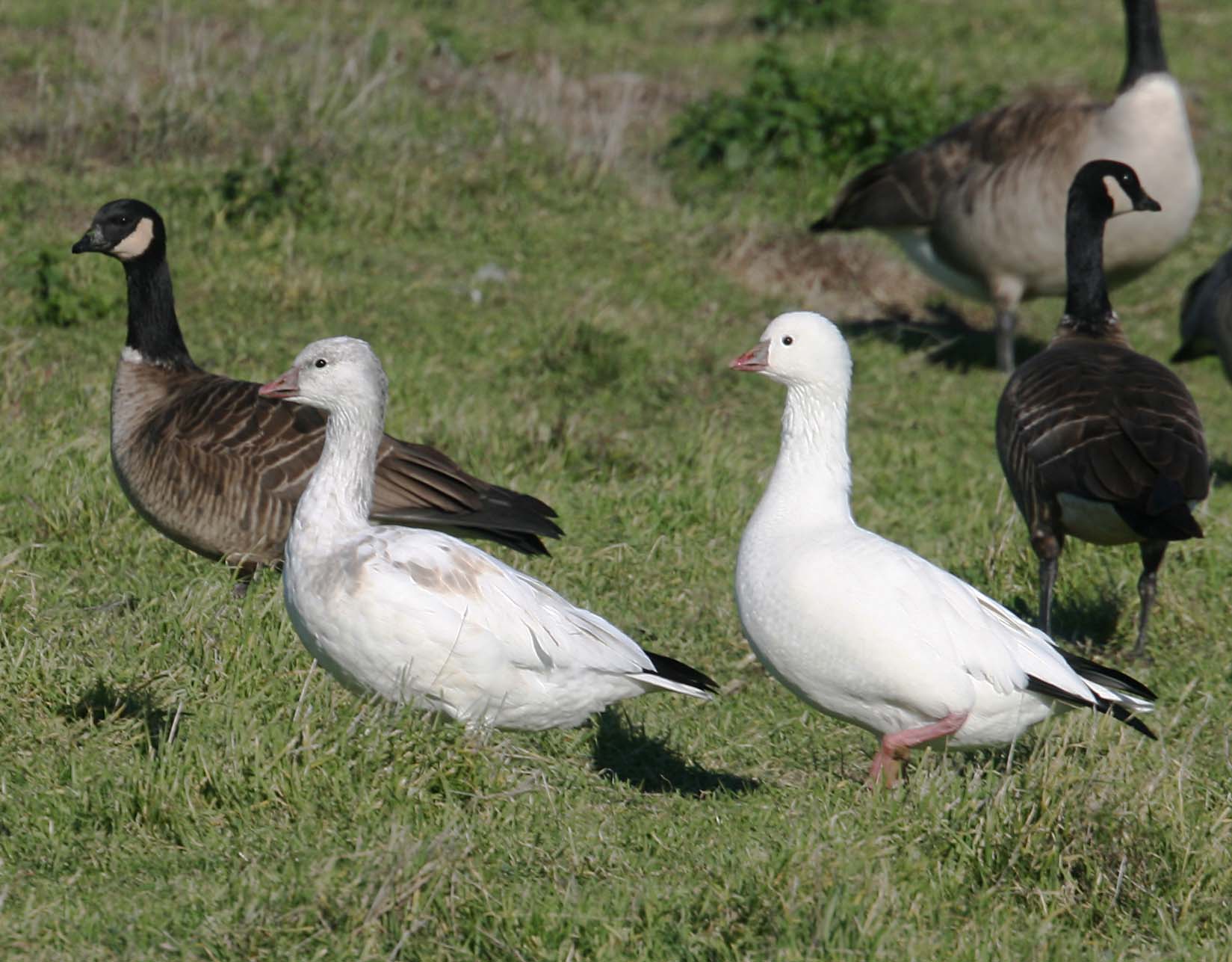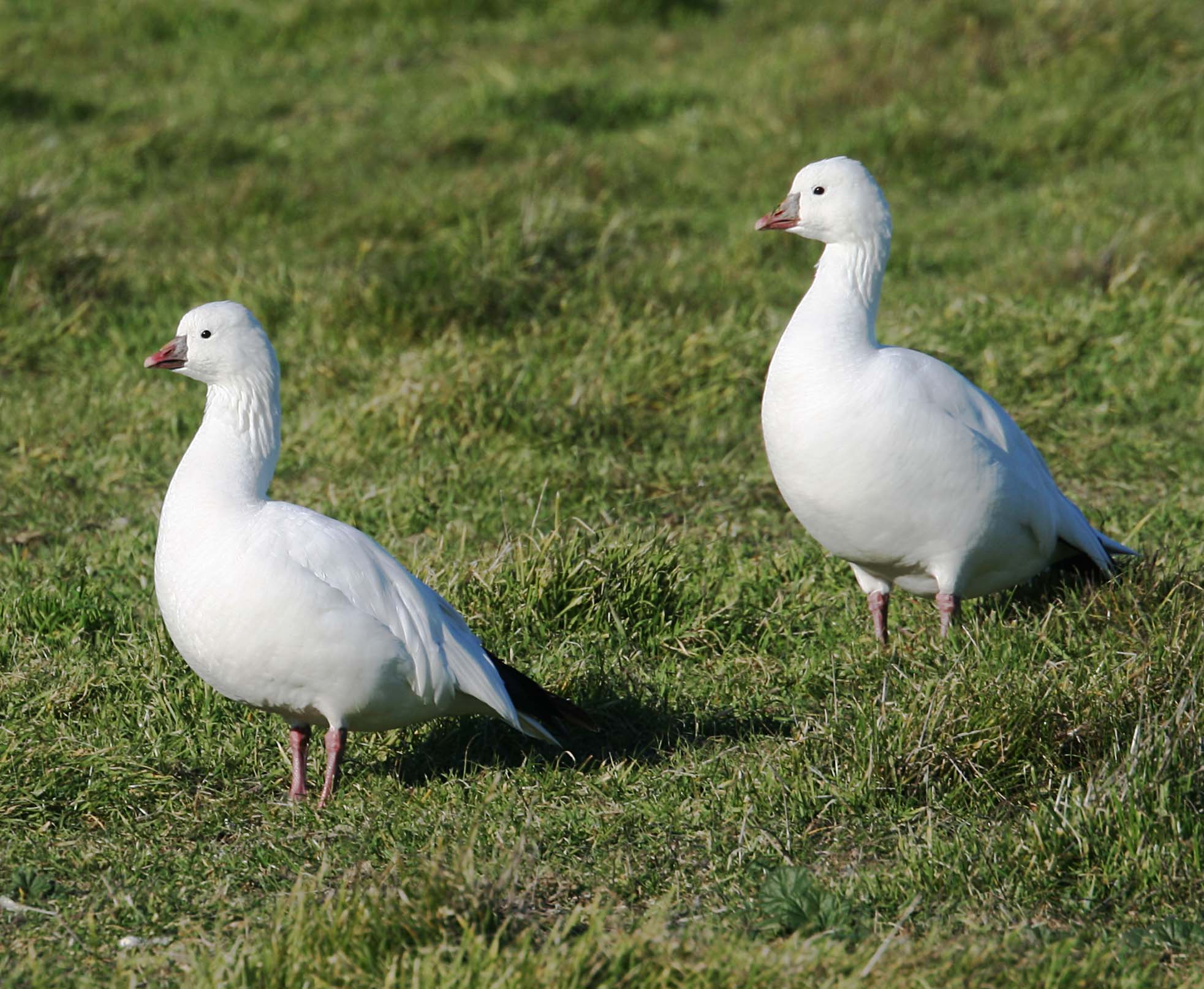 The Ross's Goose is similar looking to the Snow Goose, but smaller in size and bill. They are a North America goose. The sexes look alike with the male slightly larger. They eat grasses, sedges, legumes, and domestic grains.