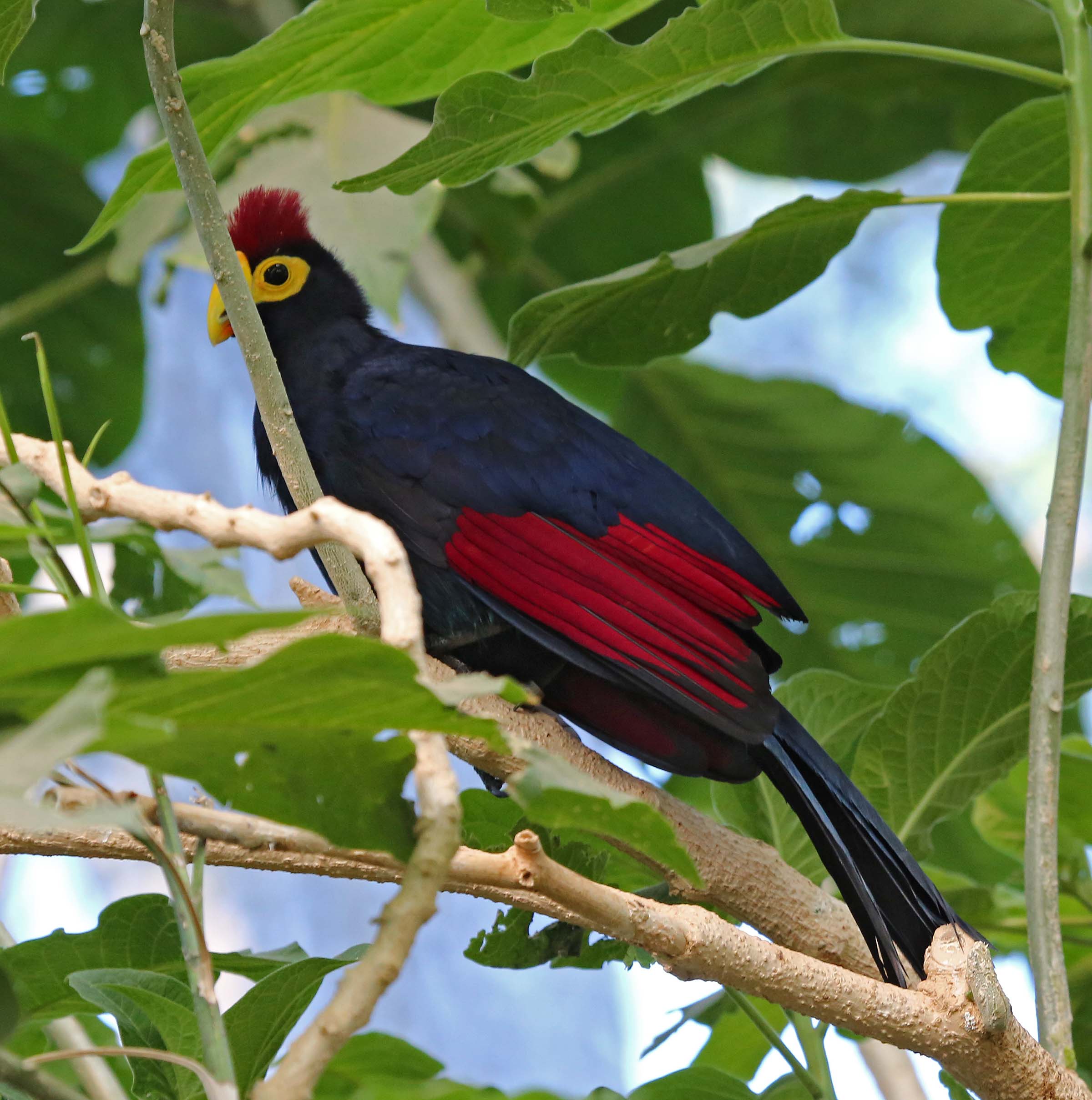 Ross's Turaco or Lady Ross's Turaco is found in Africa. They are found in pairs or small groups, but will gather in larger groups in fruit trees where they feed on wild or cultivated fruits.