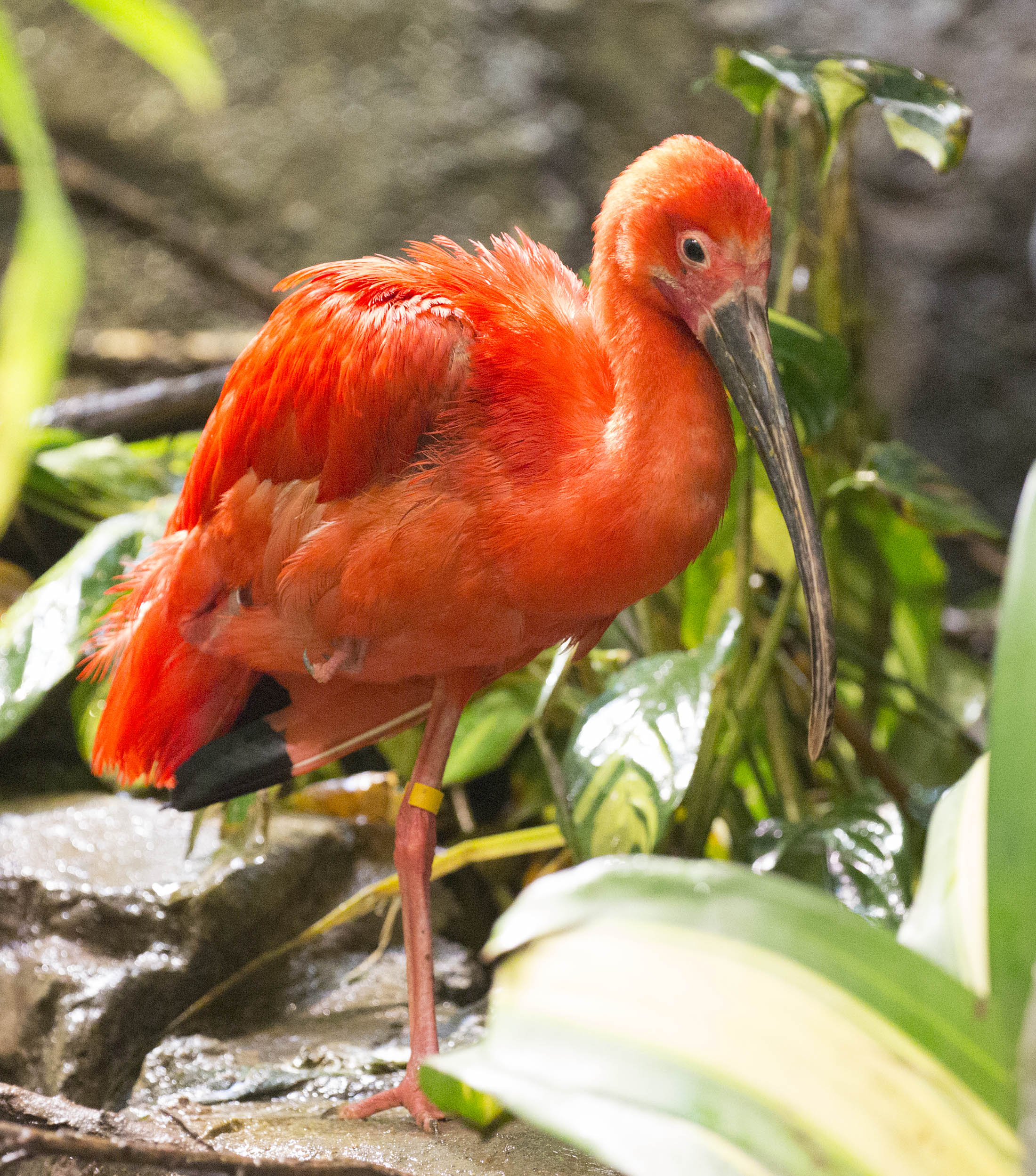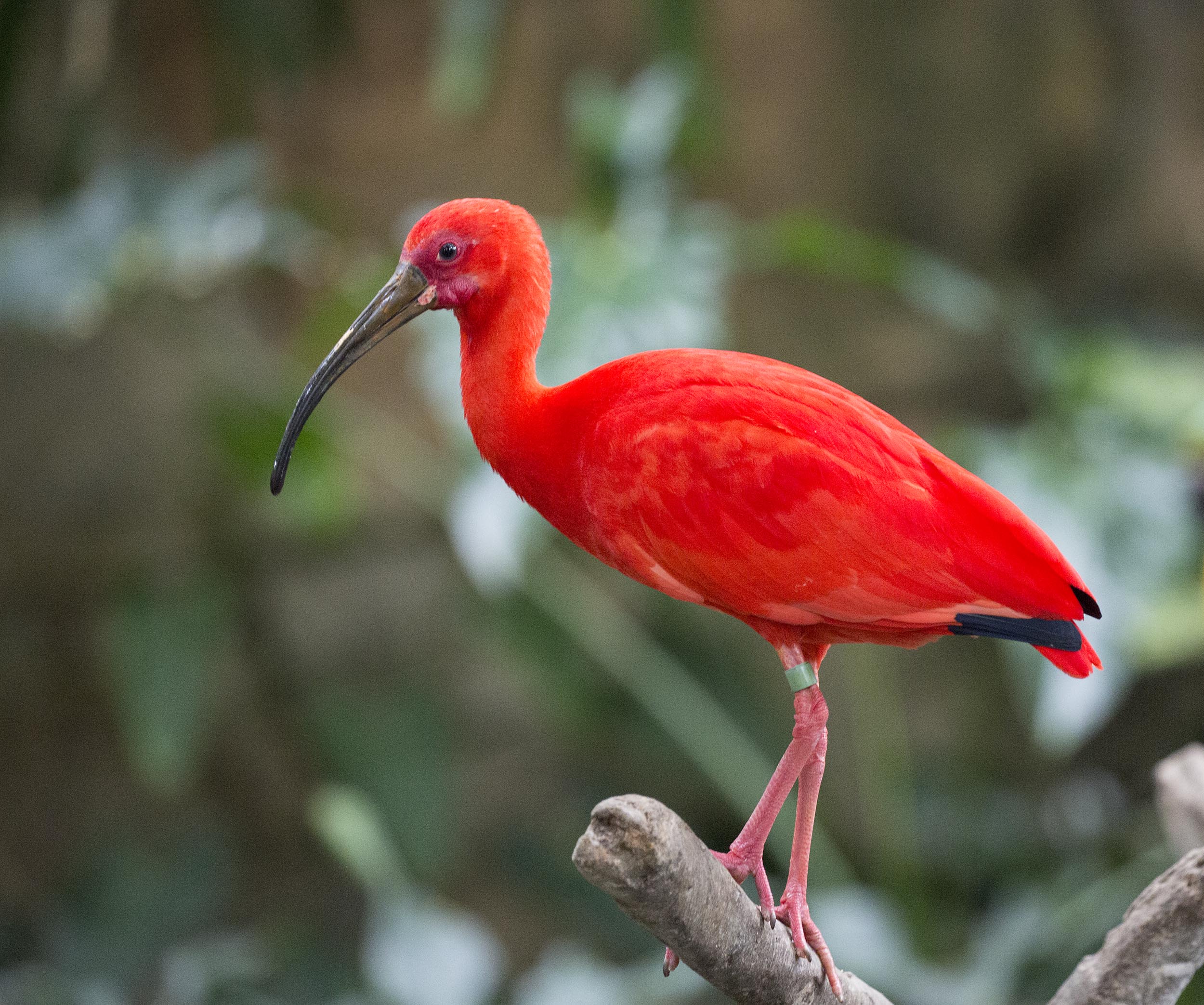 The Scarlet Ibis is easily recognized because of its scarlet plumage which gets brighter as they age. Their wingtips are black, their legs and feet pink. Their nostrils are at the base of their bill which allows them to breathe as they stick their bill in water or mud. Scarlet Ibises are social birds and are found in large flocks.