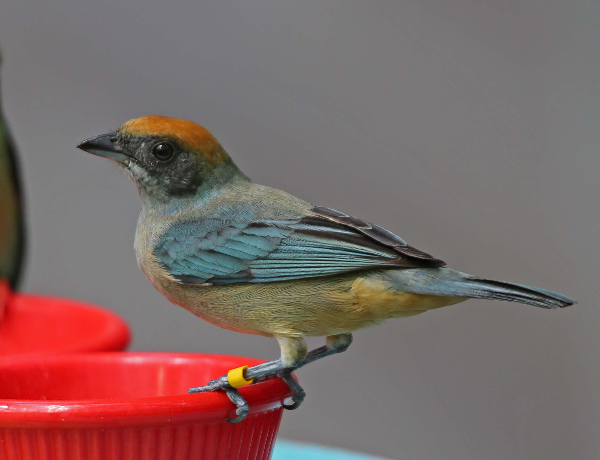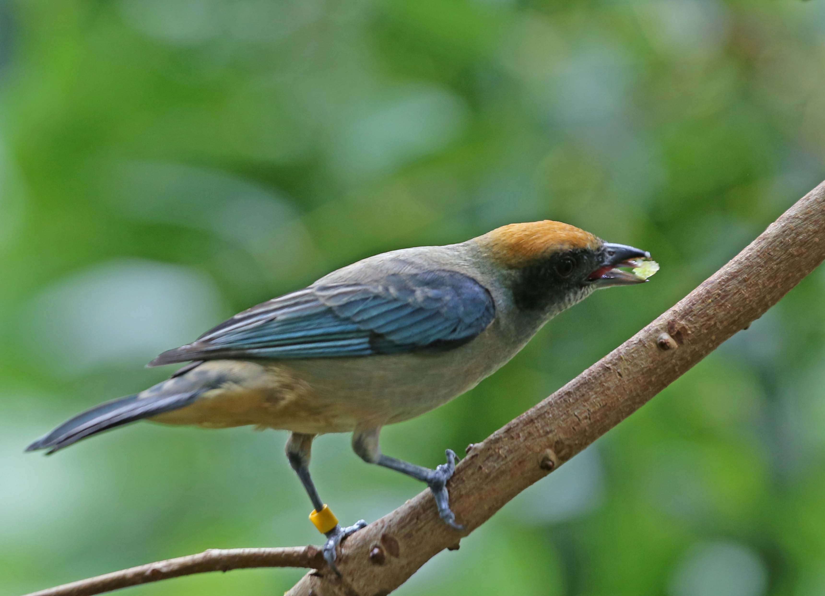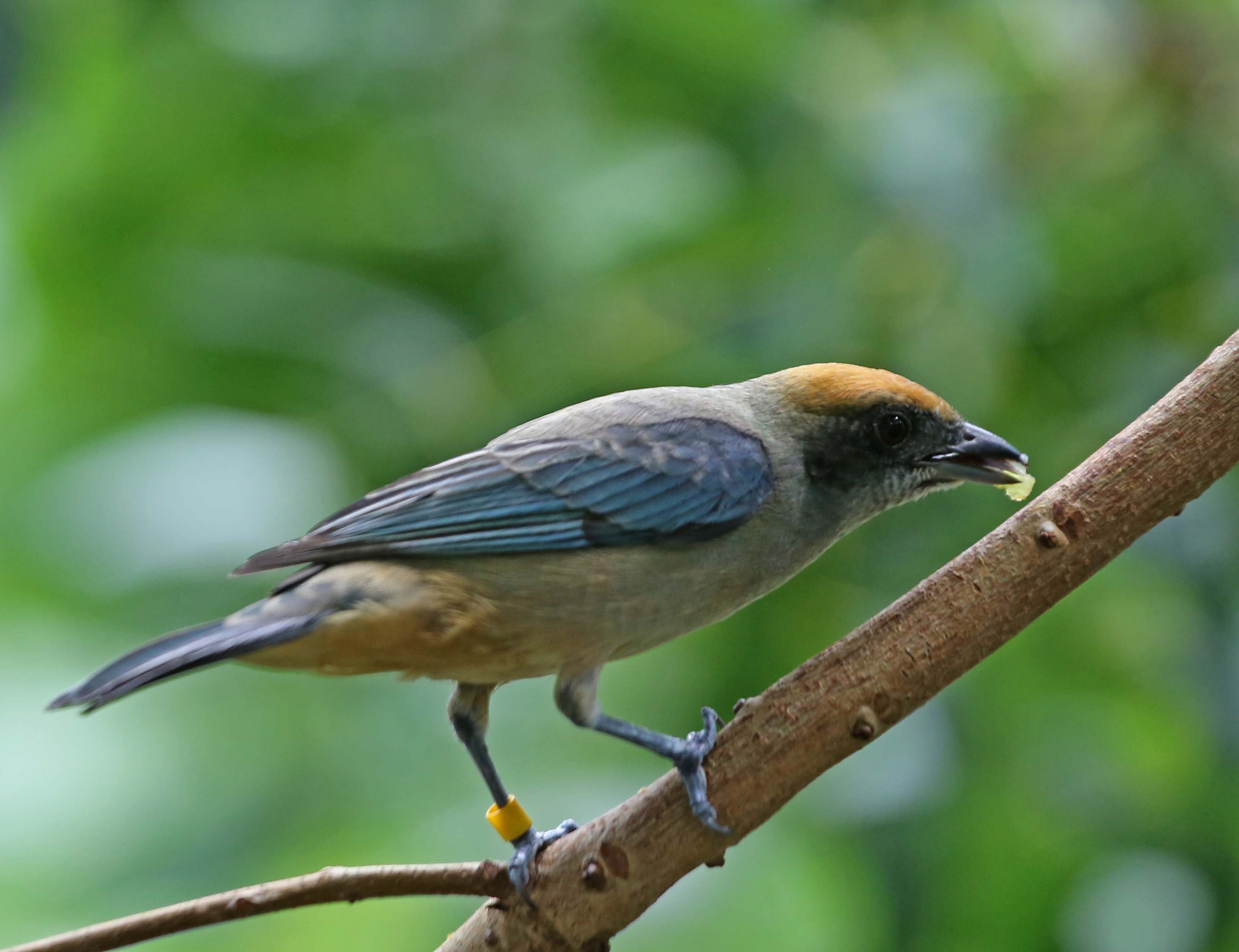 Scrub Tanagers are found in the Colombia and Ecuador Andes. Scrub Tanagers body is mostly silvery gray and greenish blue with the wings and tails darker and the underparts lighter. The underparts also have an rust wash, especially at the undertail coverts. The head has a rust color crown, a black mask and dark eyes. Both sexes are similar.