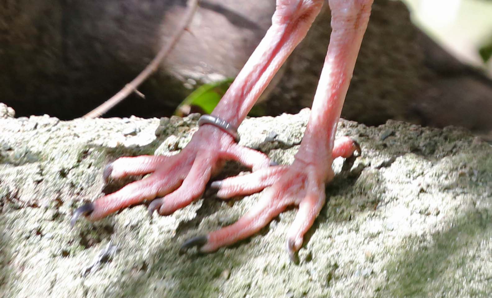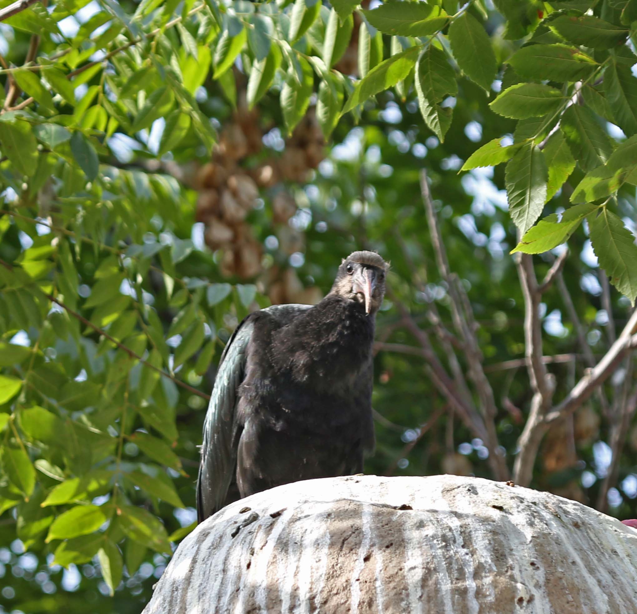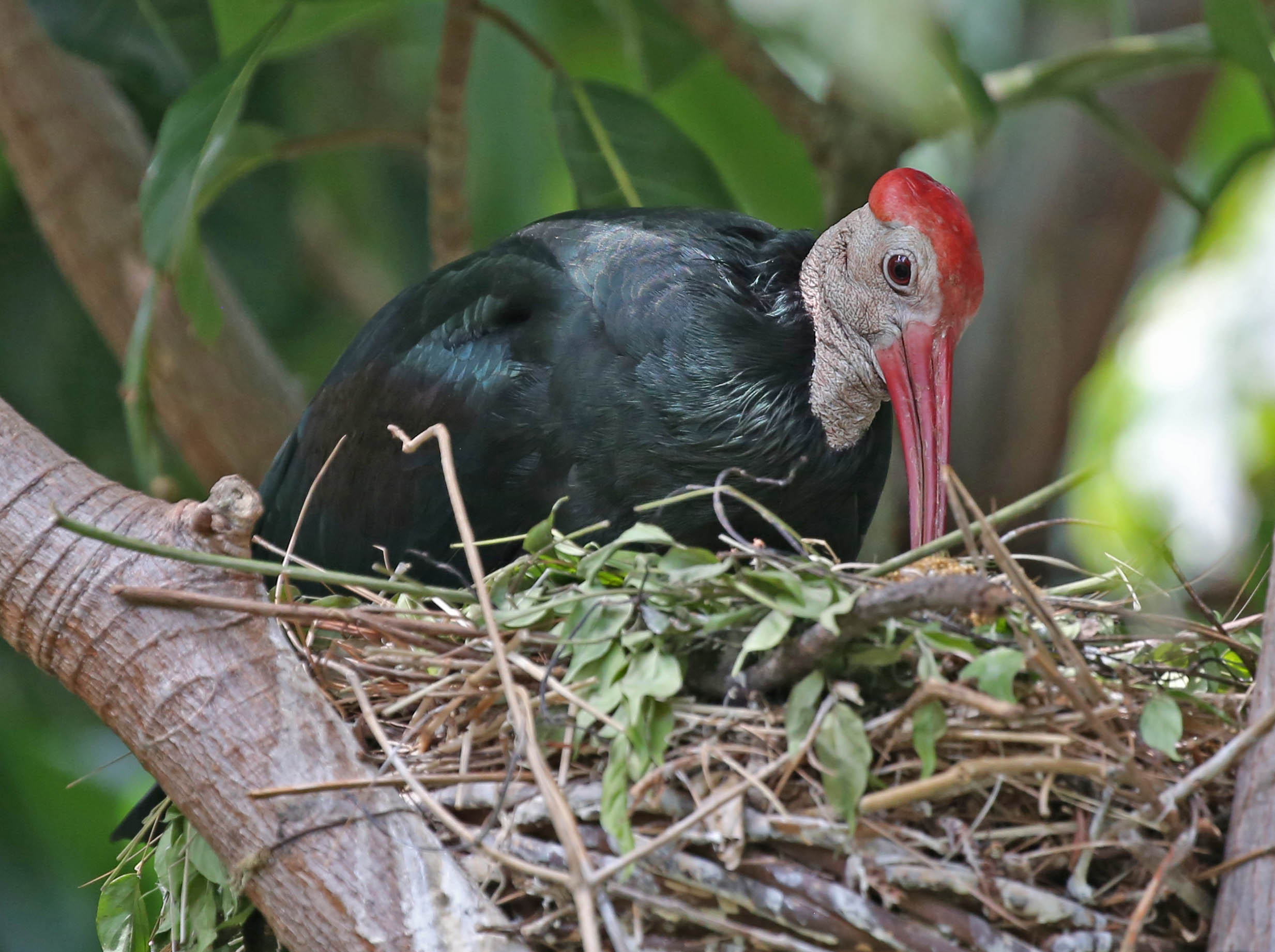The Southern Bald Ibis is found in southern Africa. They prefer open grassland or semi-desert. They are large, glossy blue-black with a coppery patch on wings. They have a bald red head with white face, a long, red, decurved bill and red legs and feet.