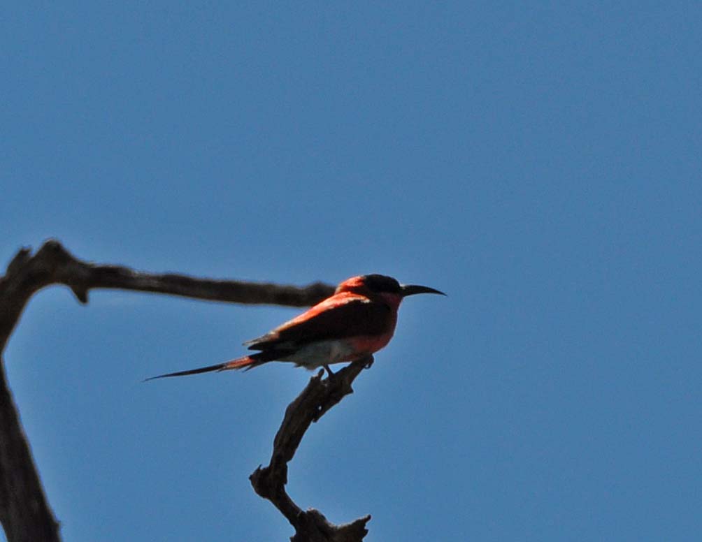 The Southern Carmine Bee-eater is found in sub-equatorial Africa. The sexes are similar. They are a socialable species and gather in large flocks both in and out of breeding season. The above length does not include the streamers on their tail which can range from 9.5-12 cm more.