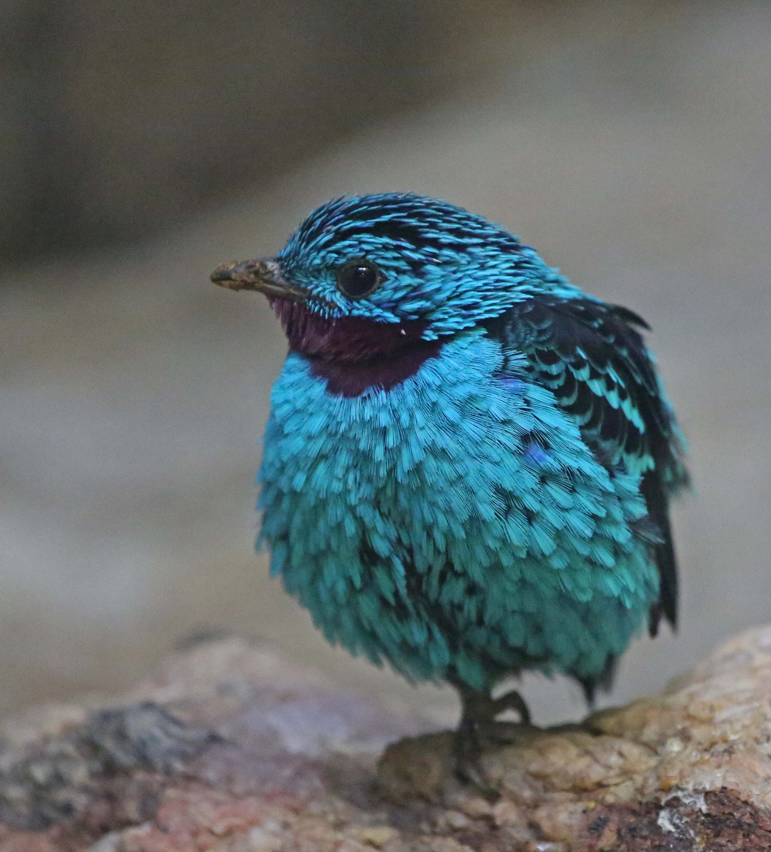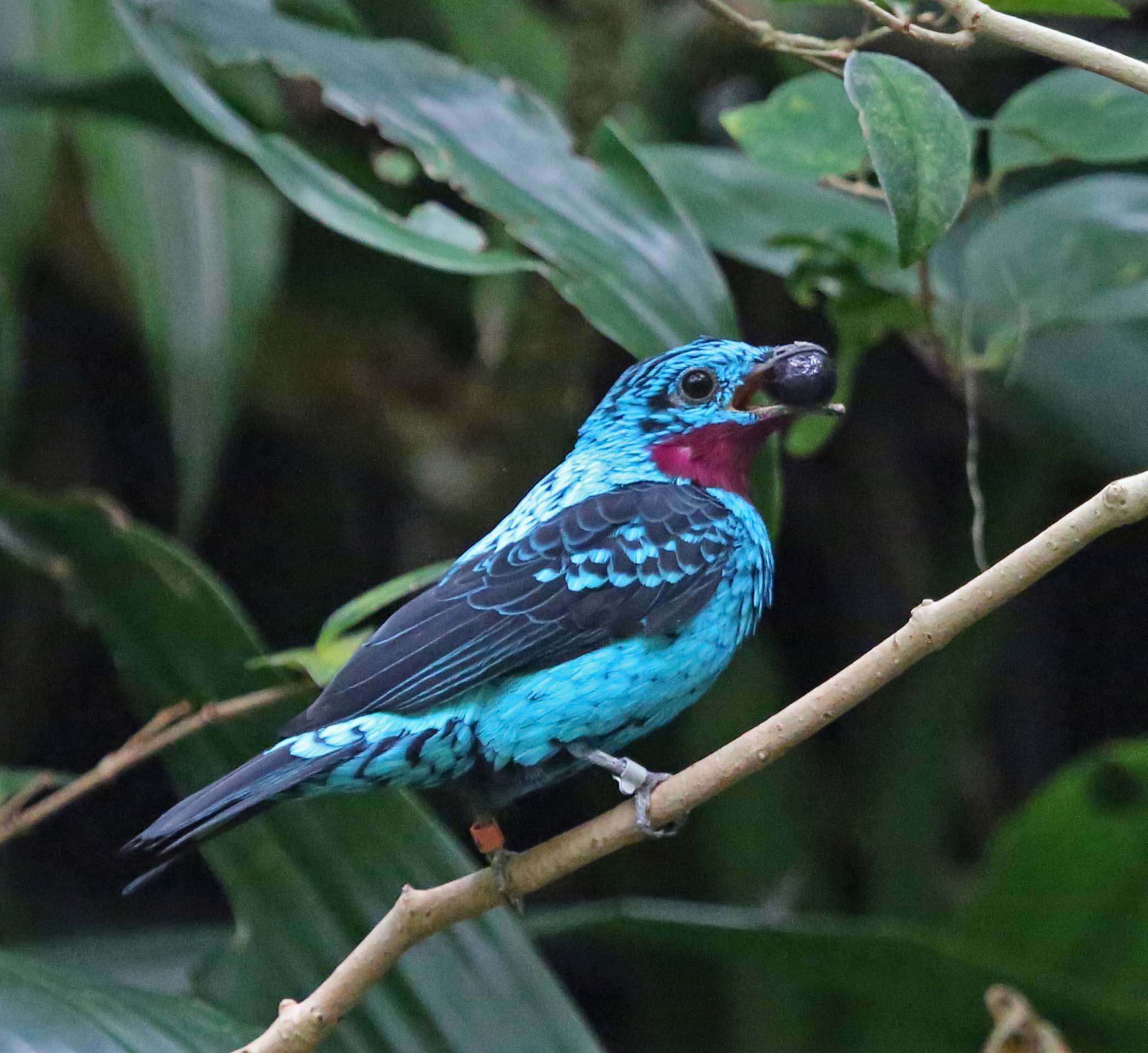 The Spangled Cotinga is found in the Amazon rainforest in South America. They mostly eat fruit but will also eat insects. To attract the female, the male makes display flights, sings while erecting crown, back feathers and tail.