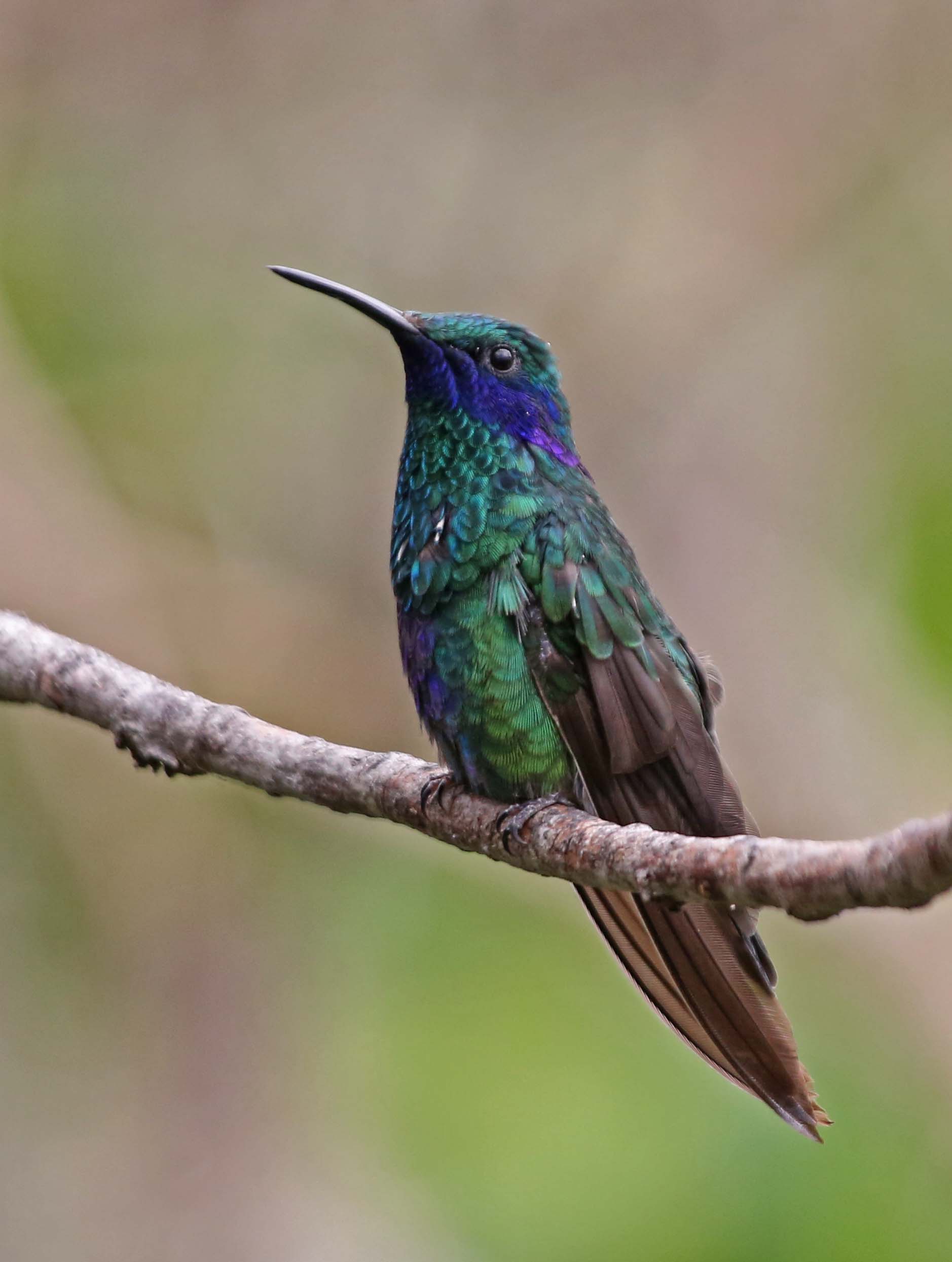 The Sparkling Violet-ear is a large hummingbird found in the highlands of northern and western South America. They are solitary birds and defend their territory by singing. Males and females look alike. Their diet is mostly nectar but will also eat small spiders and insects, especially during the breeding season.