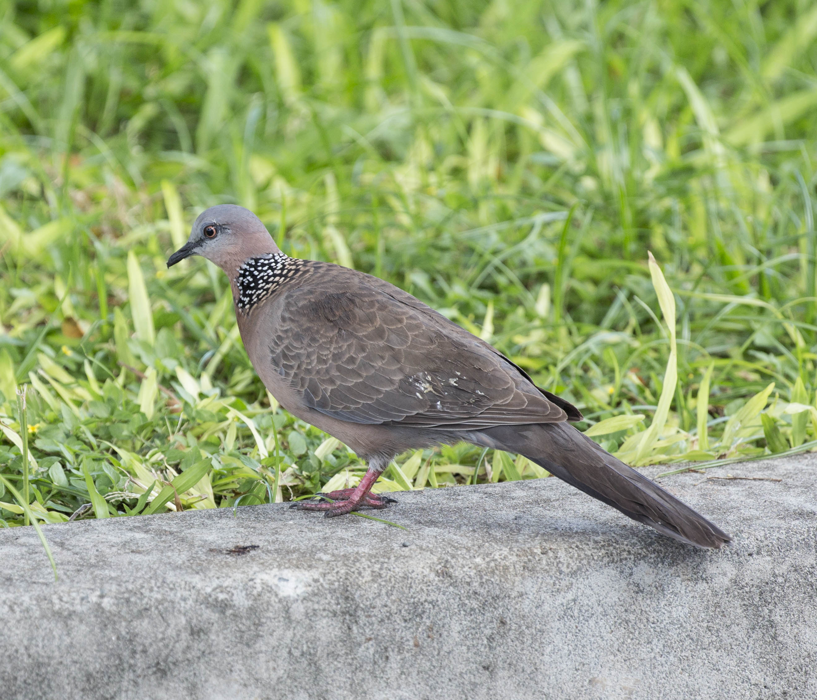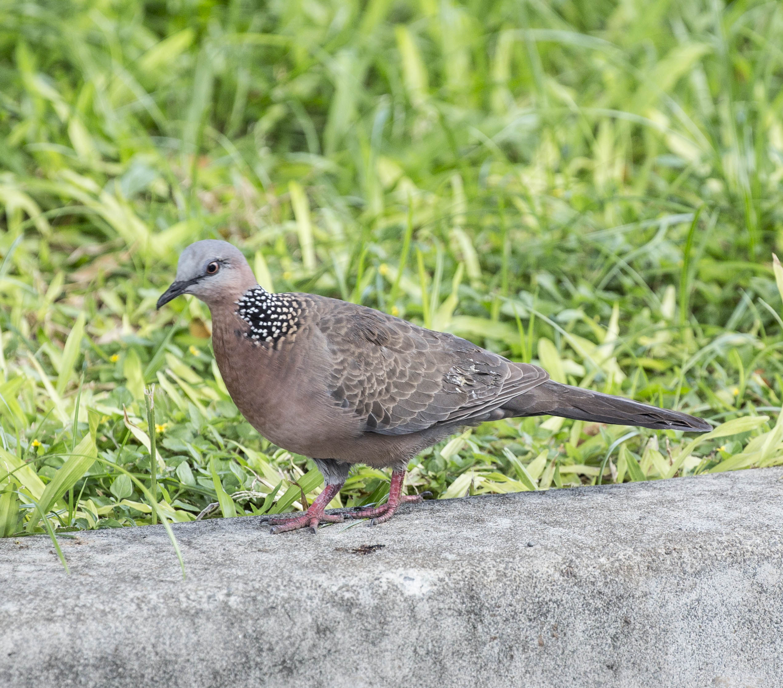 The Spotted Dove is native to the Indian Subcontinent and Southeast Asia. They have been introduced to most of the rest of the world. The sexes are similar but there is a lot of variation among the species. Its white spots on black make it easy to identify.