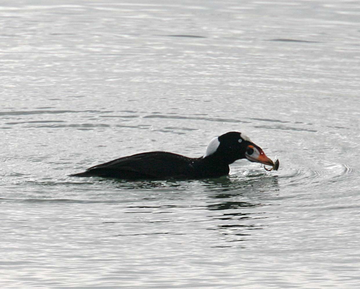 Surf Scoters eat mostly Aquatic Invertebrates and fish. They eat lesser quantities of green plant matter. Scoters breed in Canada and Alaska and are a winter visitor to the Bay area.
