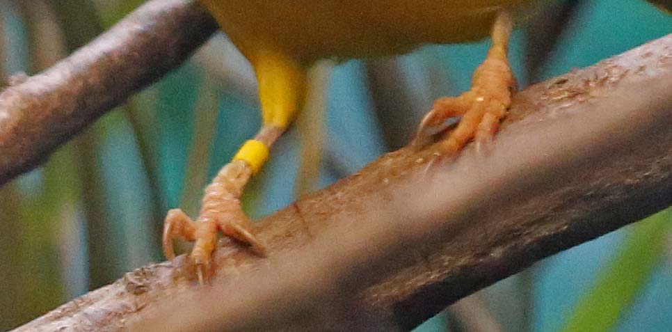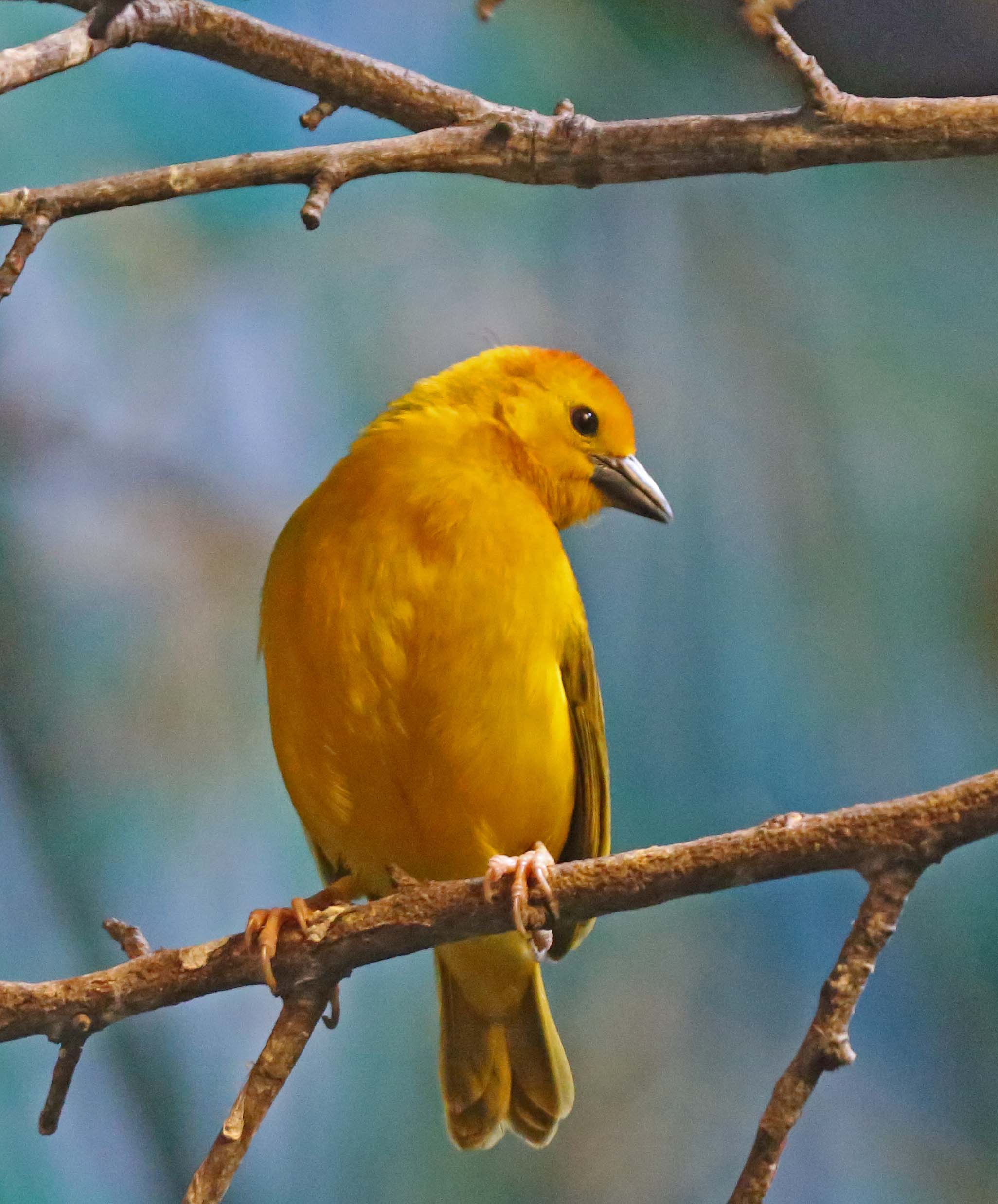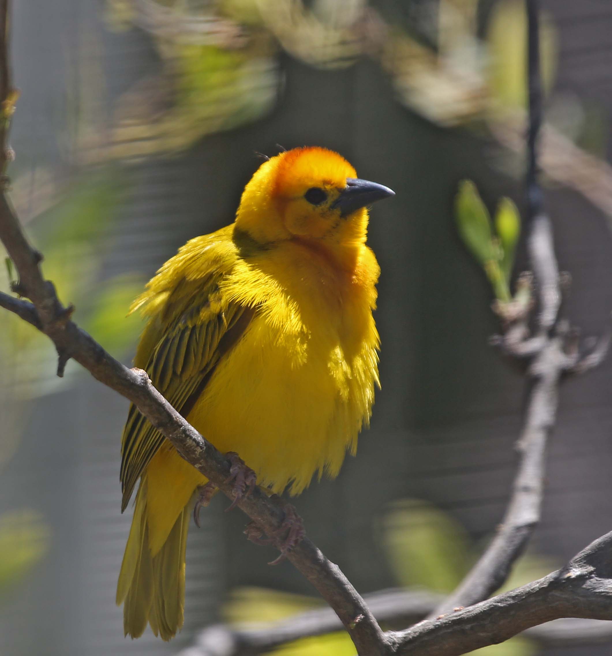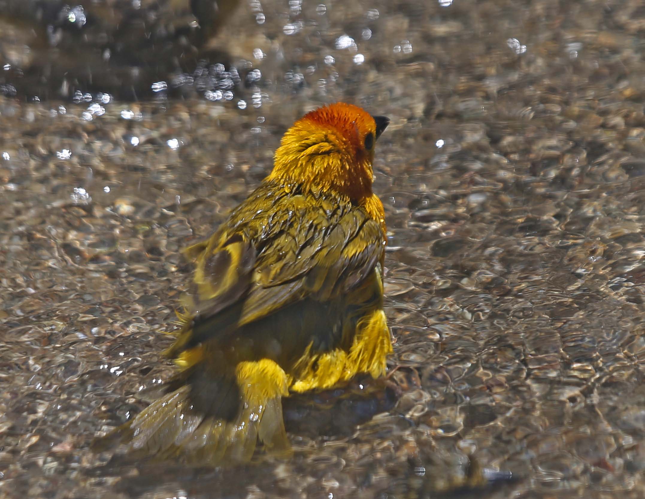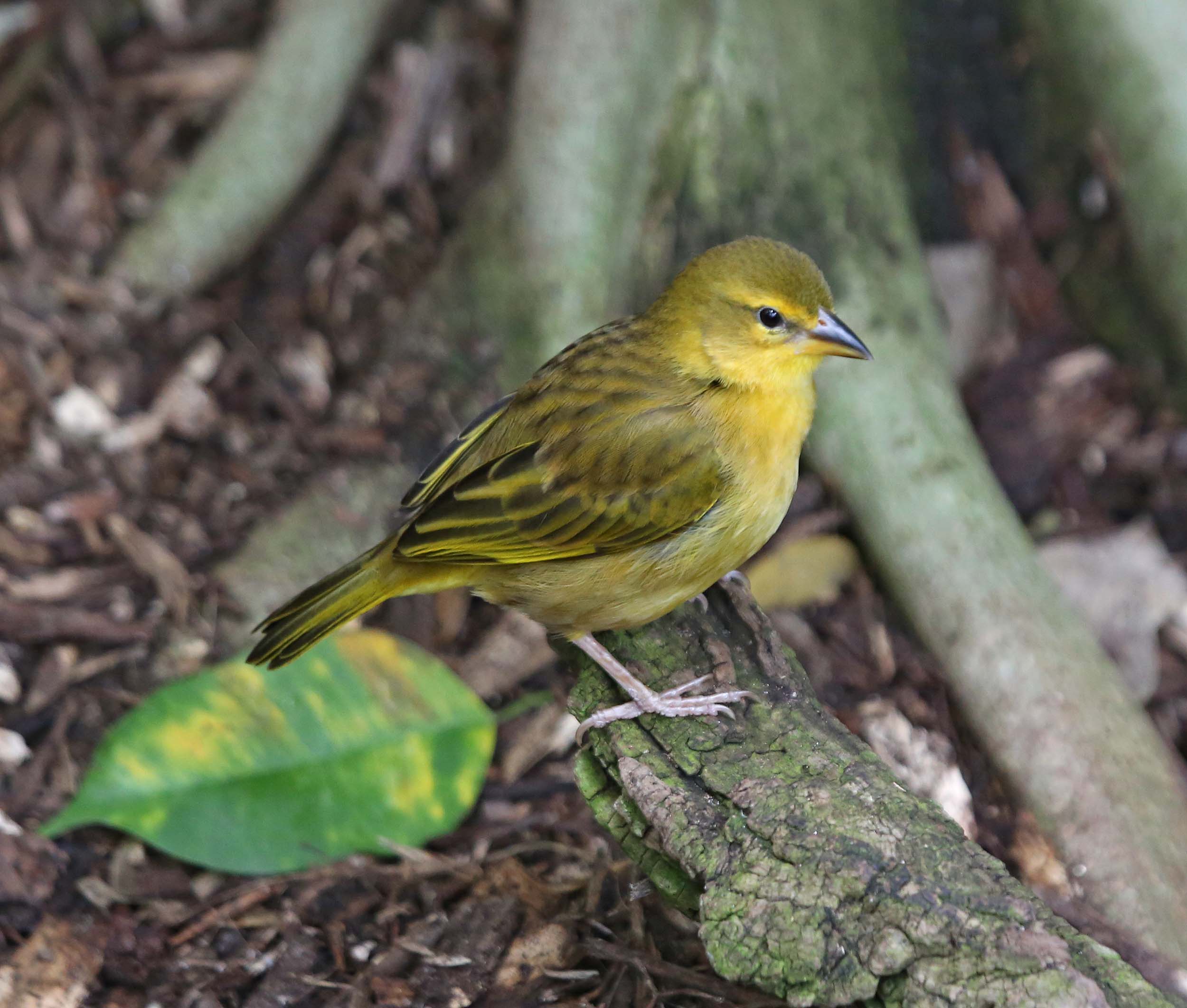 The Taveta Golden Weaver, or Taveta Weaver, is found in Kenya and Tanzania. The sexes are dimorphic (have different plumage). The male is a mostly a bright golden yellow, the head has a reddish ring of various width around it, the bill is black and the feet and legs are pinkish. Females are more of an olive color with pale streaks.