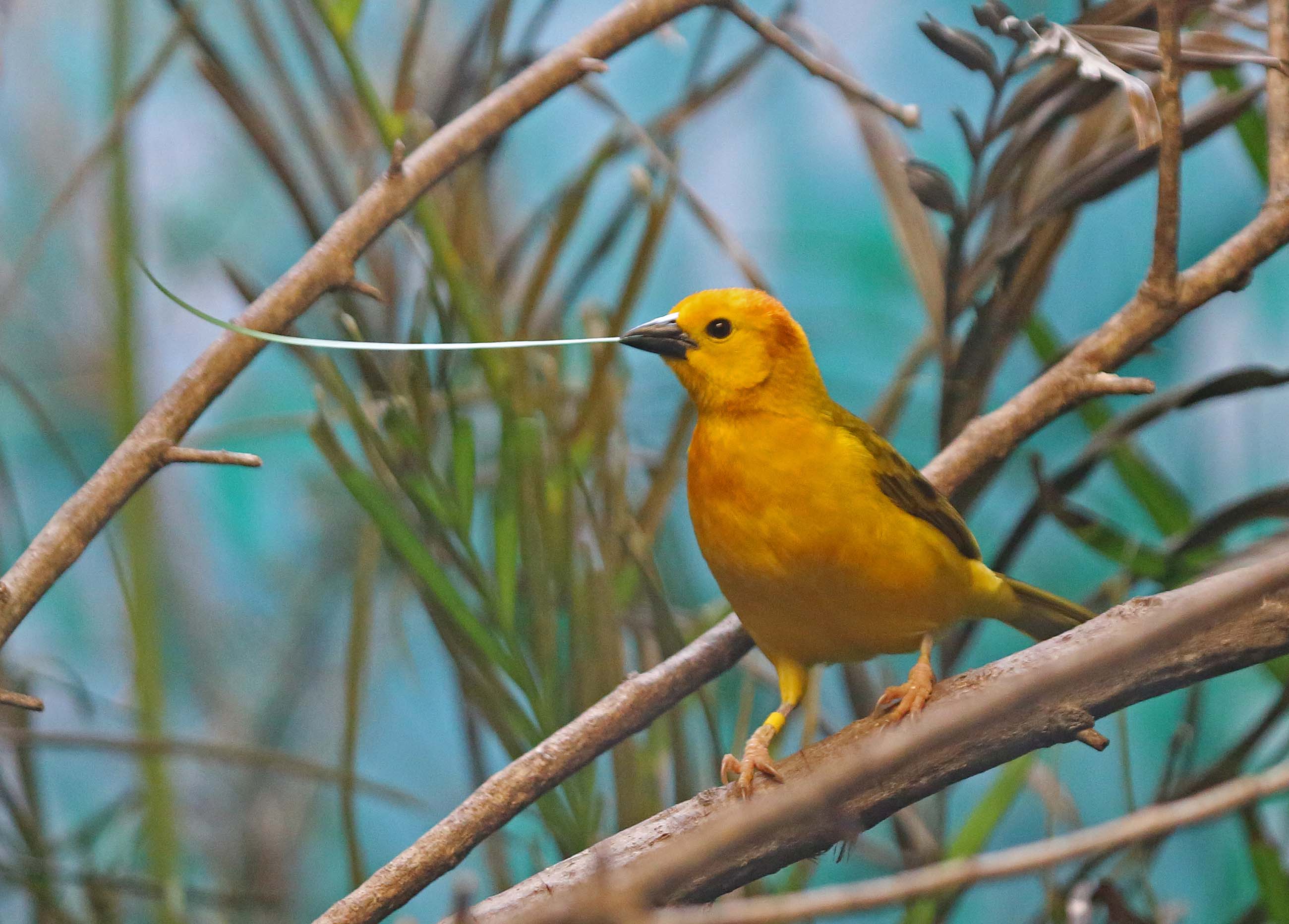 Taveta Golden Weavers live in large colonies and the male builds an oval nest over water. The nests are woven from stems of reeds and grasses. Their diet includes seeds, some corn and grasses.