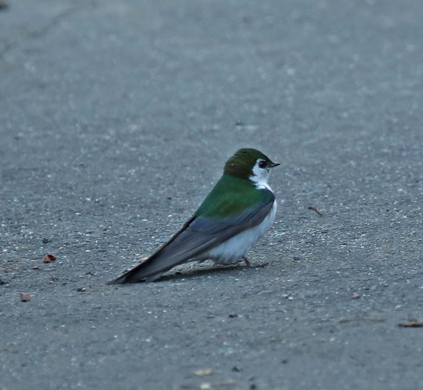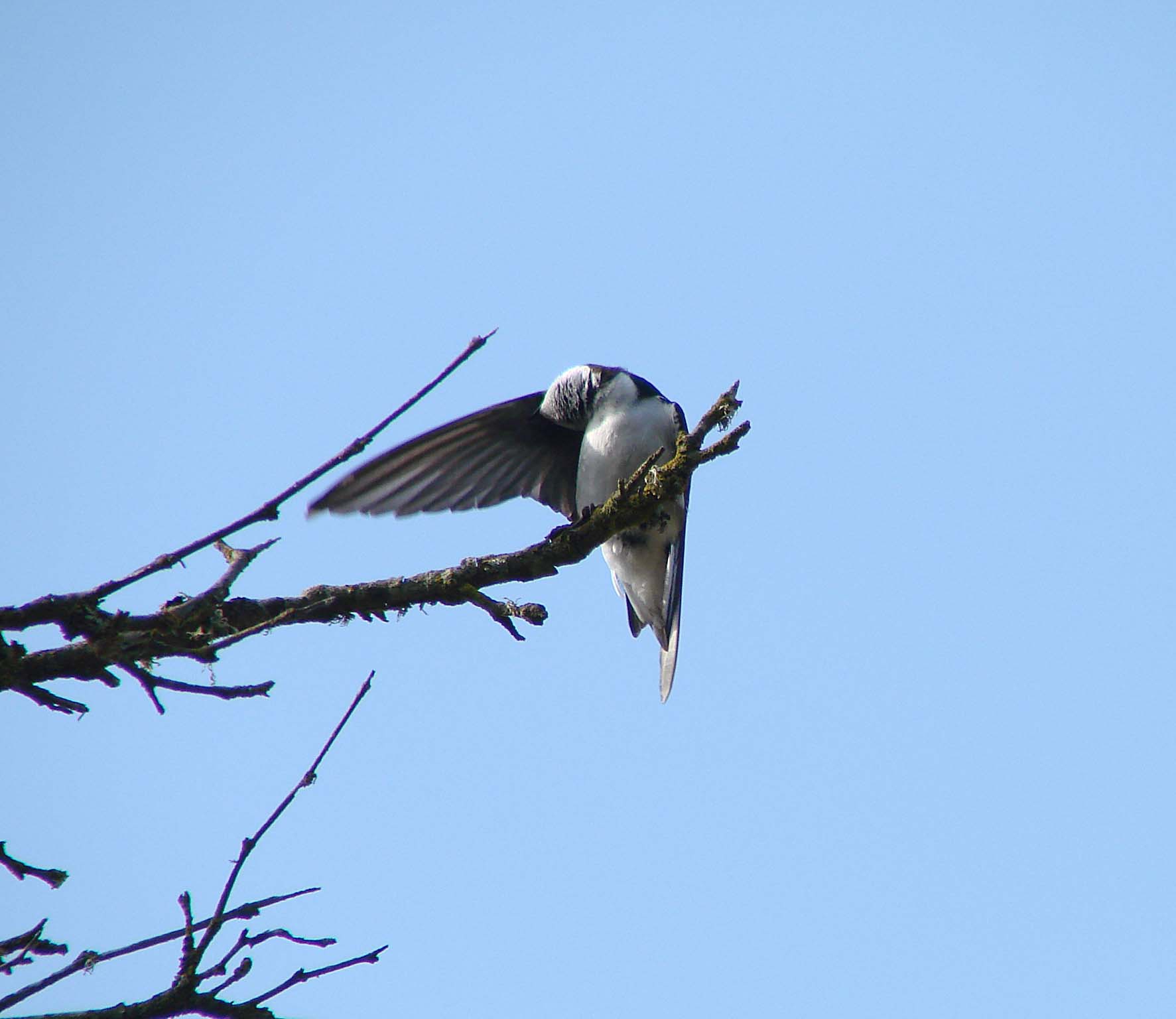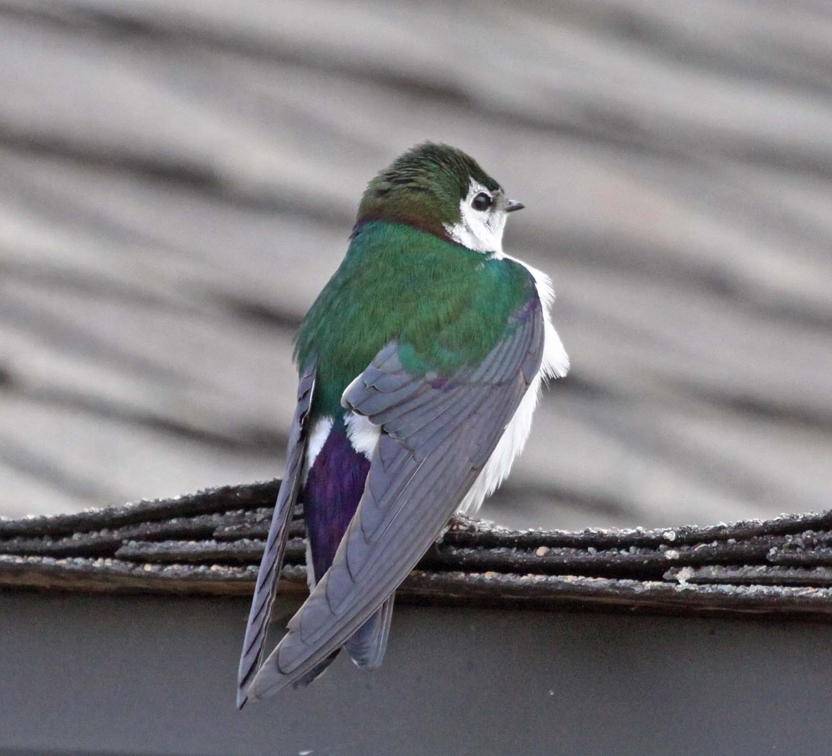 The Violet-green Swallow breeds in western North American from Alaska to Mexico. They winter in Central and northern South America. They nest in cavities in trees or rocks. They are insect eaters.