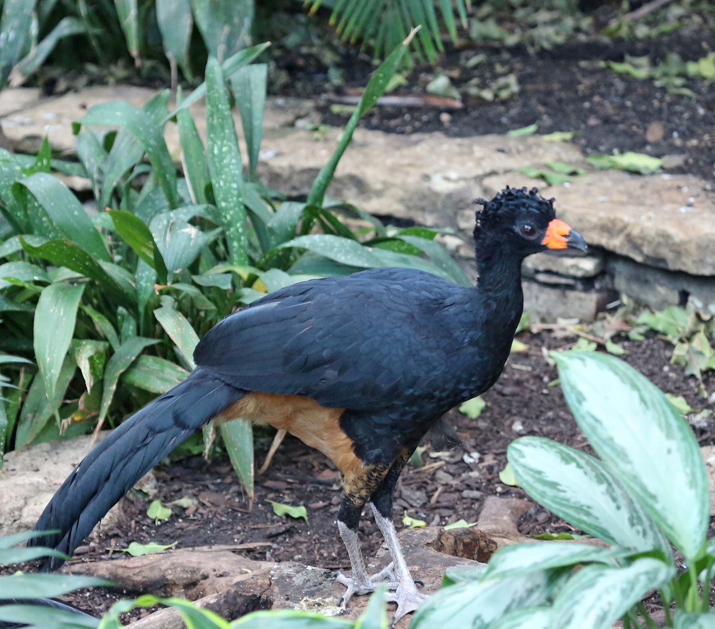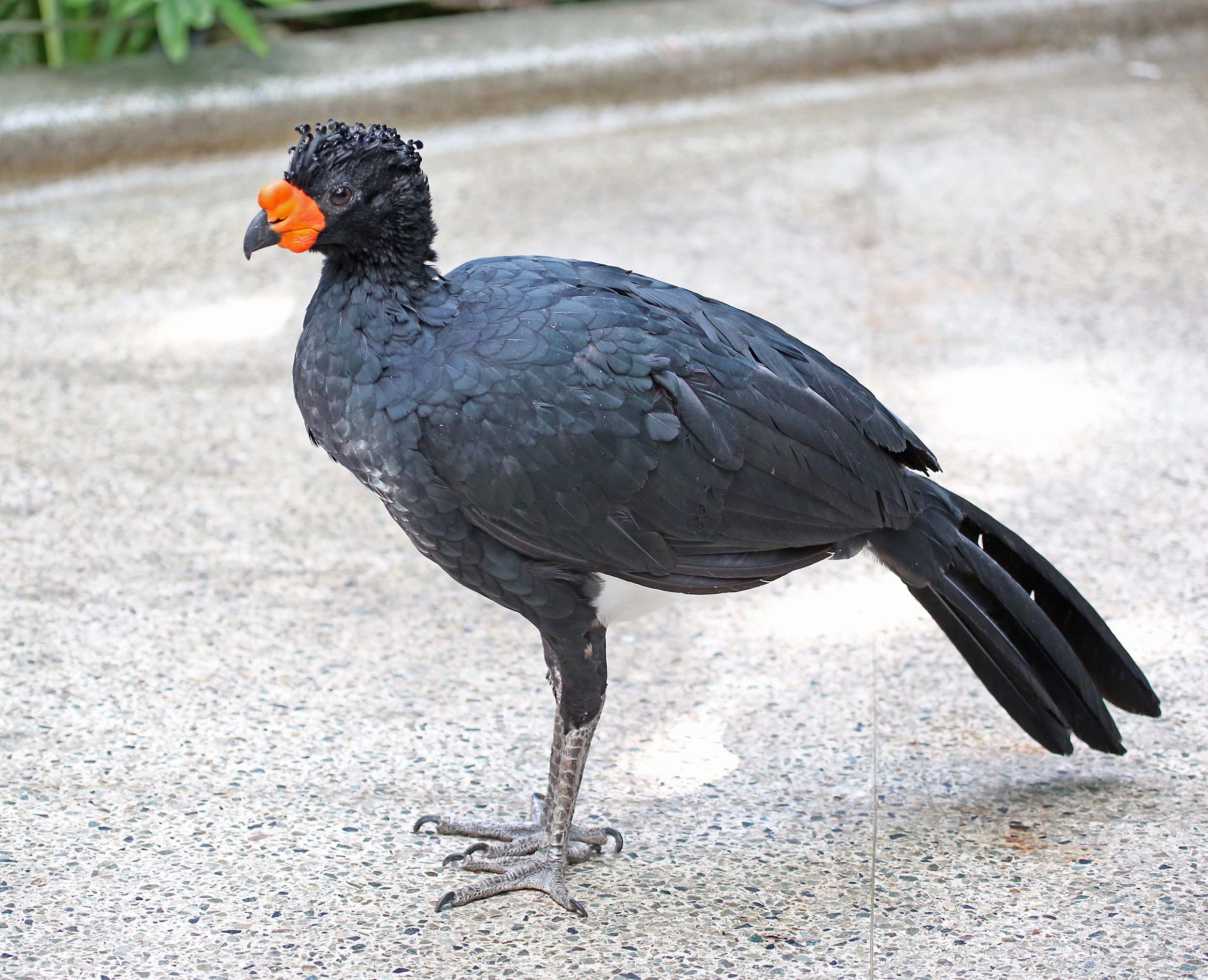 The Wattled Curassow is found in the western Amazon Basin rainforests of South America. Males are mostly black except for the area between the legs and tail which is white. The crest is curled and a round red knob is found above the bill and a red wattle is found below the bill. Females are also black but the area between the legs and tail is rufous. They lack the bill knob and wattle but their bill is red with a black tip.