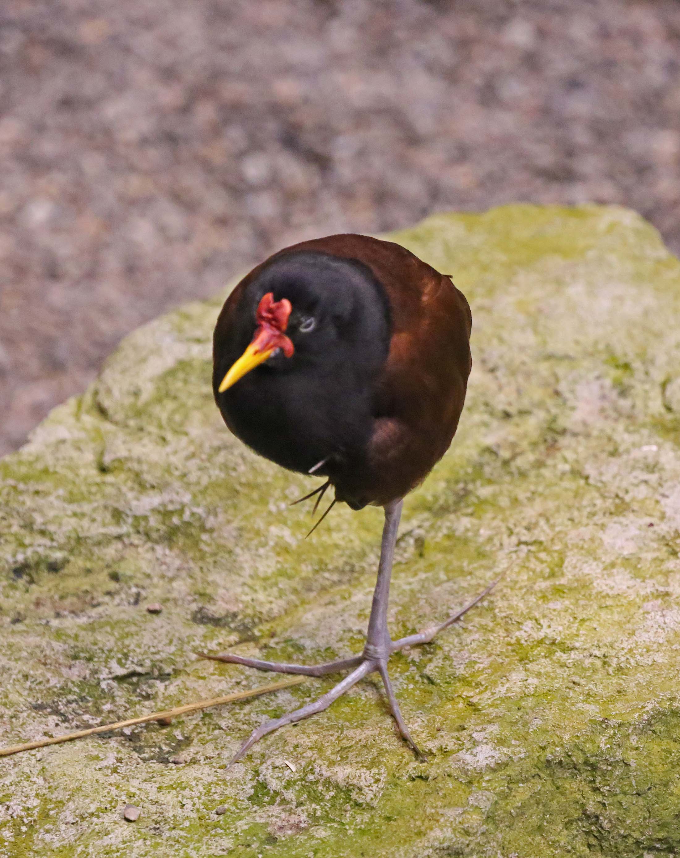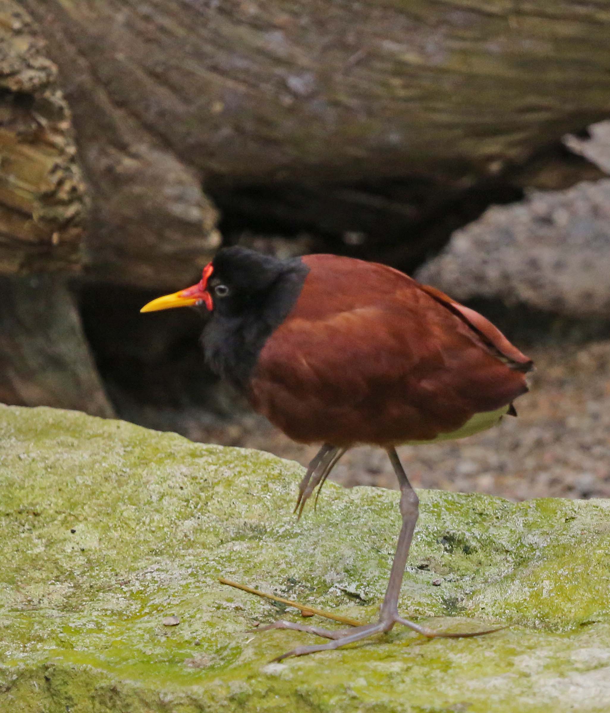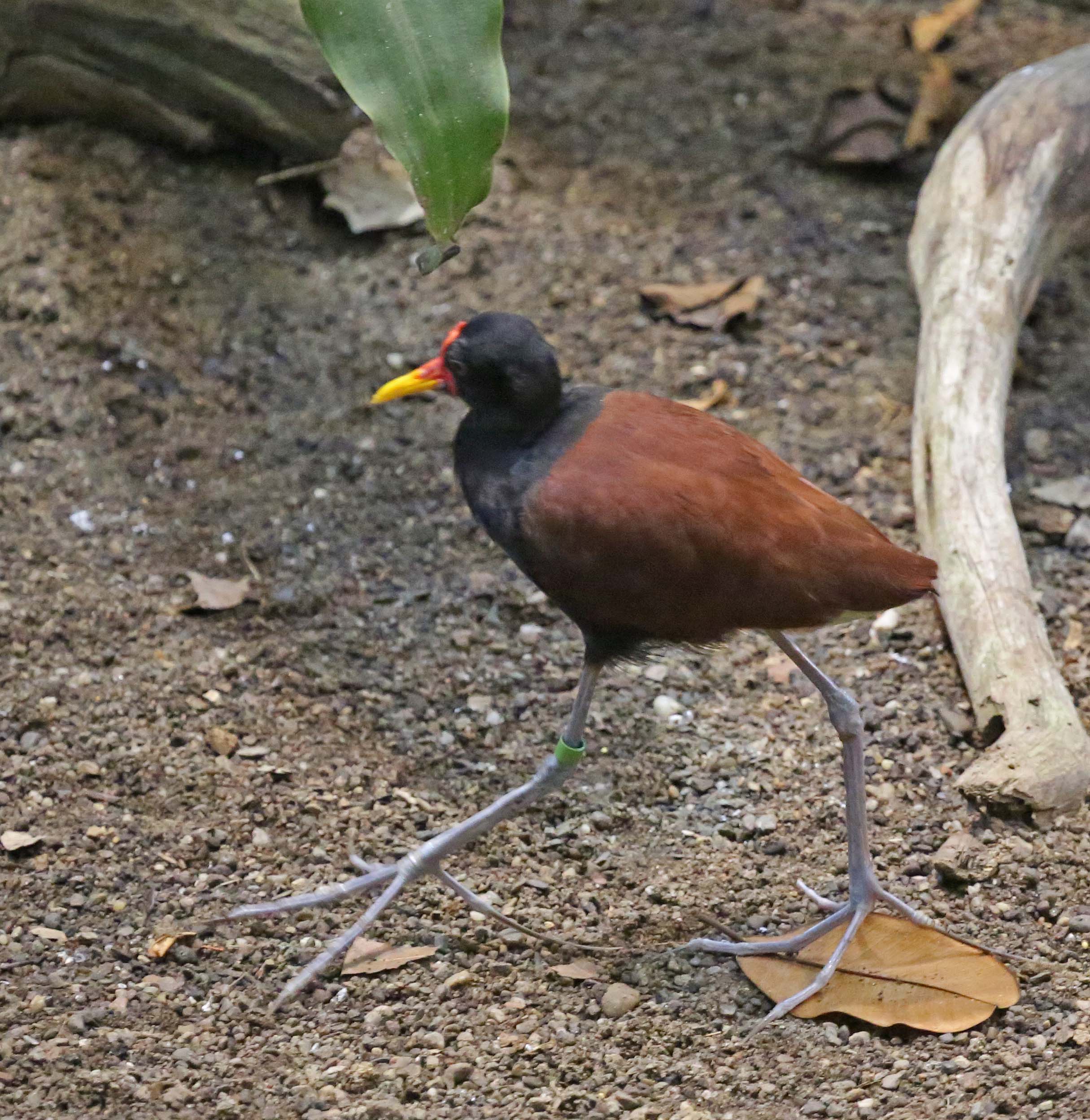 The Wattled Jacana is found in most of South America east of the Andes. Their large feet allow them to walk on floating vegetation in shallow lakes. They eat insects and seed found on floating vegetation.