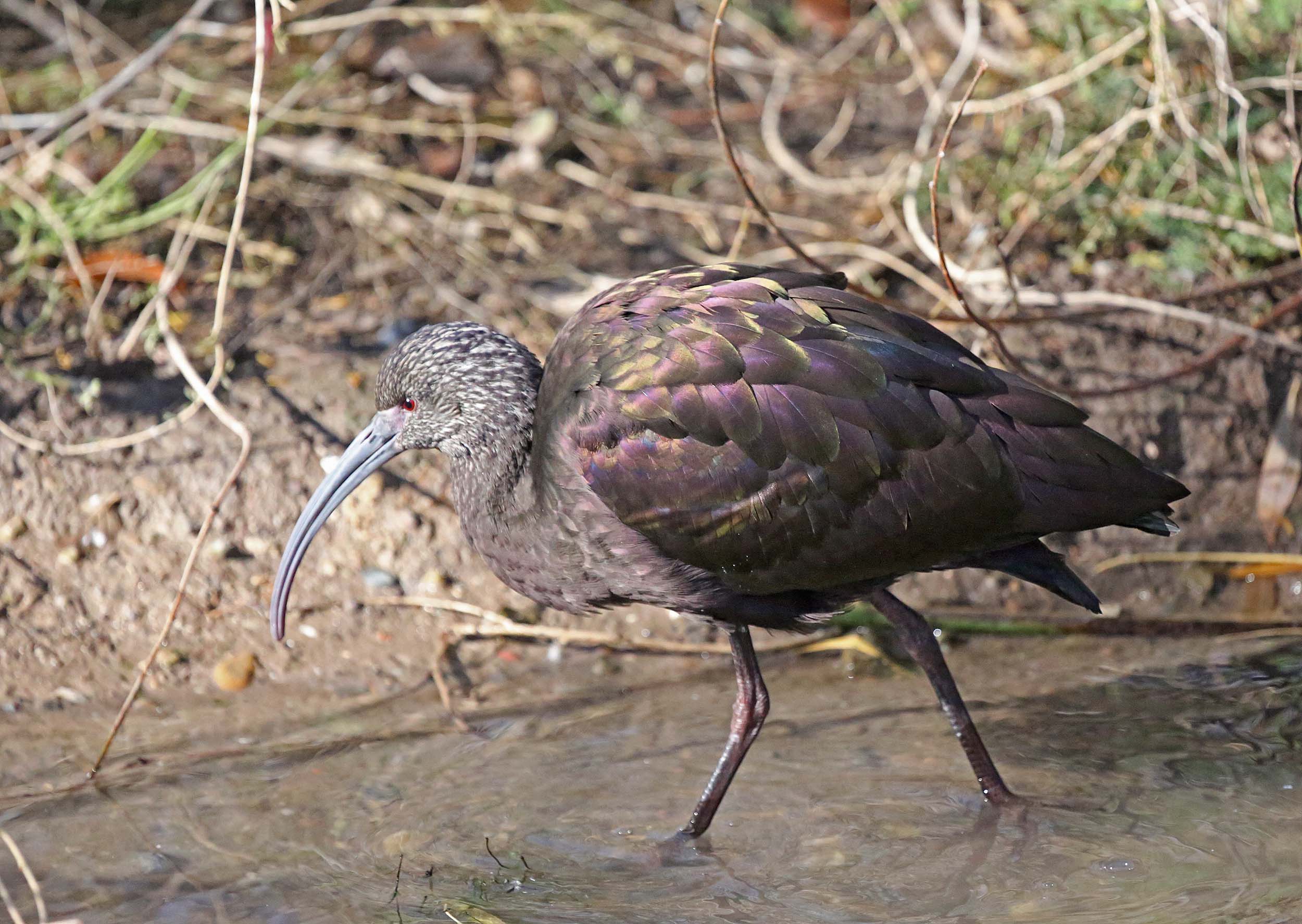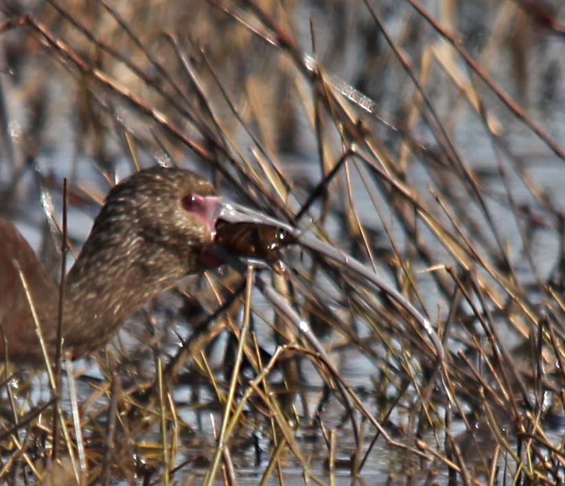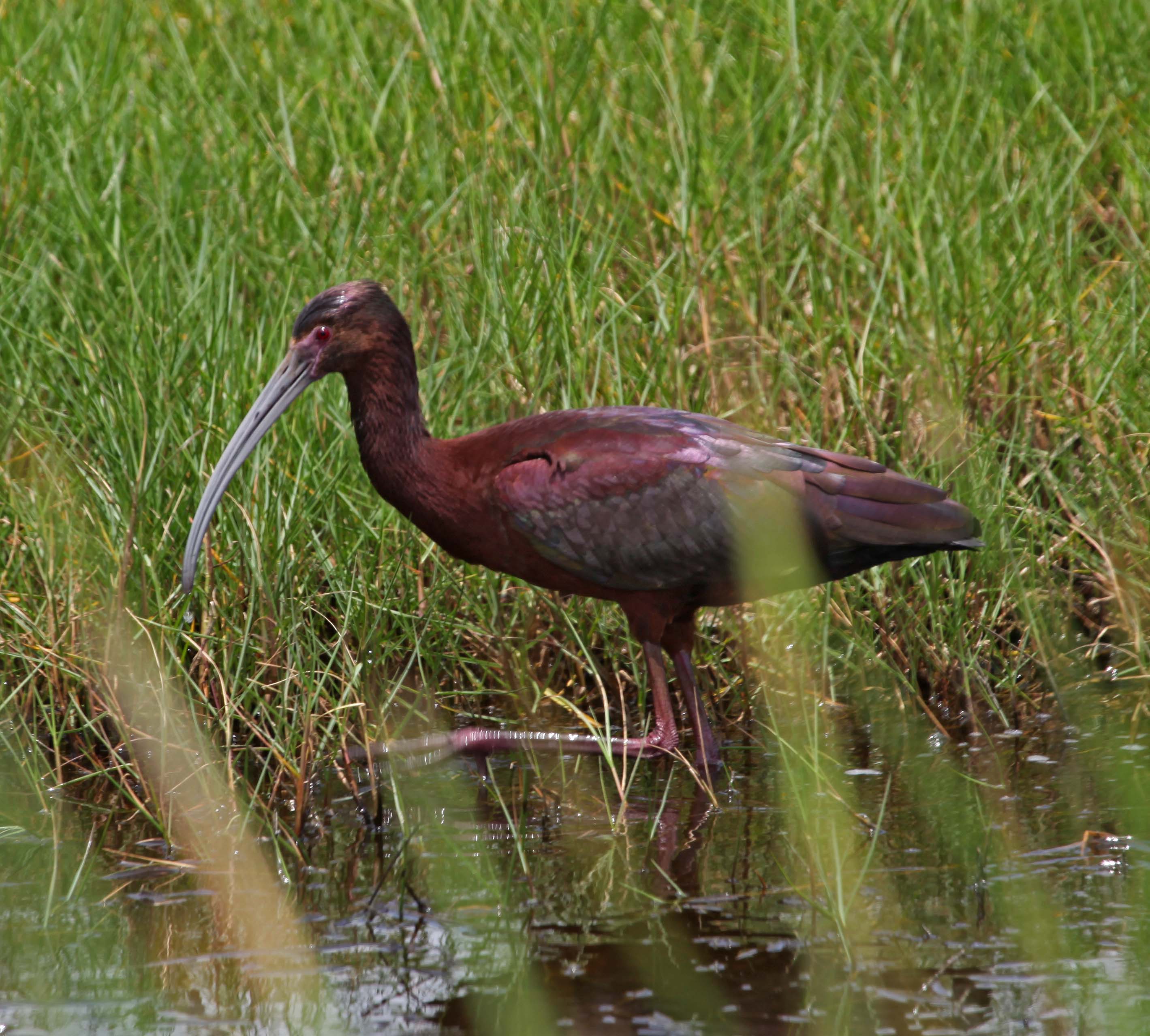 White-faced Ibis are found in western and central U.S., Mexico and southeast South America. They breed in marshes in bushes and low trees. Sexes are similar and they are chestnut-brown with a long de-curved bill and red eyes and legs. During breeding, they have a white band around their bare face. They eat insects, earthworms, fish, crayfish, and small mammals.