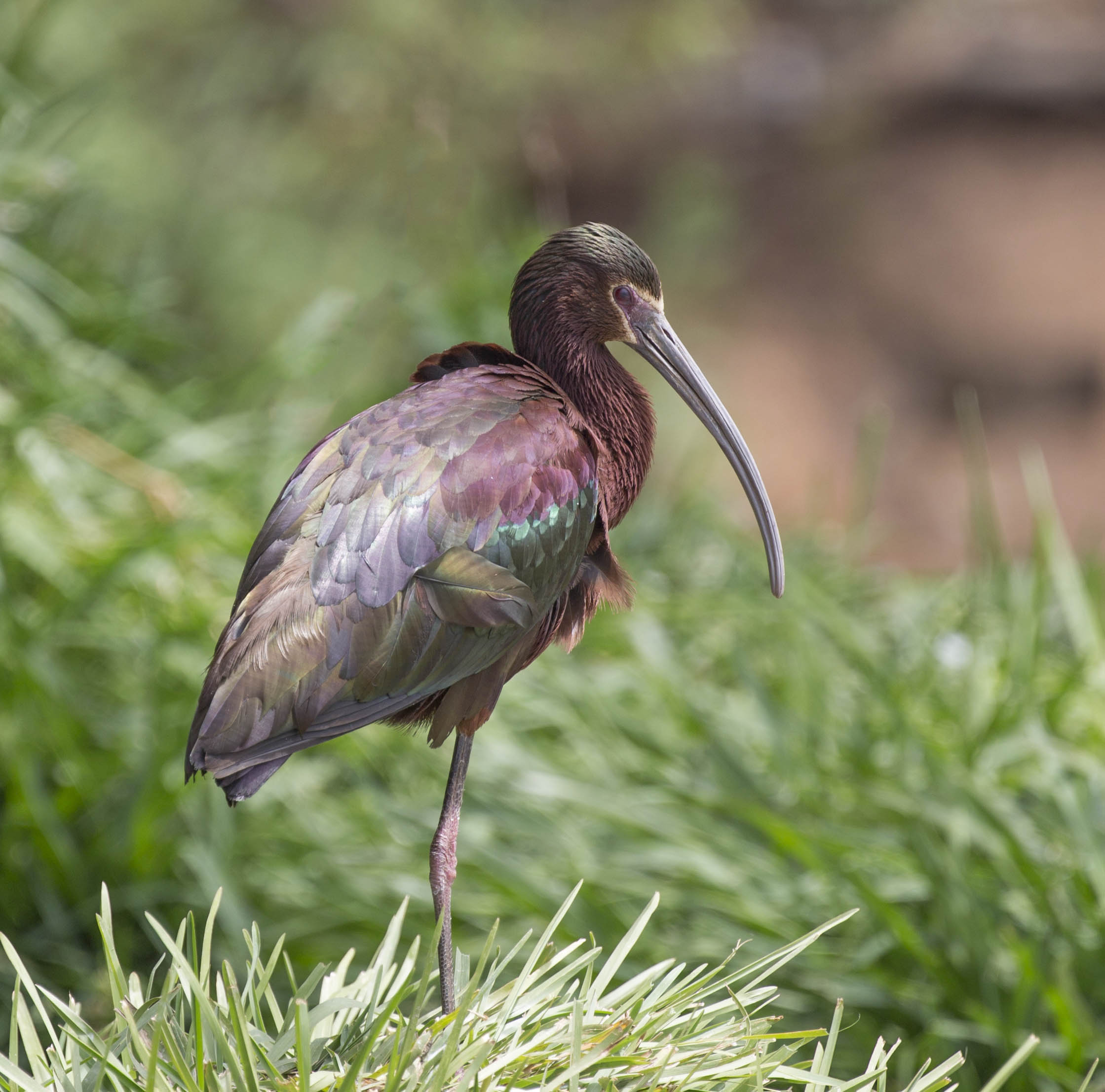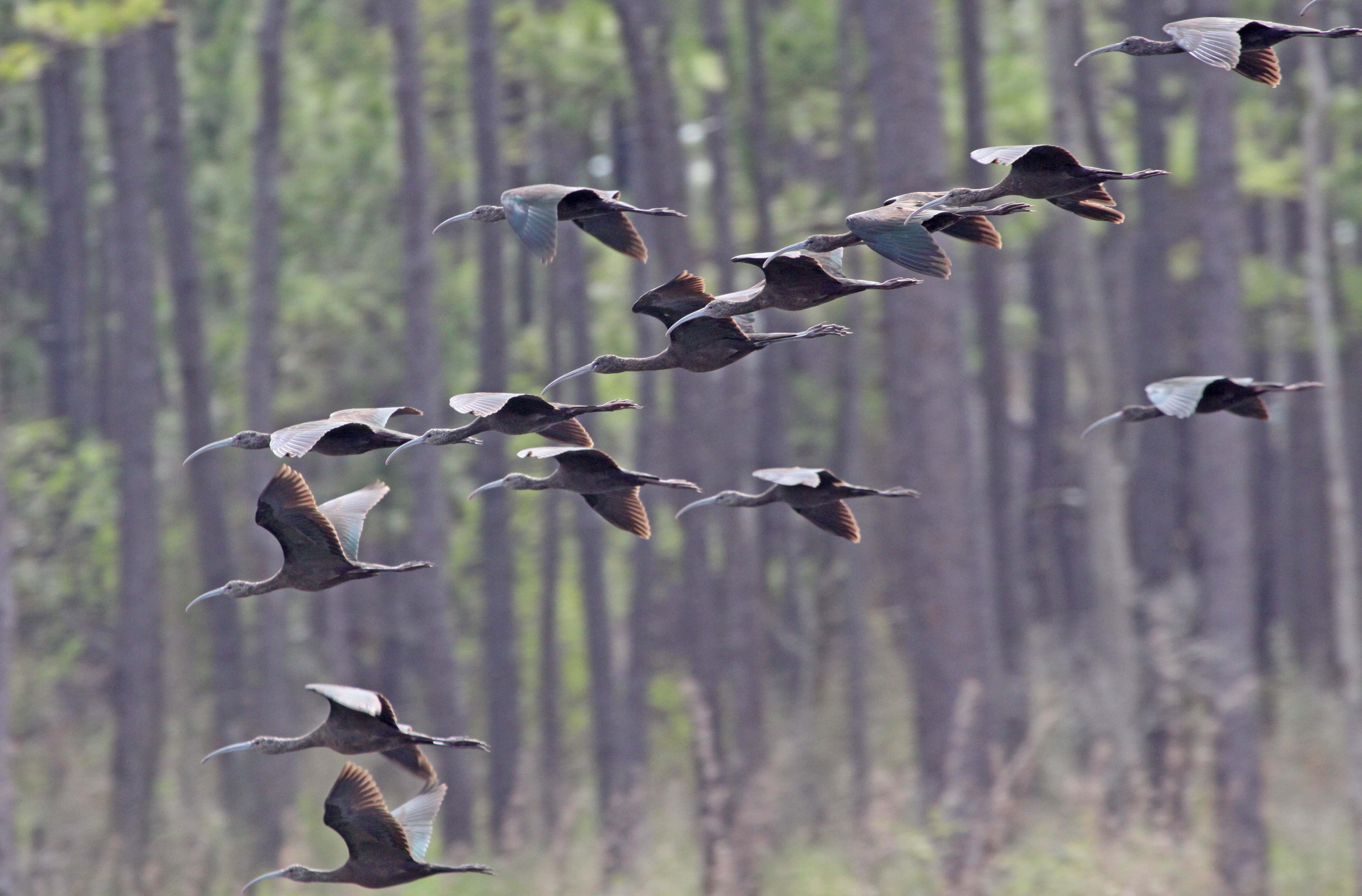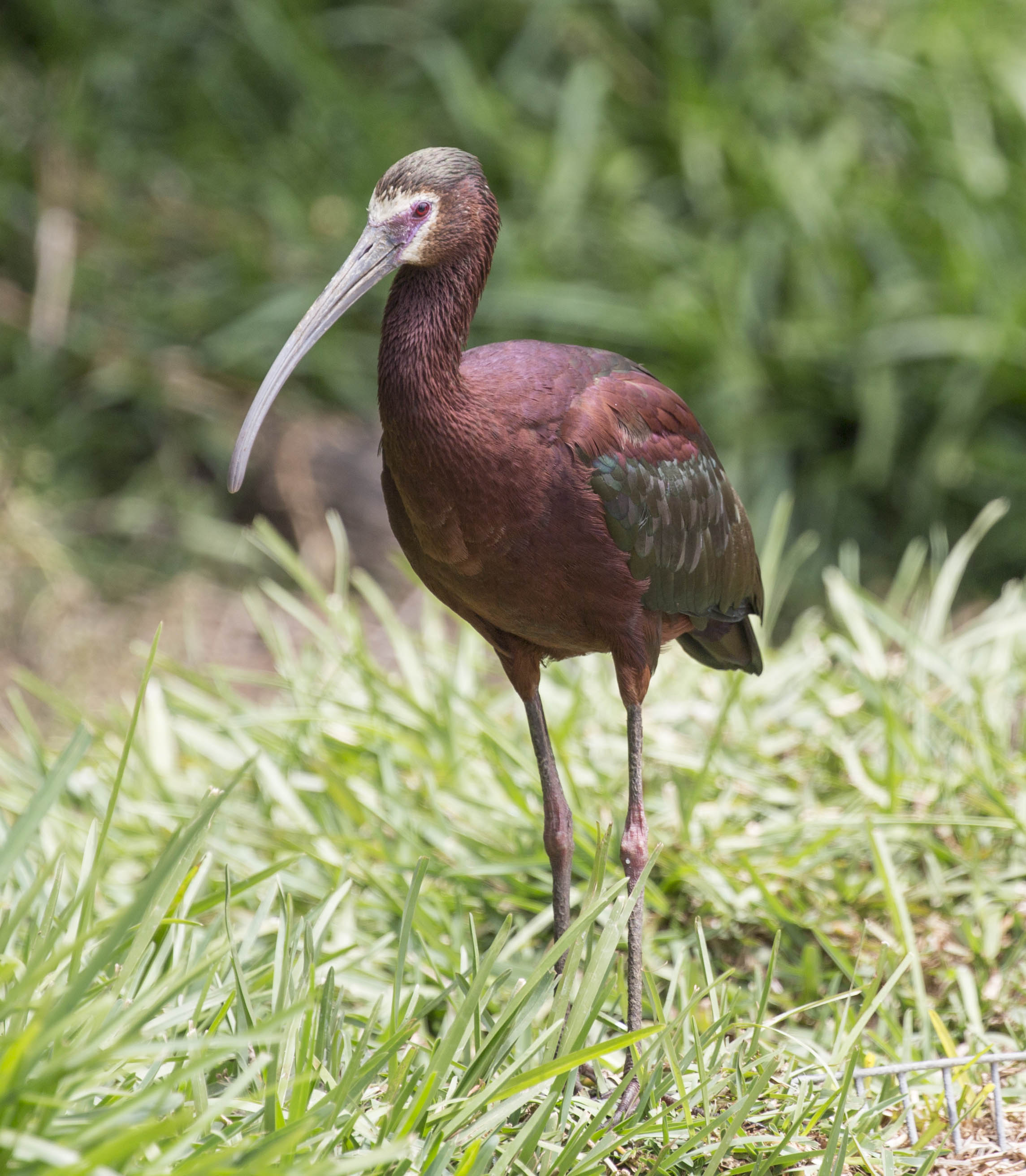 White-faced Ibis are found in western and central U.S., Mexico and southeast South America. They breed in marshes in bushes and low trees. Sexes are similar and they are chestnut-brown with a long de-curved bill and red eyes and legs. During breeding, they have a white band around their bare face. They eat insects, earthworms, fish, crayfish, and small mammals.