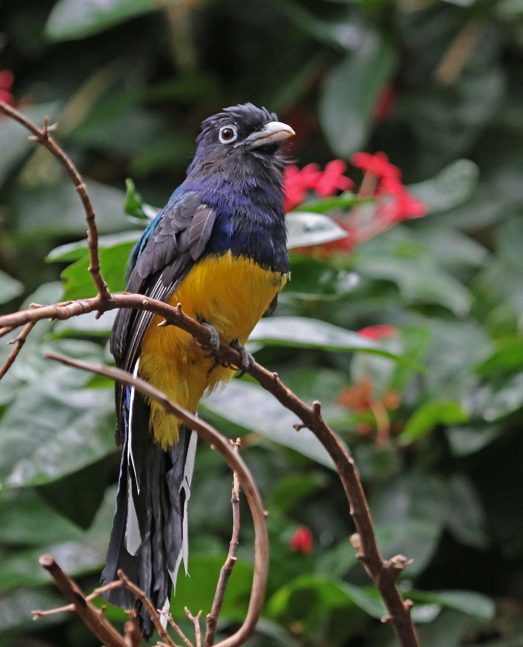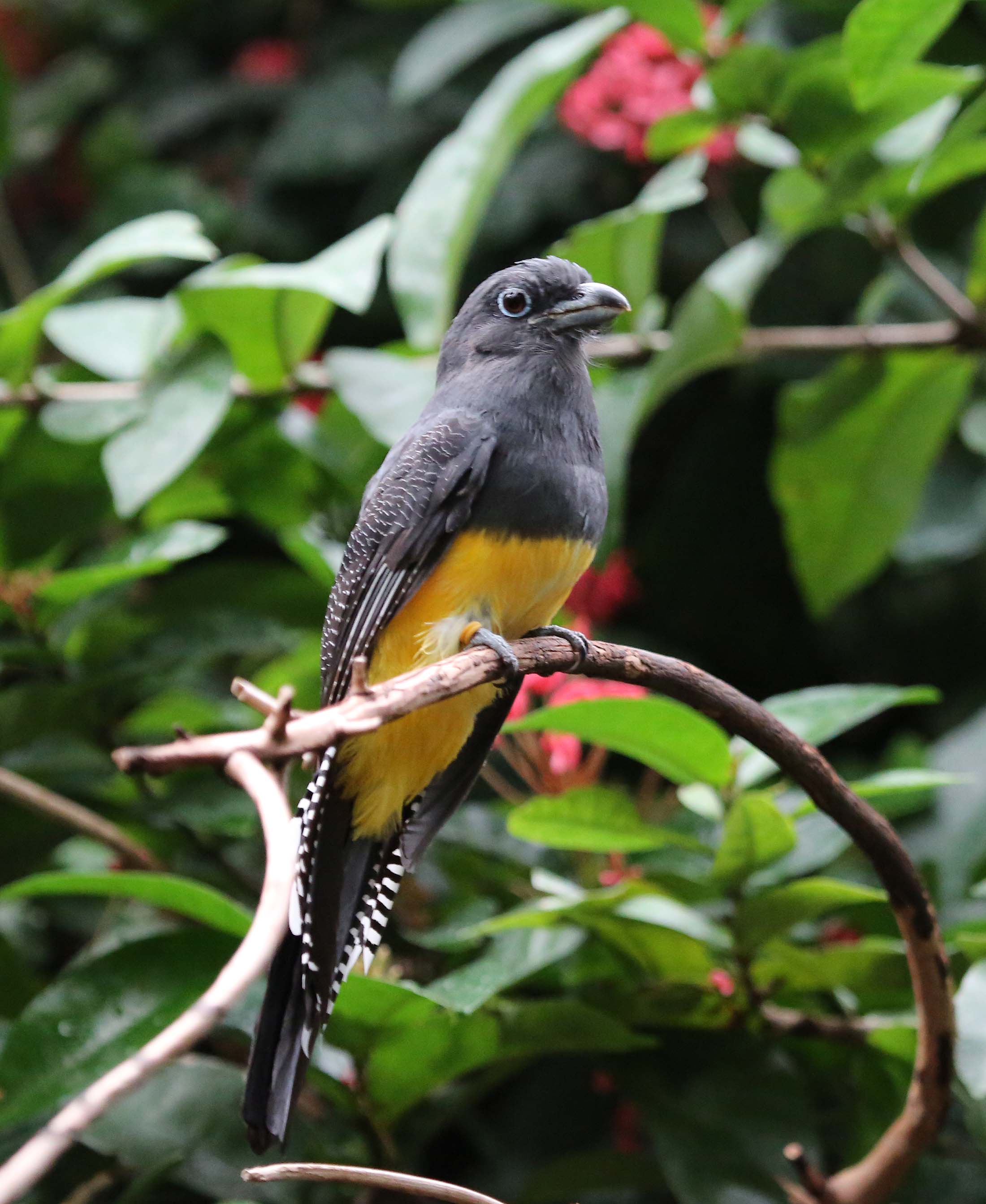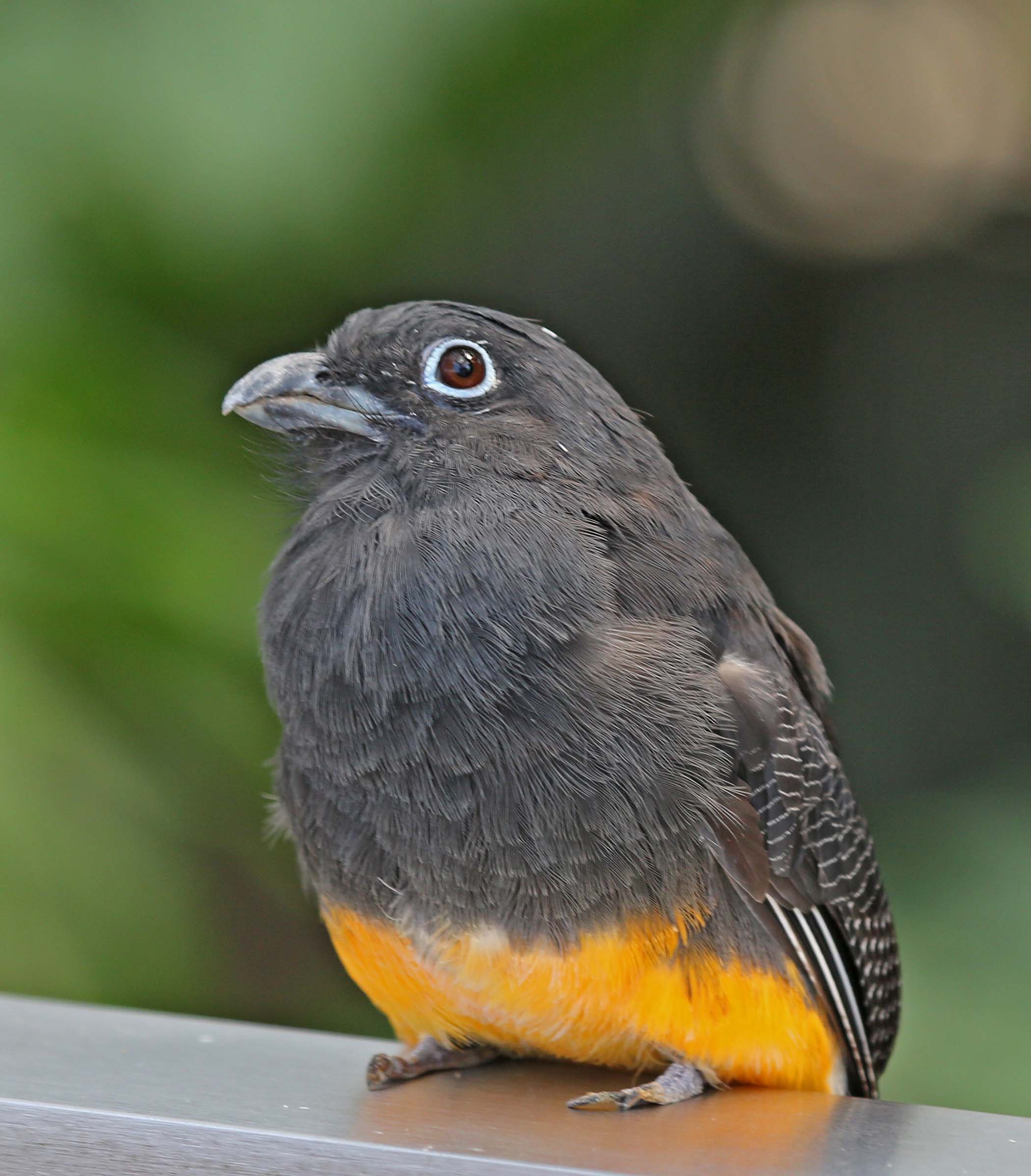The White-tailed Trogon is also known as the Western White-tailed Trogon. The White-tailed Trogon is sexually dimorphic. Males are black with a metallic green and blue wash over their black feathers. Their belly is orange-yellow and the undersides of their tail is mostly white. Female do not have the metallic green and blue wash and are more gray than black. Their tail is barred black and white. Both sexes have a pale blue eye-ring, reddish brown eyes, and gray bill, legs and feet.