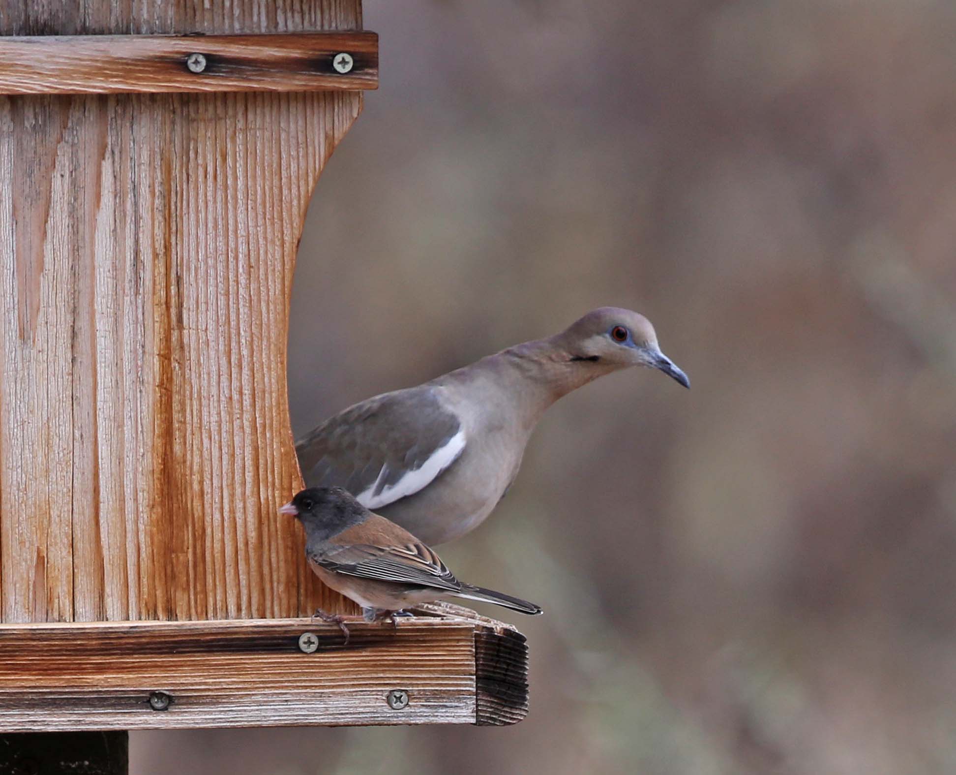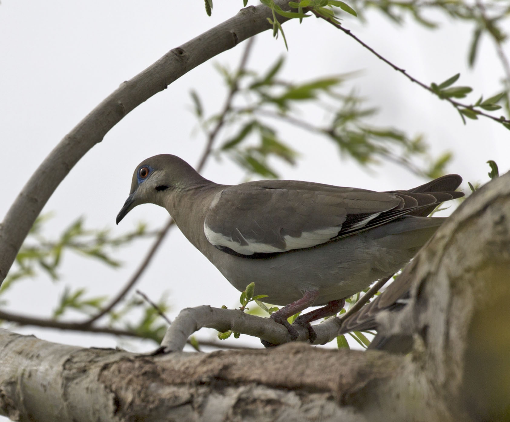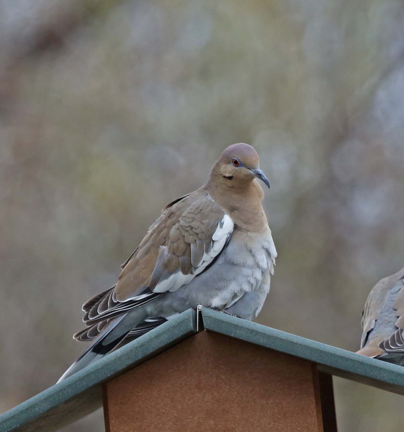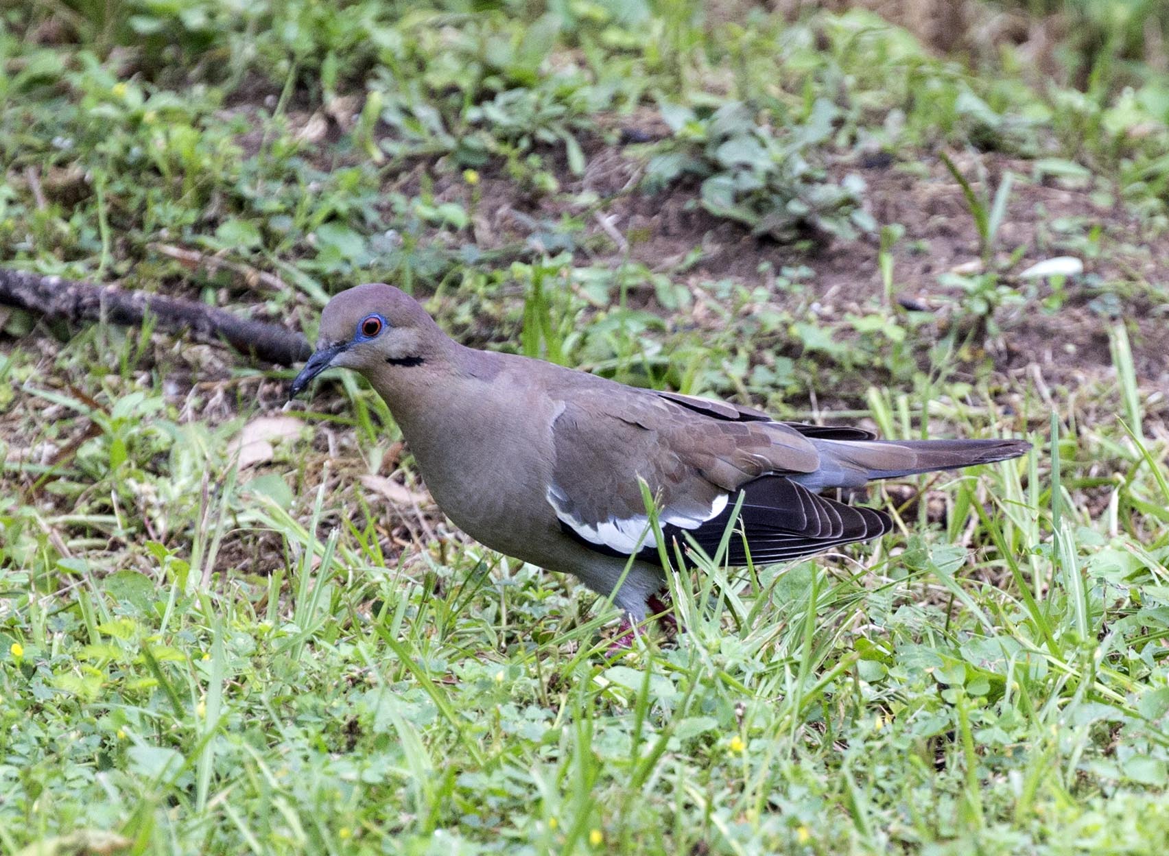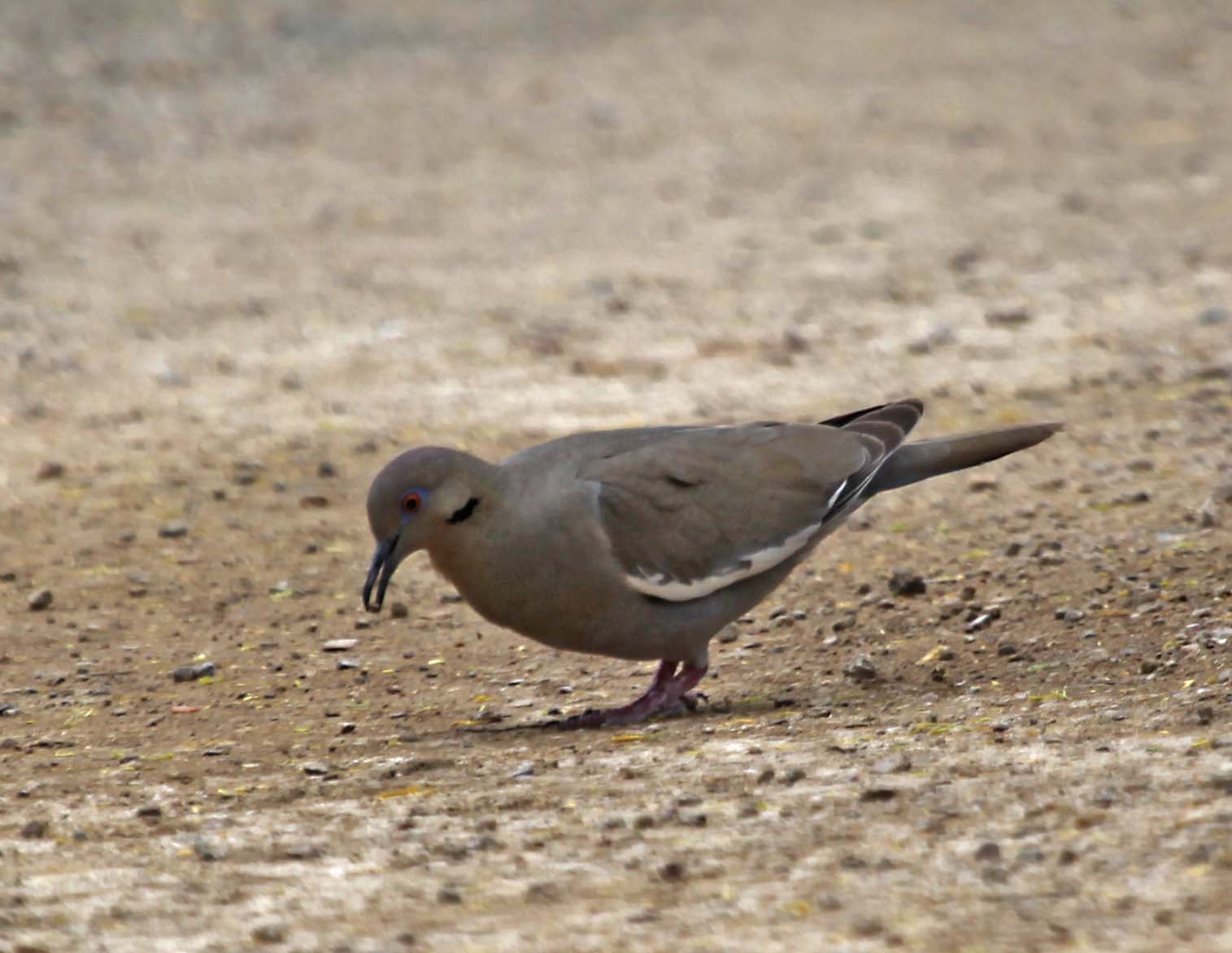 The White-winged Doves are found in the southwest U.S. and Mexico but are expanding their range north. The strip of white along their wing is very visible in flight and on the ground. They eat seeds, grains, and fruits.