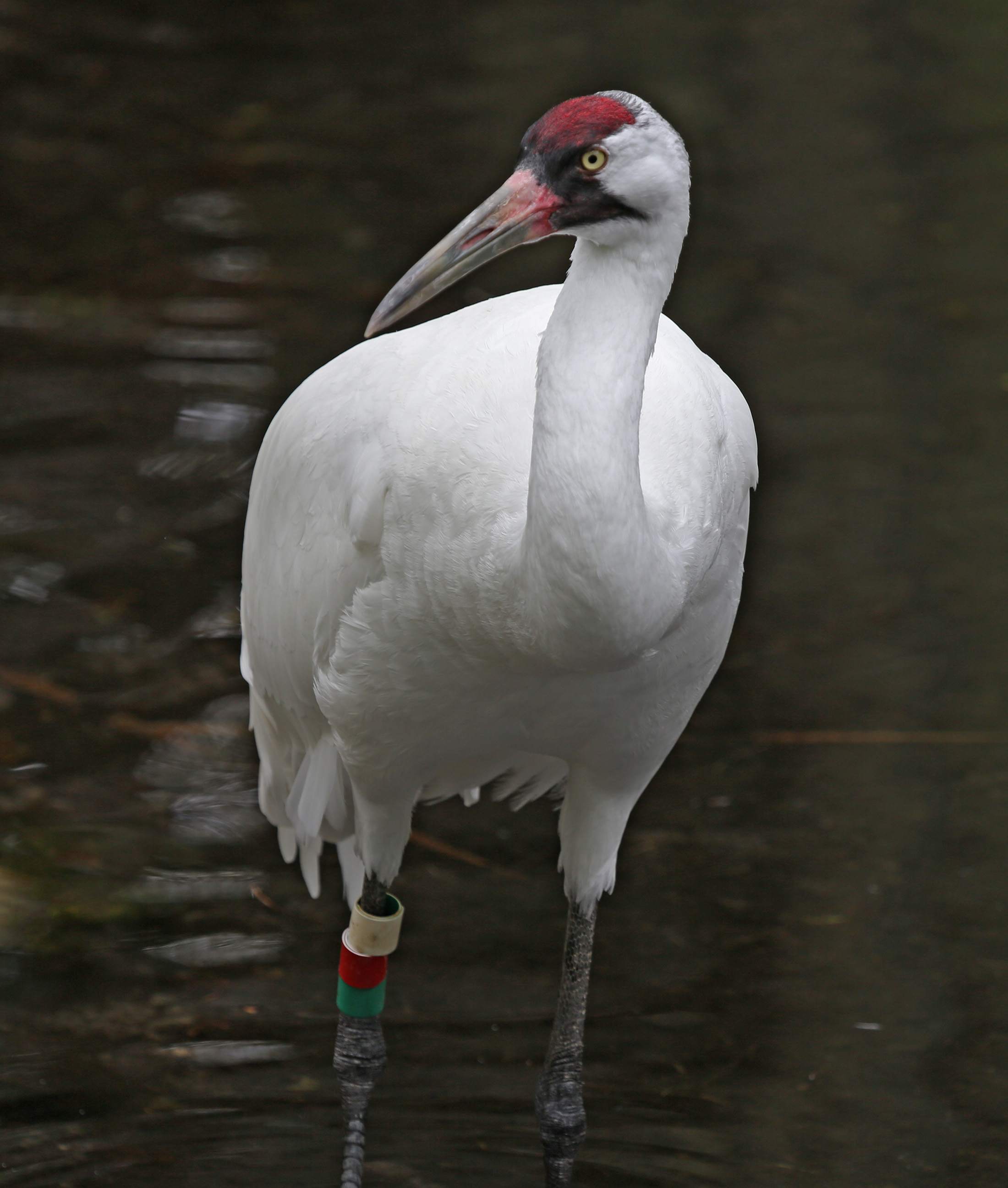 Whooping Cranes are predominately white with a red crown, red cheek and black wing tips. The bill is long and a dark olive gray transitioning to light red at the base. During breeding season the bill becomes lighter. The legs are dark gray/black and the iris is yellow. Both sexes are similar but the male is slightly larger. Also, the male can be determined by the guard call. Juveniles are mostly reddish cinnamon. Some estimates put the life span of the Whooping Crane in the wild at a maximum of 30 years but more typically 20-25.