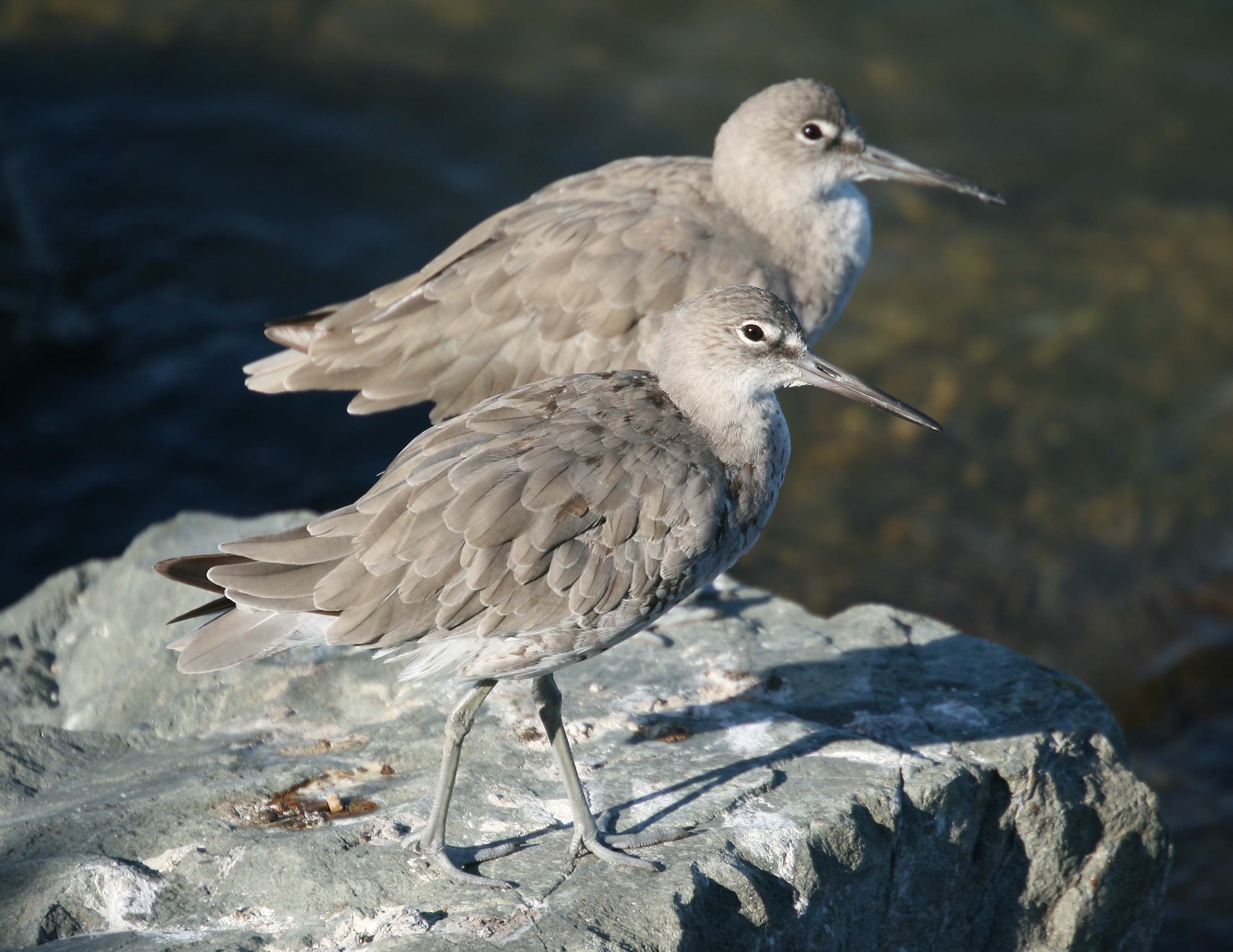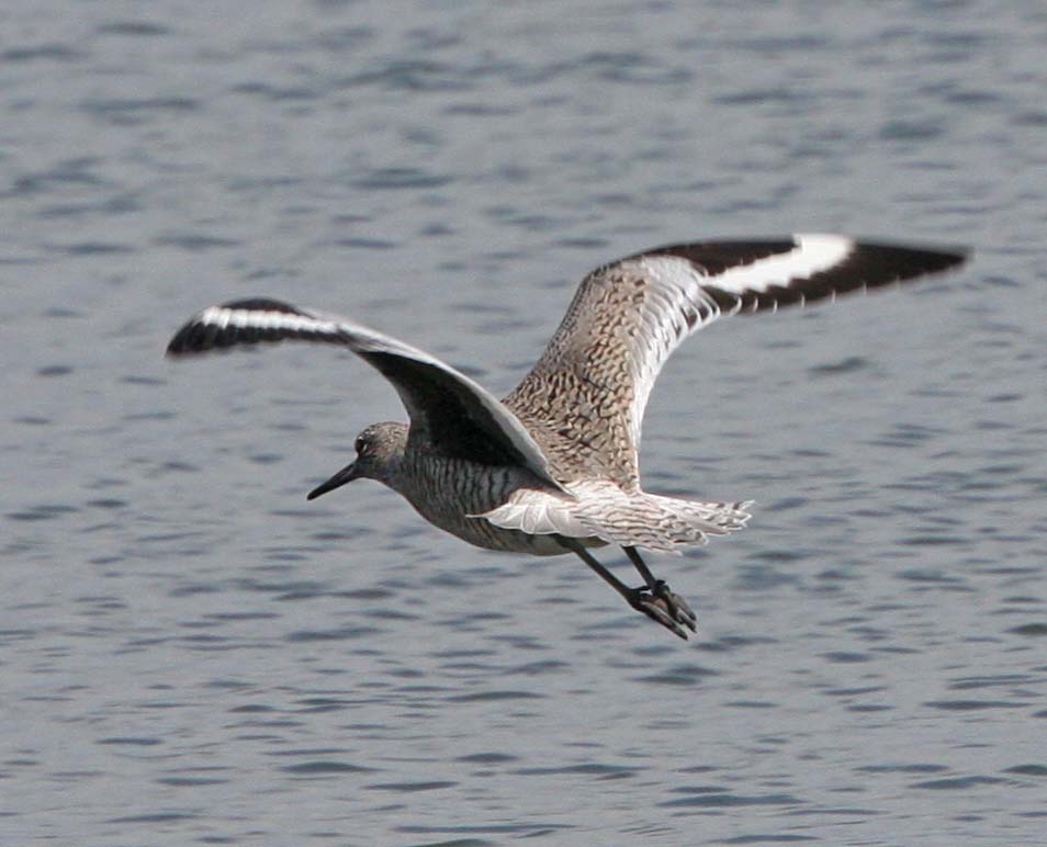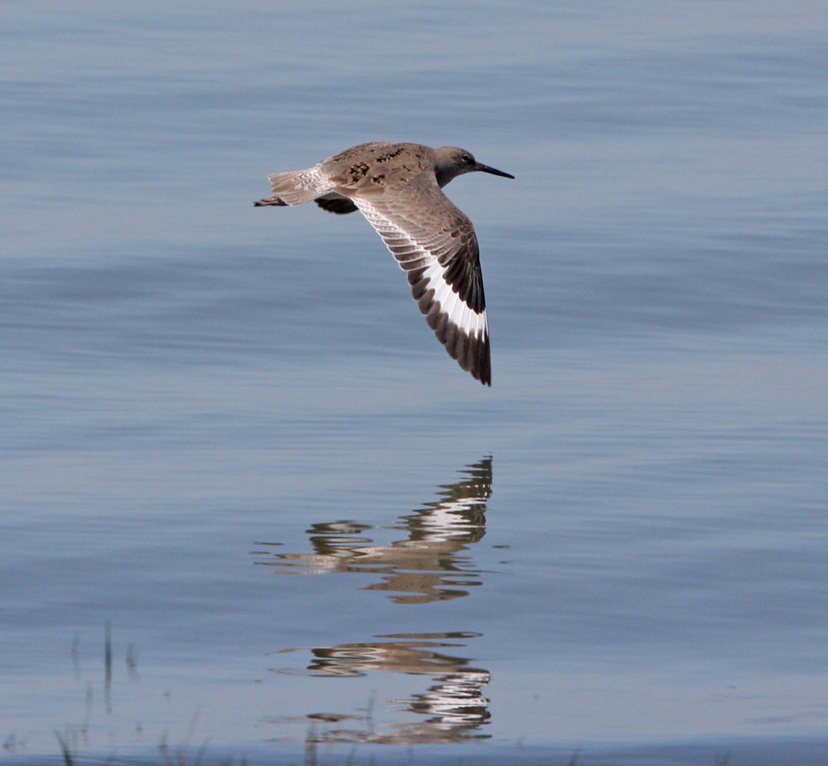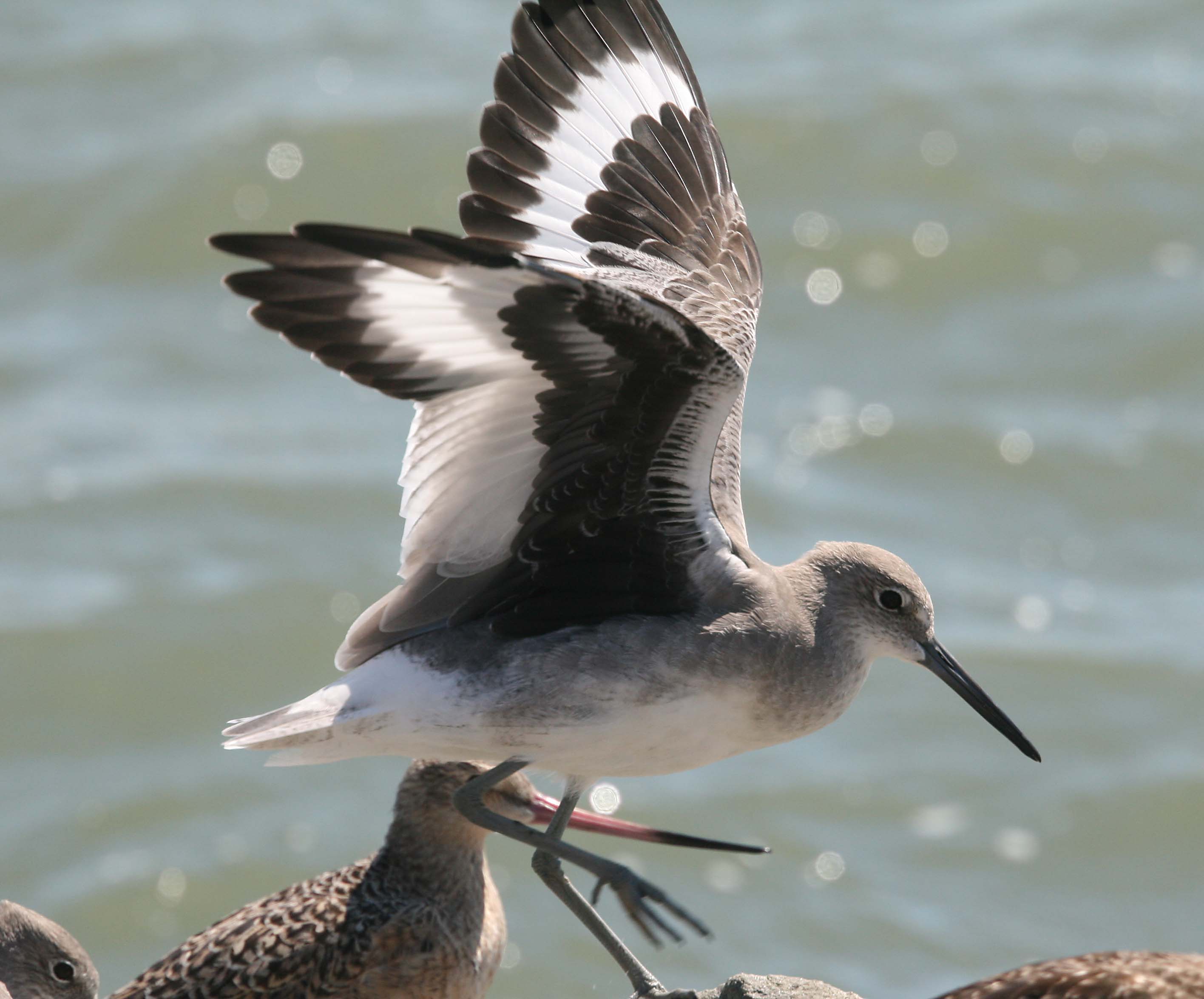 The Willet breeds in central U.S. and Canada and winters along the North American and South American coasts. The Willet is a common visitor to the Bay Area in the winter. Their non-breeding plumage looks quite gray and drab until they take off. Then the underside of their black-and-white wings is on display. A flock of them is quite spectacular.