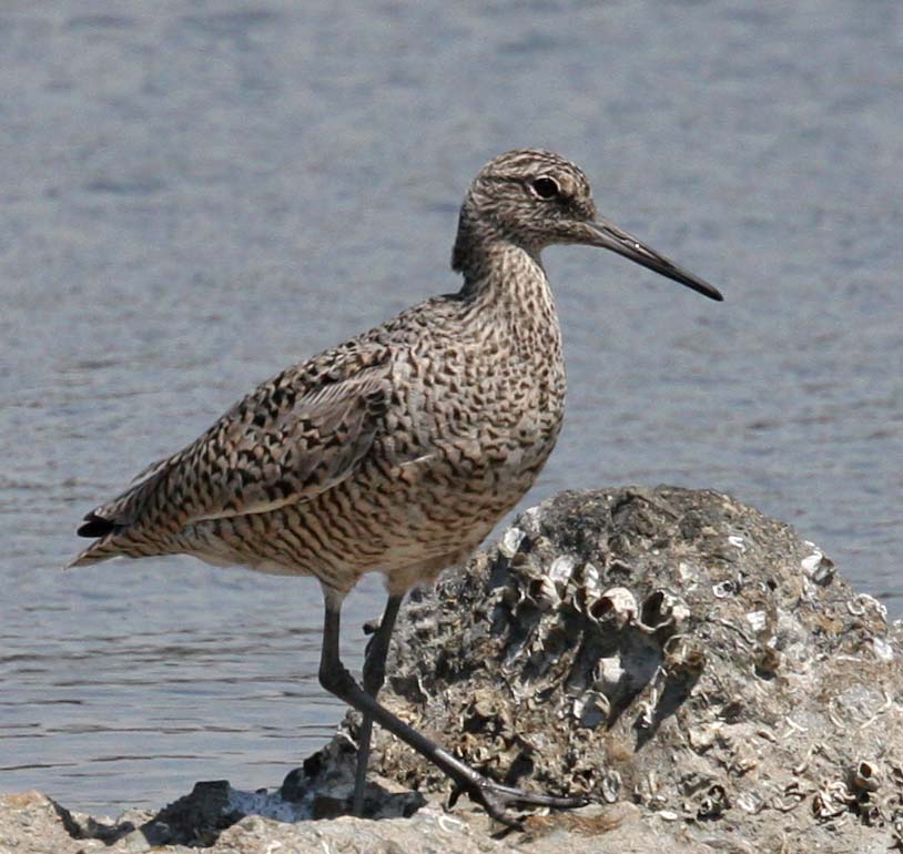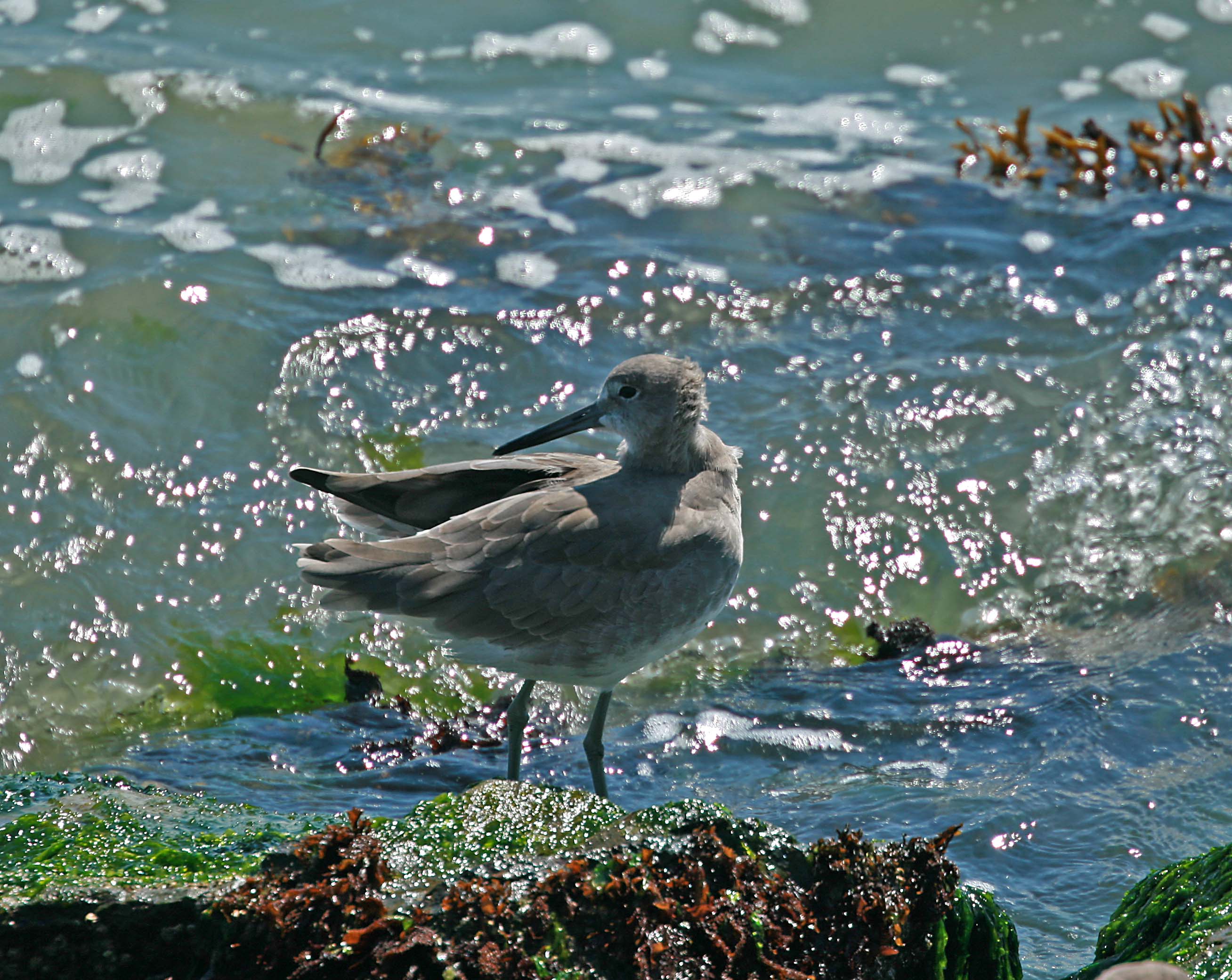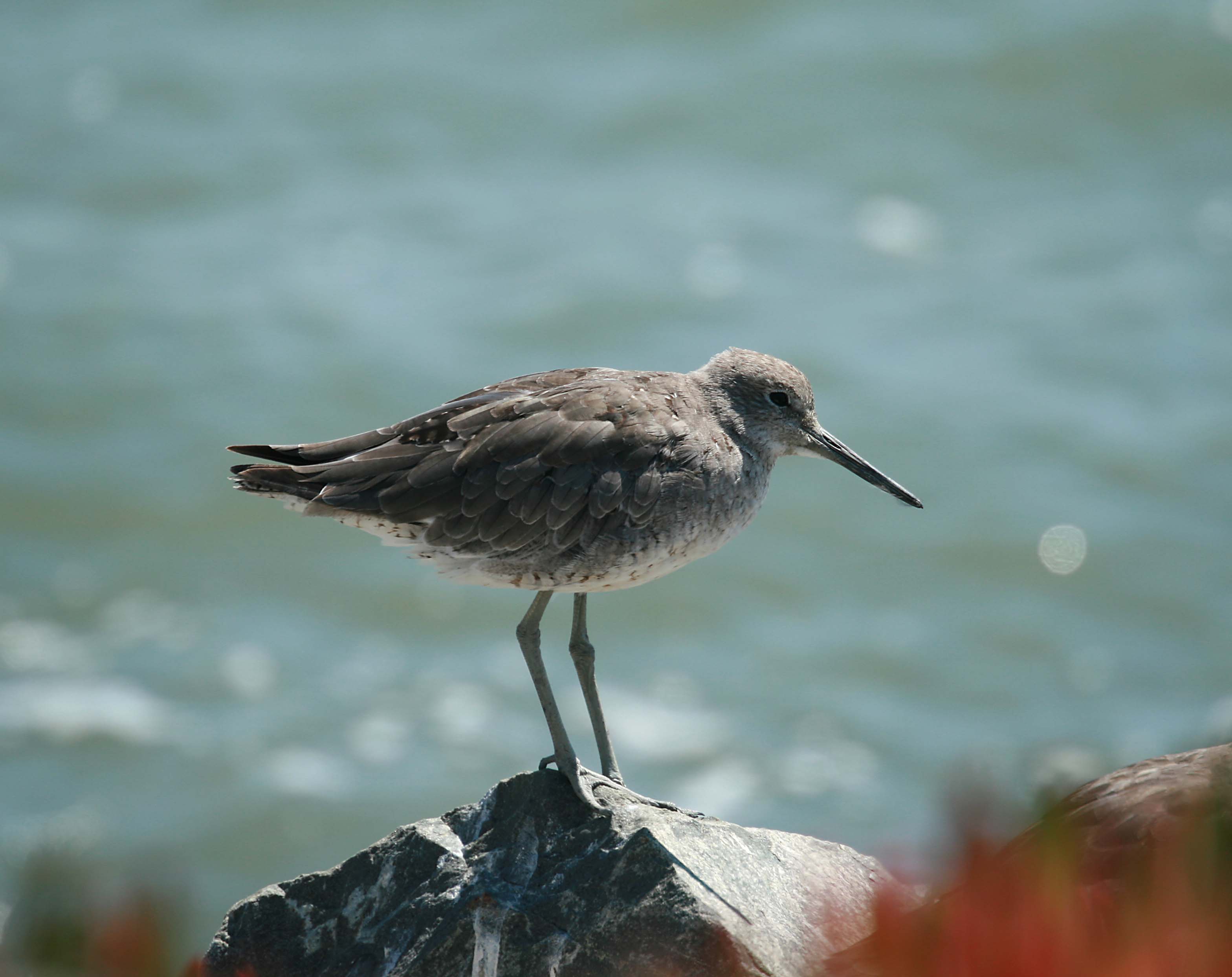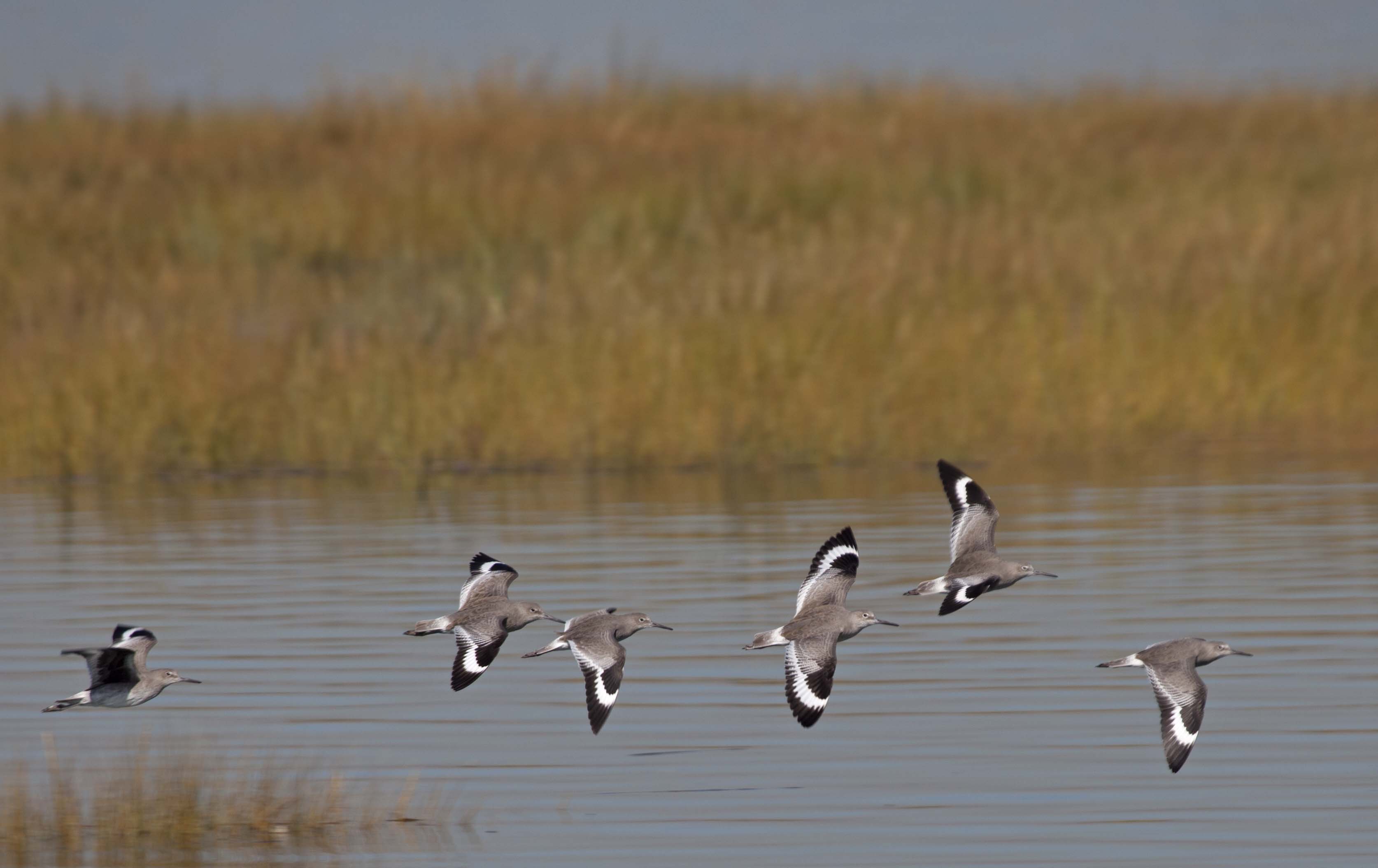 The Willet breeds in central U.S. and Canada and winters along the North American and South American coasts. The Willet is a common visitor to the Bay Area in the winter. Their non-breeding plumage looks quite gray and drab until they take off. Then the underside of their black-and-white wings is on display. A flock of them is quite spectacular.