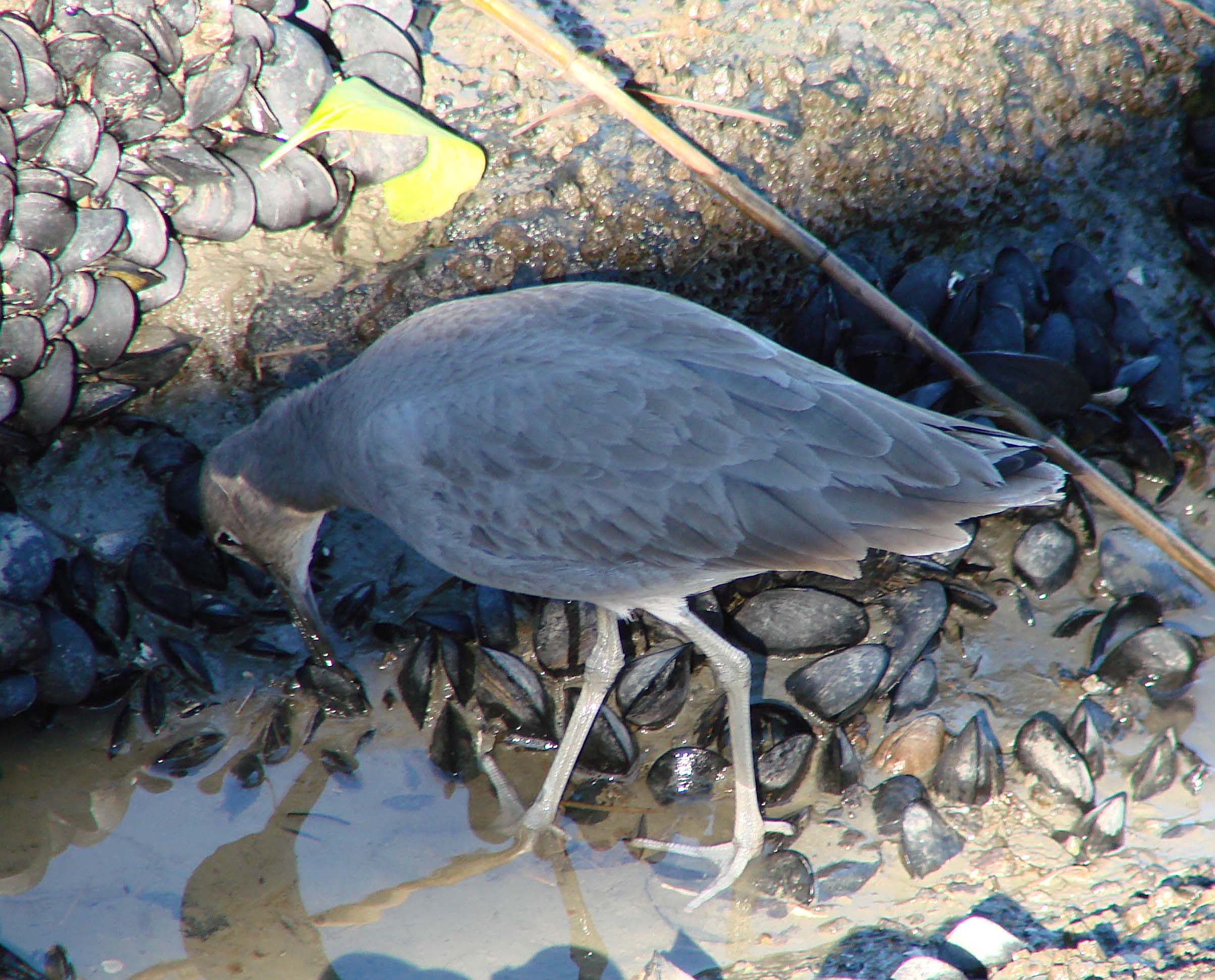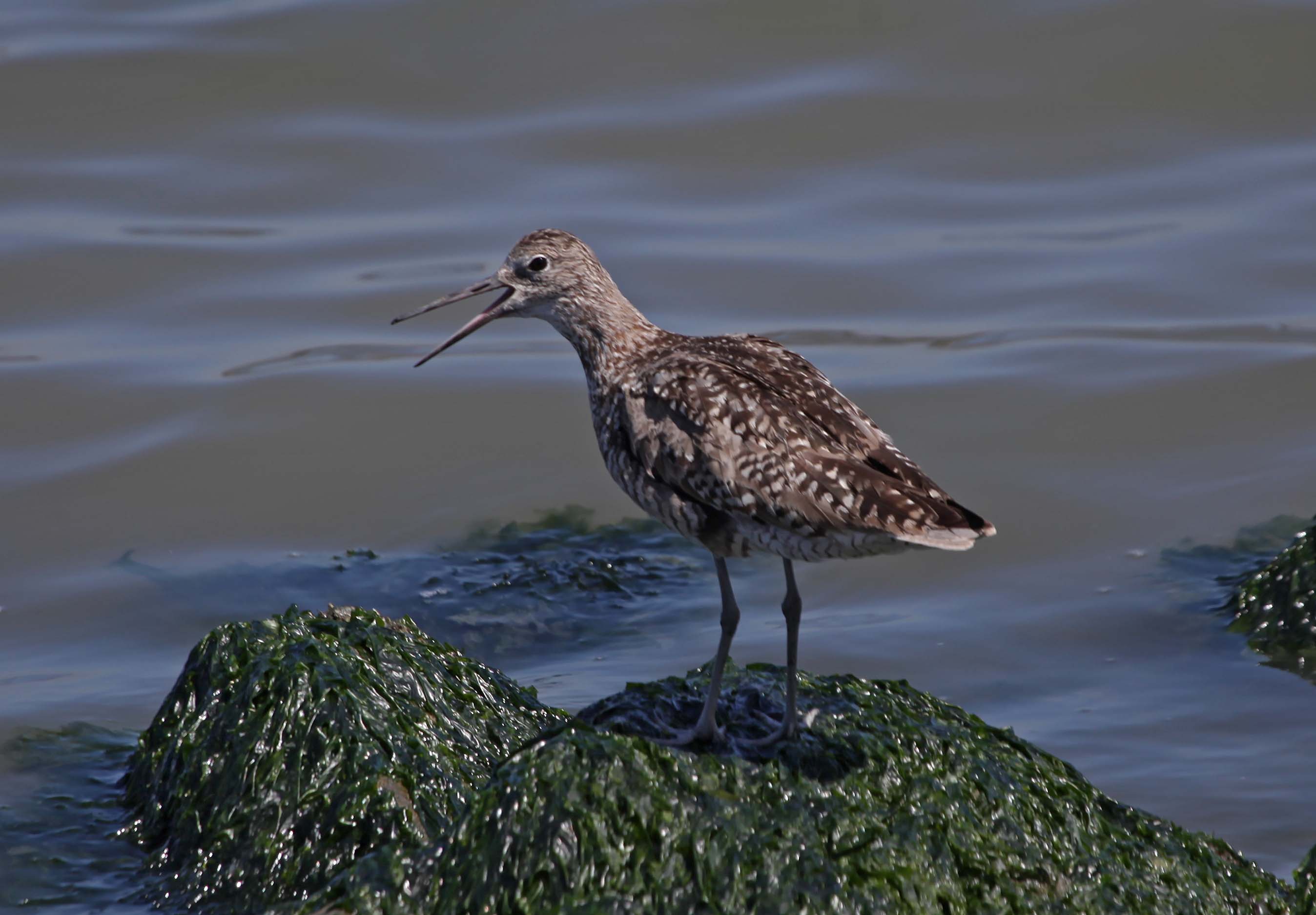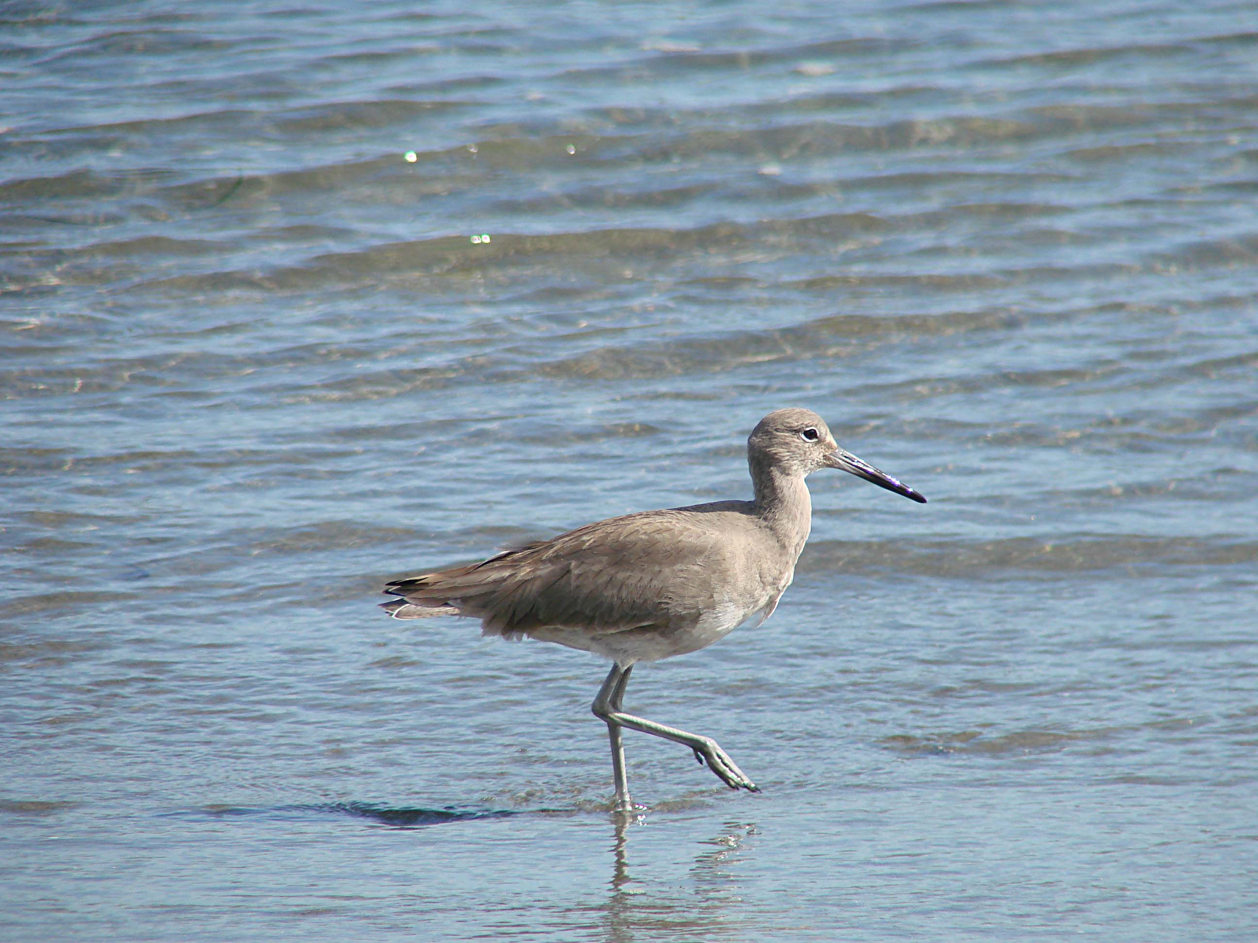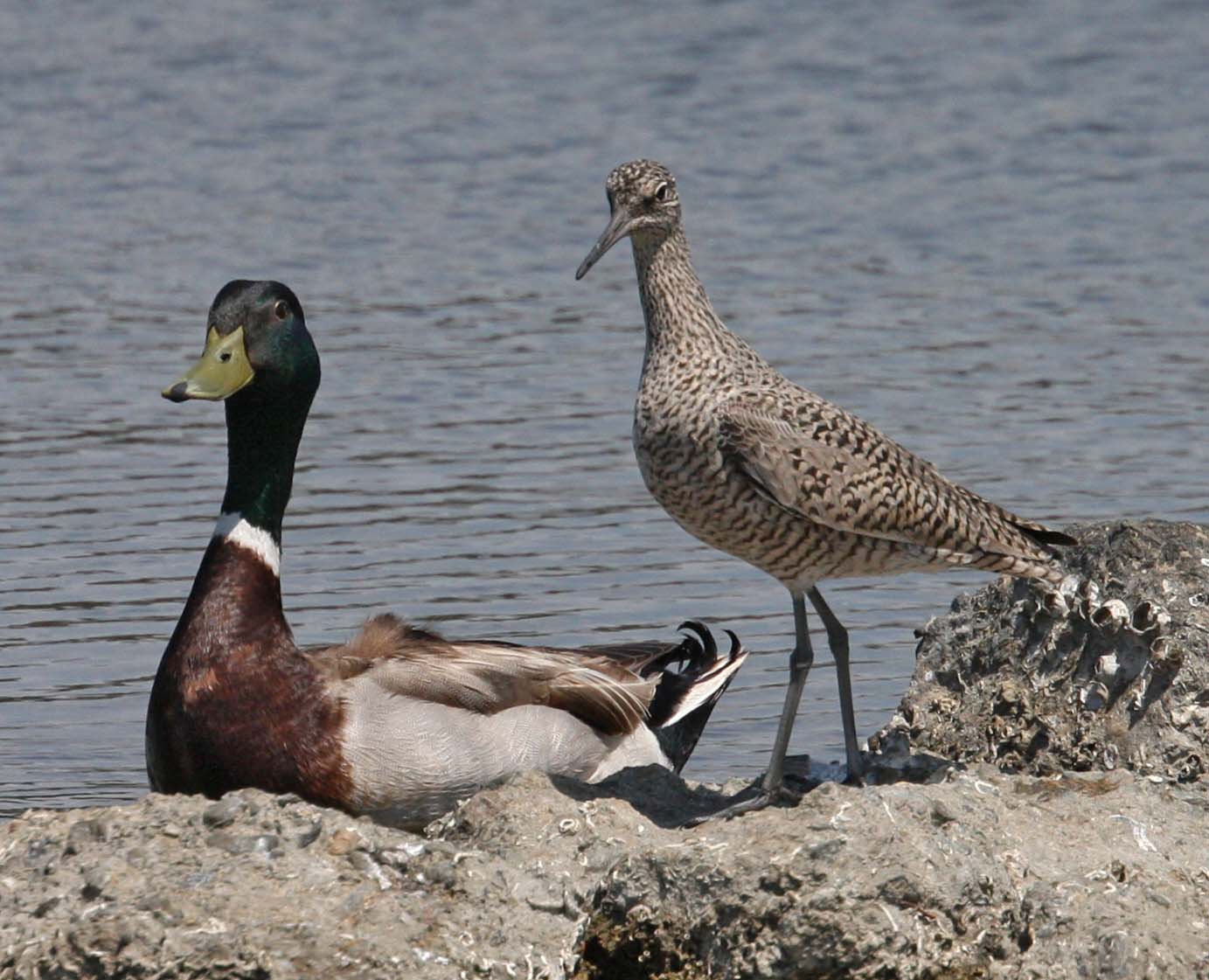 The Willet breeds in central U.S. and Canada and winters along the North American and South American coasts. The Willet is a common visitor to the Bay Area in the winter. Their non-breeding plumage looks quite gray and drab until they take off. Then the underside of their black-and-white wings is on display. A flock of them is quite spectacular.