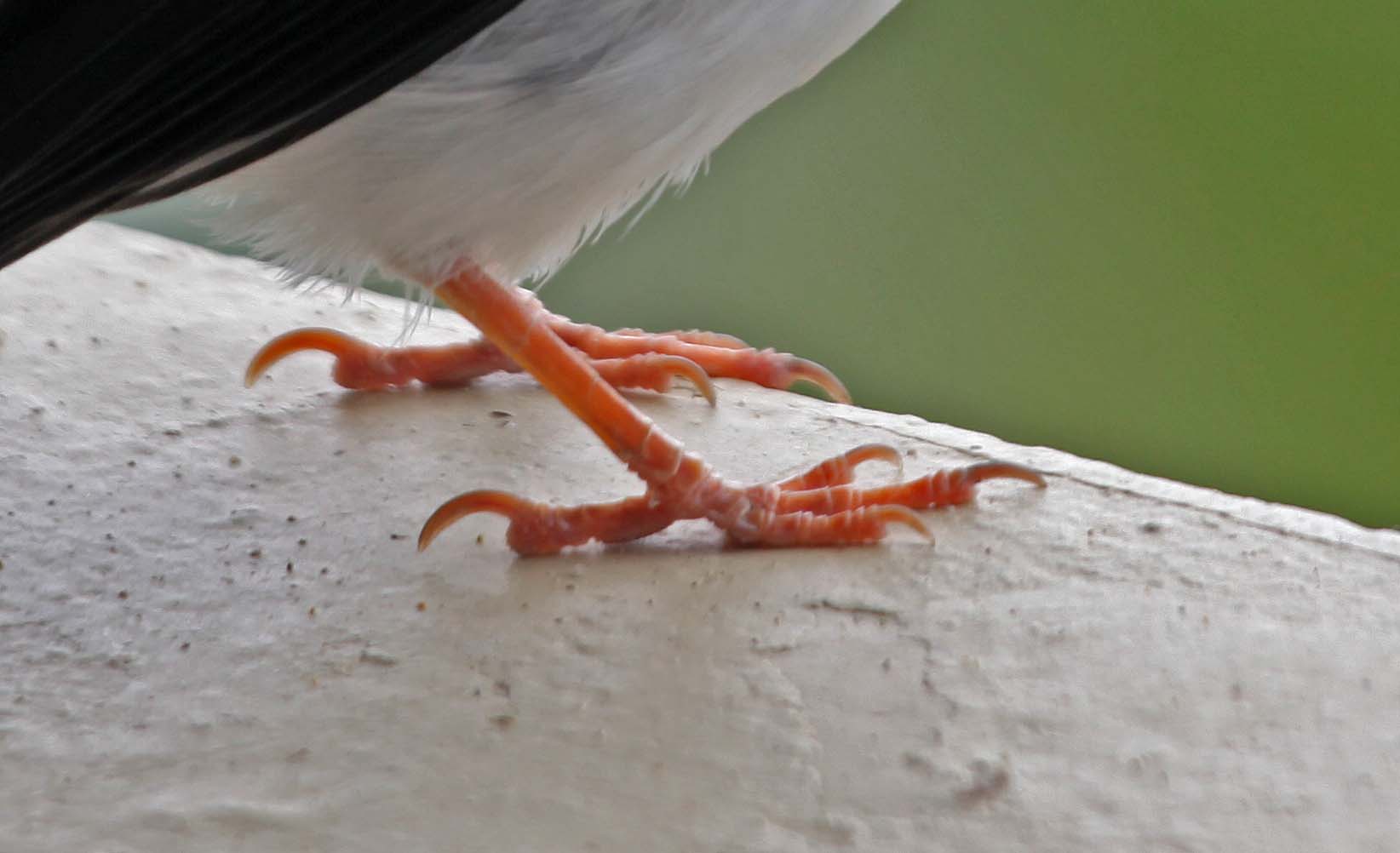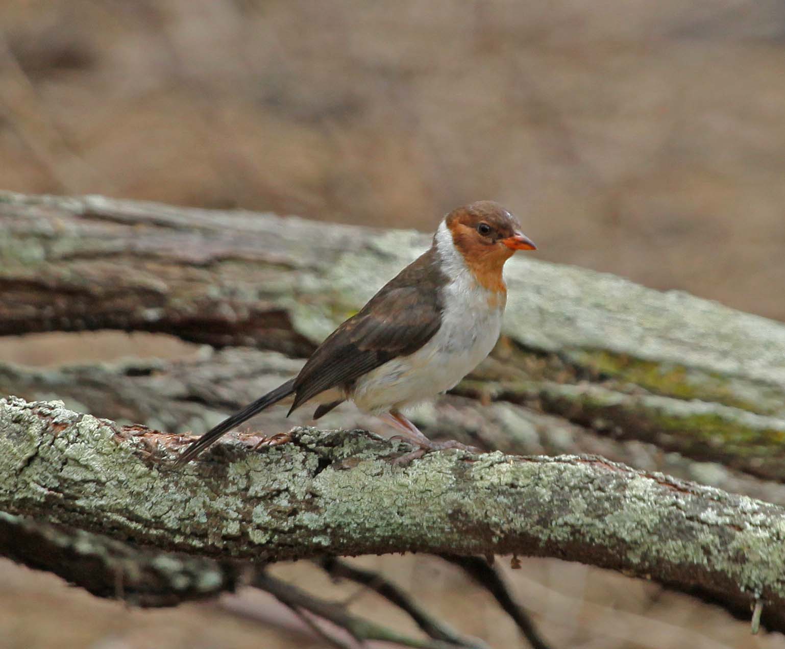 The Yellow-billed Cardinal is in the tanager family and is an import to the Big Island of Hawaii from South America (Brazil, Bolivia, Paraguay, Uruguay). The Yellow-billed Cardinal has a bright red head, black upperparts, white underparts, a black chin, a yellow bill, pinkish legs and orange eyes. Juveniles have a brownish head. At first glance, Yellow-billed Cardinals can be confused with Red-crested Cardinals, but the yellow bill and absence of a crest on the Yellow-billed Cardinals is a giveaway. Further, they are not even closely related. The population on the Big Island is probably due to released/escaped cage birds.
