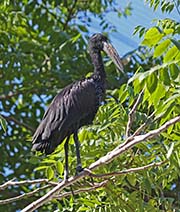 The African Openbill is a small stork that is found in sub-Saharan Africa. The plumage is black with purple and green iridescent highlights. Their iris is brown with a yellow inner ring. The most unique feature is the large brownish bill with a gap that is specifically designed to remove molluscs from their shells. Legs and feet are black with gray eyes. Both sexes are similar in both size and coloration.