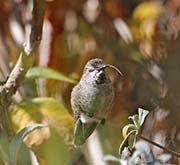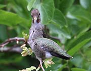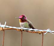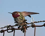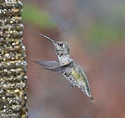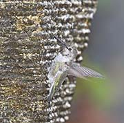 Anna's Hummingbirds are found along the western edge of southern Canada, the U.S. and northern Mexico. They are very common in the S.F. Bay Area and California. Males have the noticeable red-throat when breeding. They eat nectar from flowers (see the picture below with the tongue extended) and eat insects and sometimes tree sap.