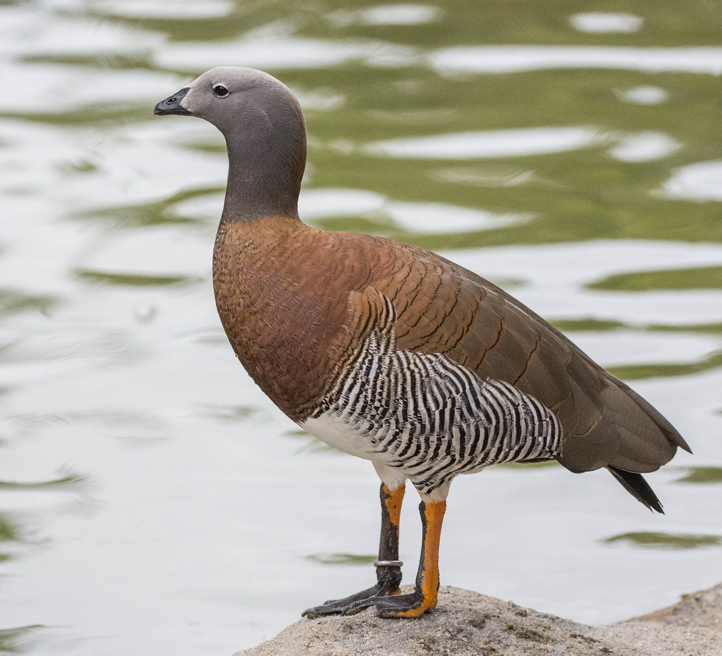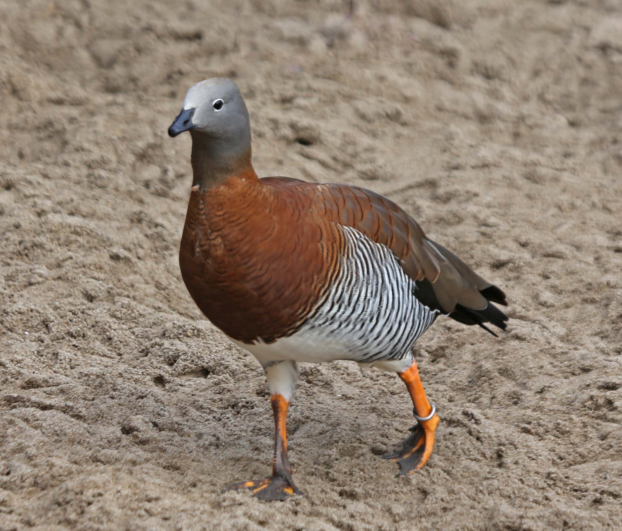 The Ashy-headed Goose is from southern South America. They have a brownish back, chestnut neck, the underparts are white with black bars and they have a grey head. The primary flight feathers are black, the secondary feathers are white, and the greater wing-covers are black, edged with green and white tips. The inside of their legs are black and the outside are a reddish-orange. The eyes and bill are black and the bills has a slight downward curve at the tip.