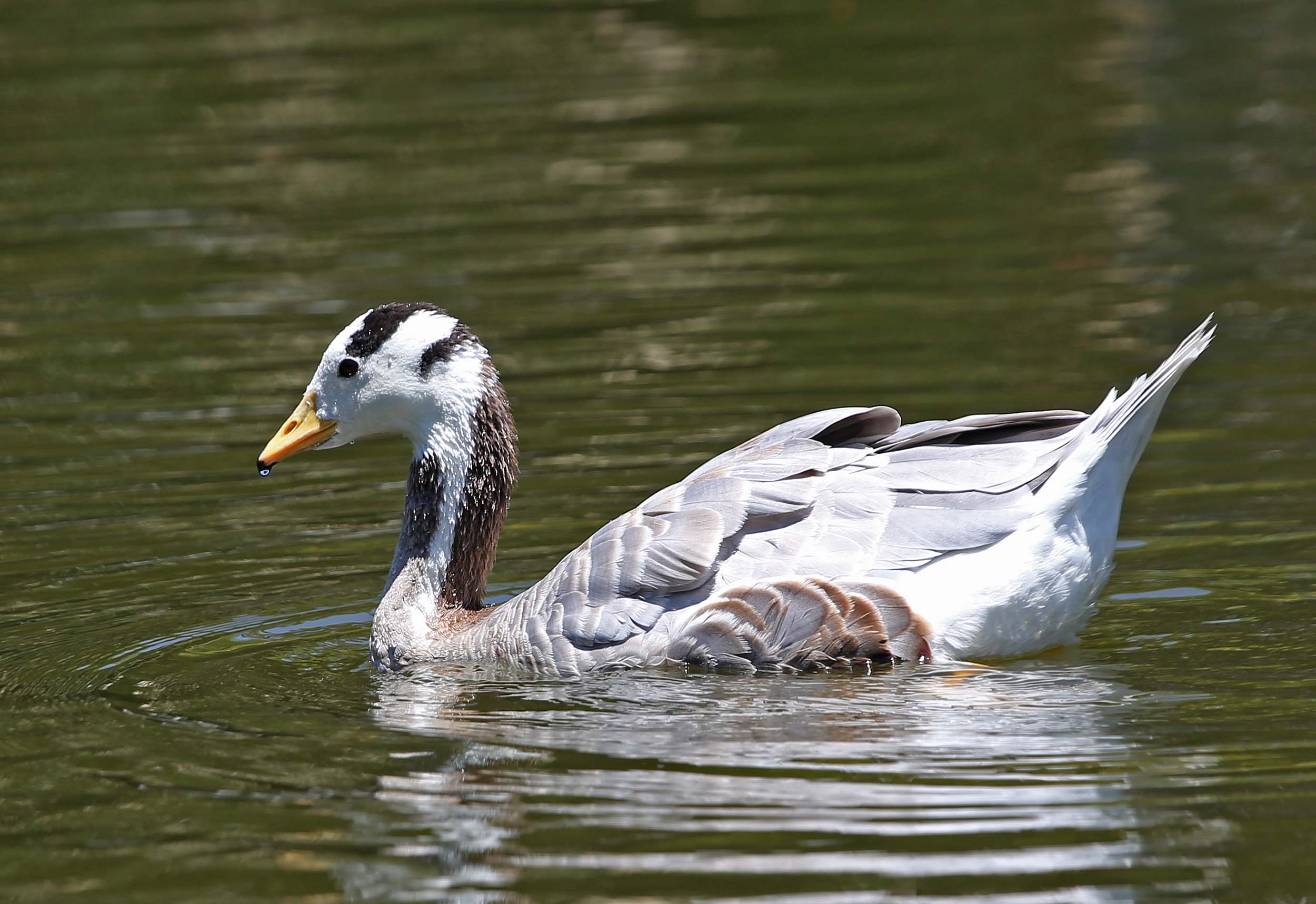 The Bar-headed Goose body is mostly shades of gray (sometimes brownish) with white tail coverts and rump. The head is white with two black bars on the head. One bar is from eye to eye across the head, the other is a lower and extends from ear to ear across the neck. The back of the neck is black or brown with a white strip on the sides. The front of neck is mostly gray. The iris is brown. The bill, legs and feet are orangish-yellow and the bill has a black tip. Both sexes are identical in plumage. Juveniles are similar but the head is pale gray and the black areas on the neck are more brown.