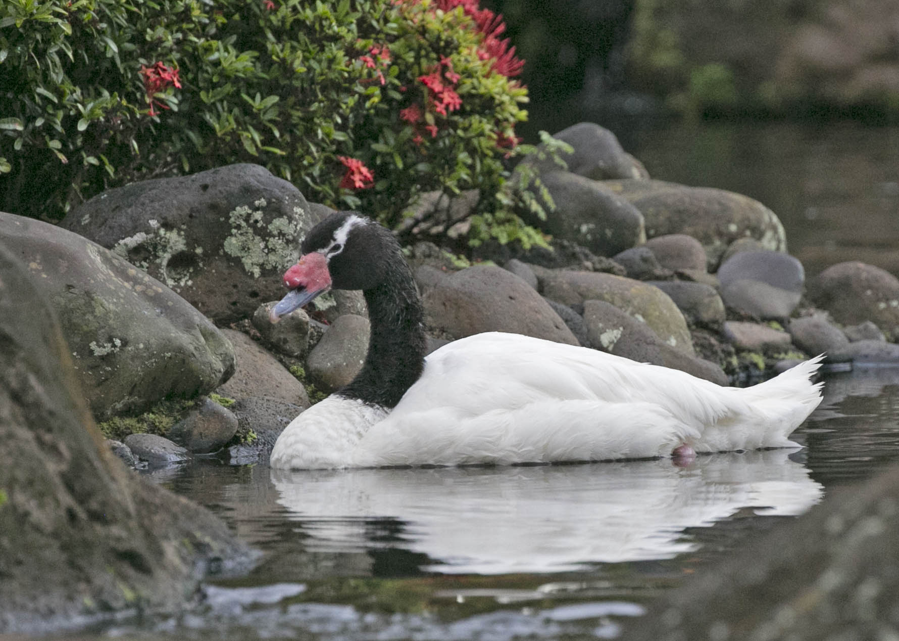 The Black-necked Swan is an import from South America. Both sexes are similar in plumage, but the female is a little smaller in size and the knob on the head is also a little smaller. The Black-necked Swan is the smallest in its genus and is found in freshwater marshes, lagoons and lakes.