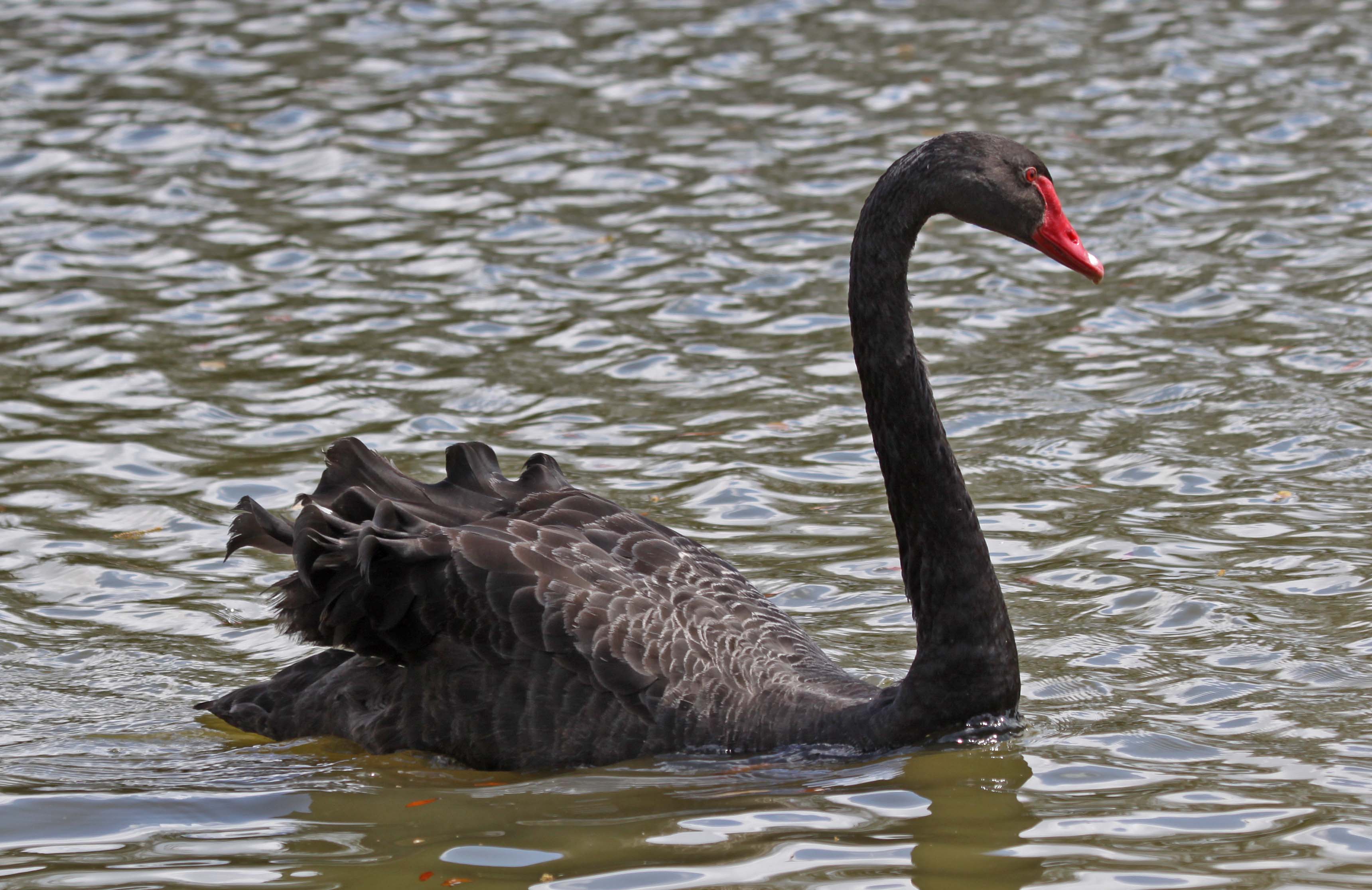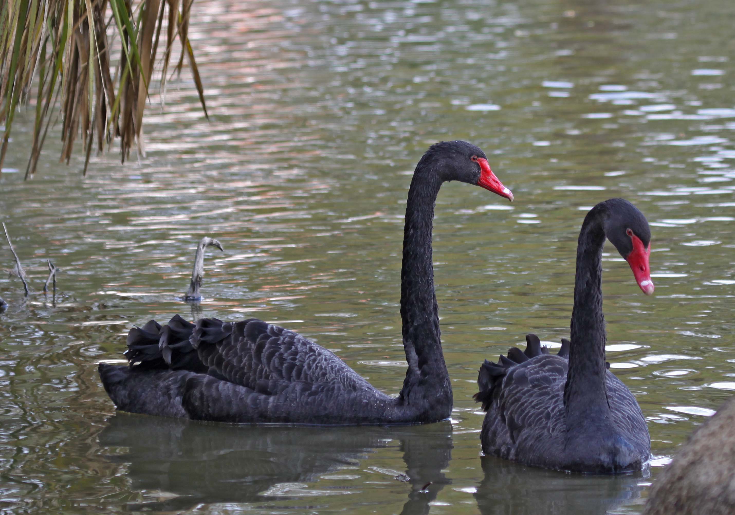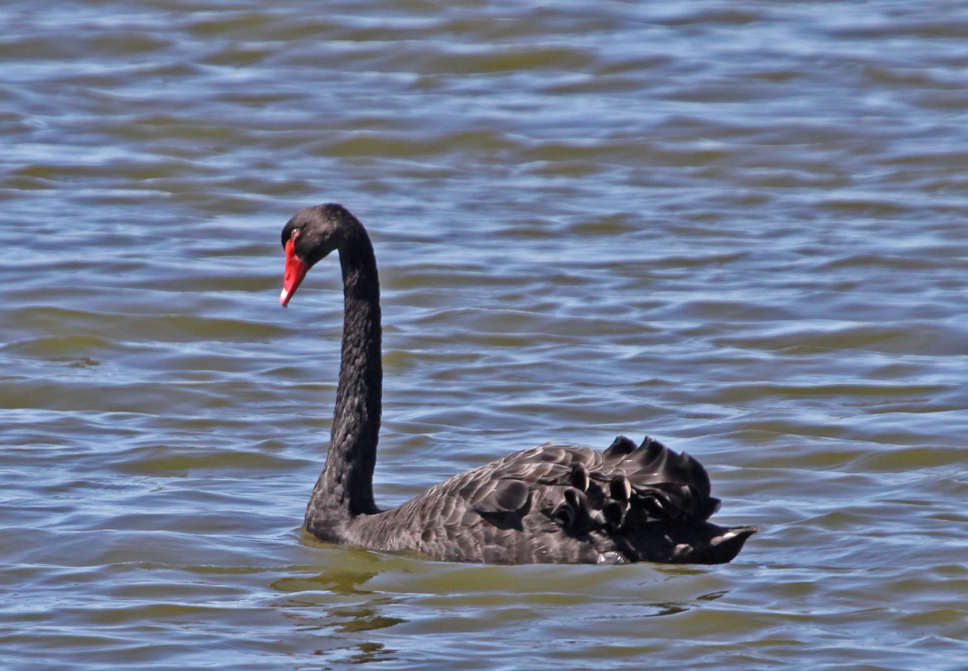 The Black Swan is native to Australia. The populations in the U.S. were probably escapees from Zoos, private collections, etc. The adults are all black except for the beak and a white area on their wings.