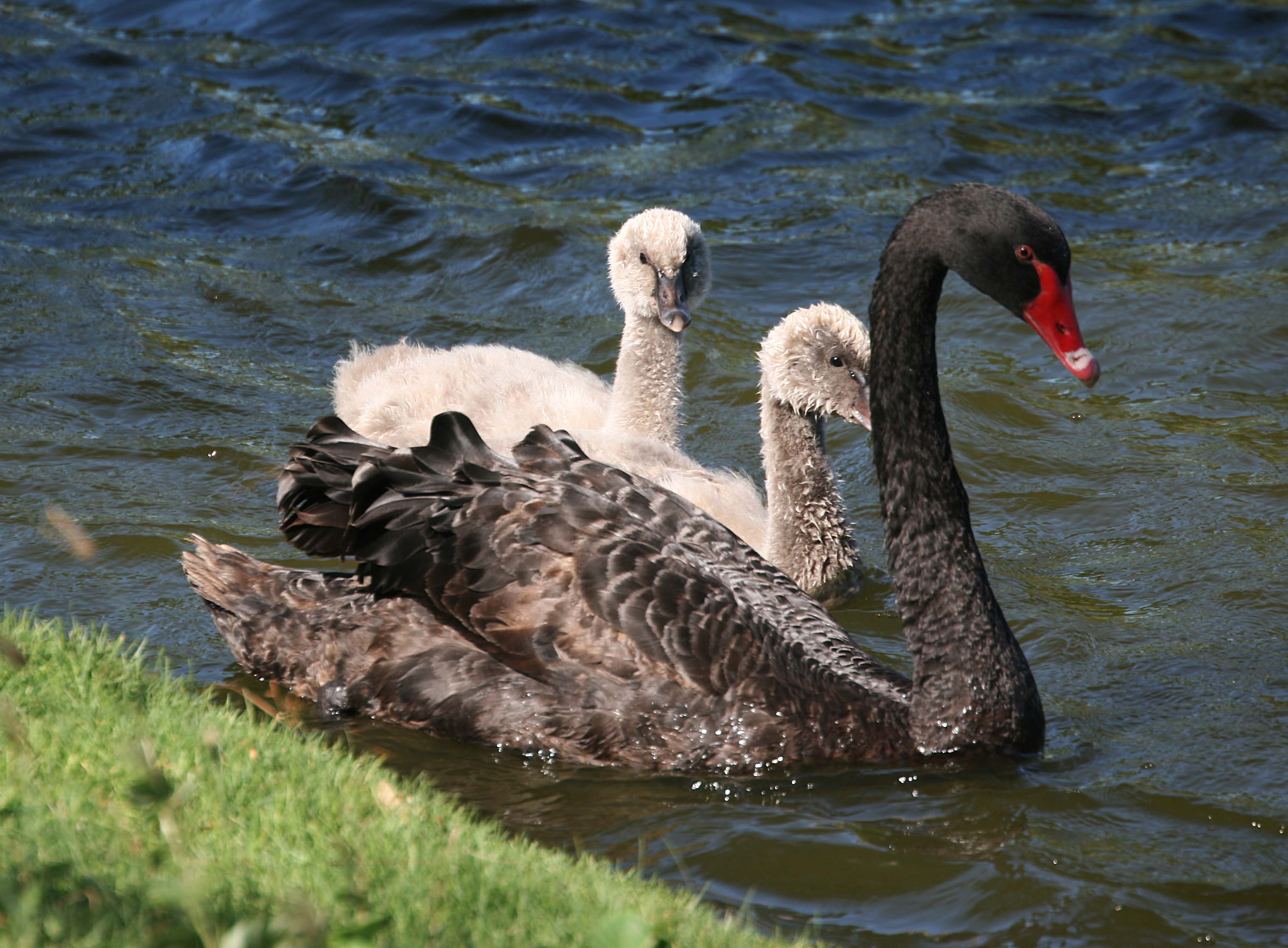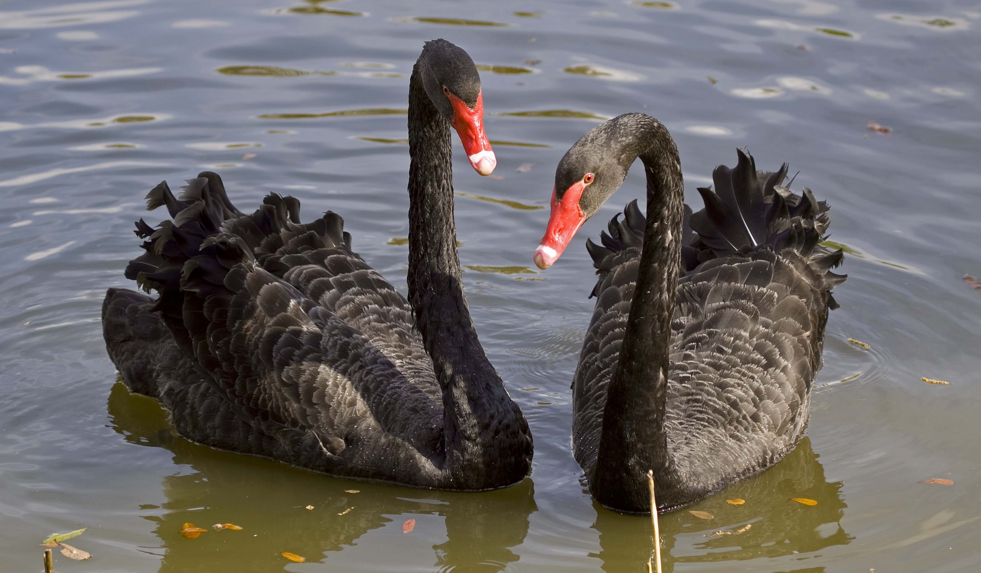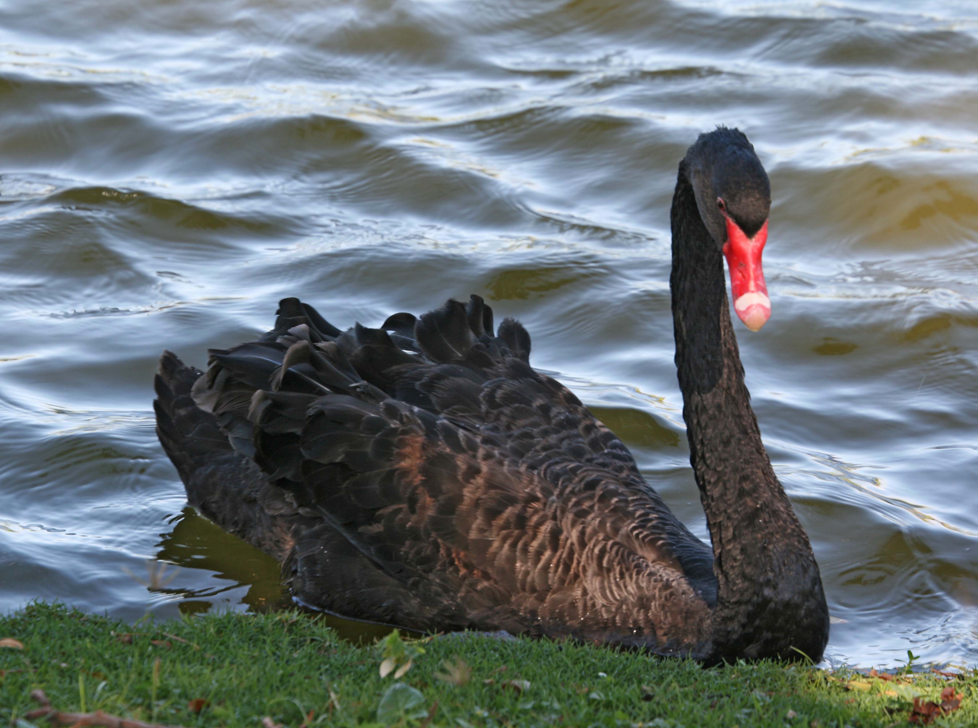 The Black Swan is native to Australia. The populations in the U.S. were probably escapees from Zoos, private collections, etc. The adults are all black except for the beak and a white area on their wings.
