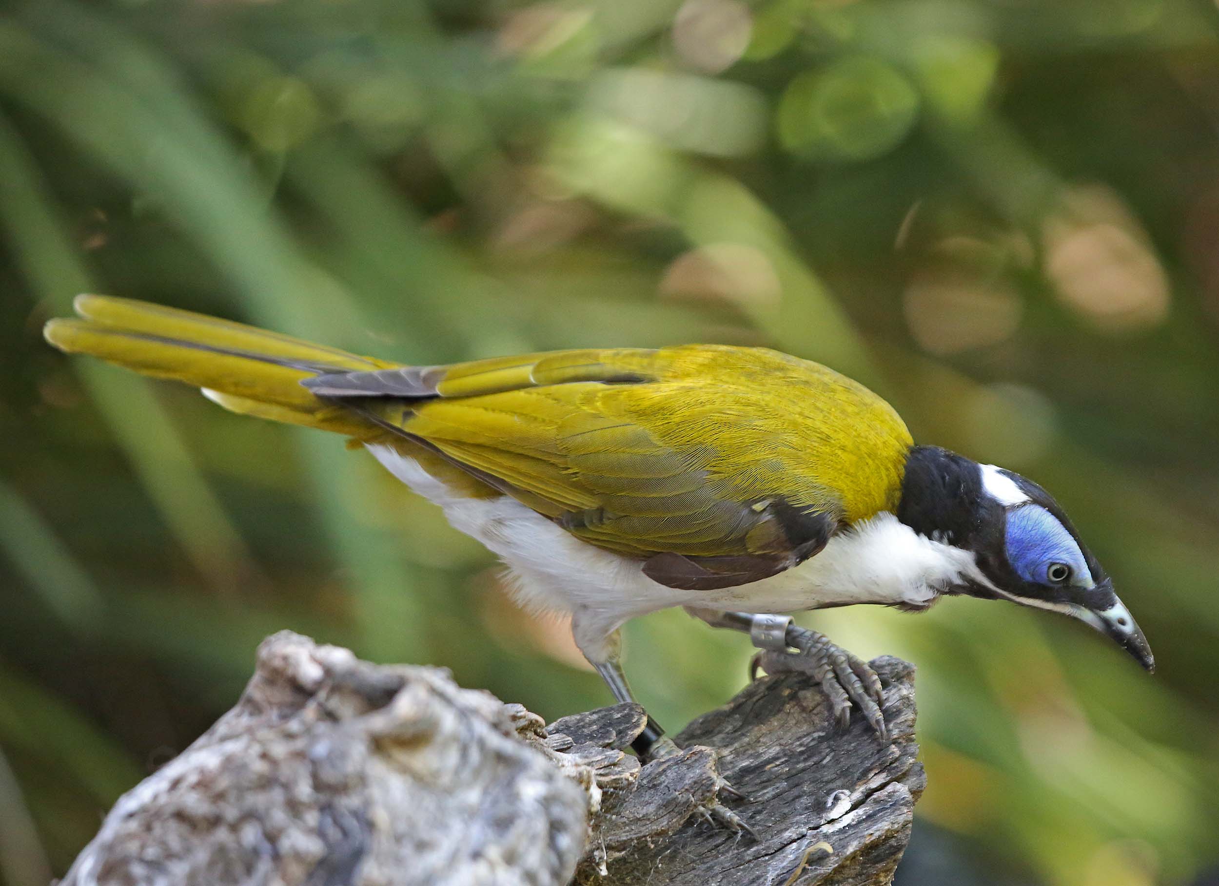 Habitat and Range: The Blue-faced Honeyeater is found in northern and eastern Australia and in Papua New Guinea. They prefer open forests and woods, banana plantations, orchards, parks, and gardens near water.