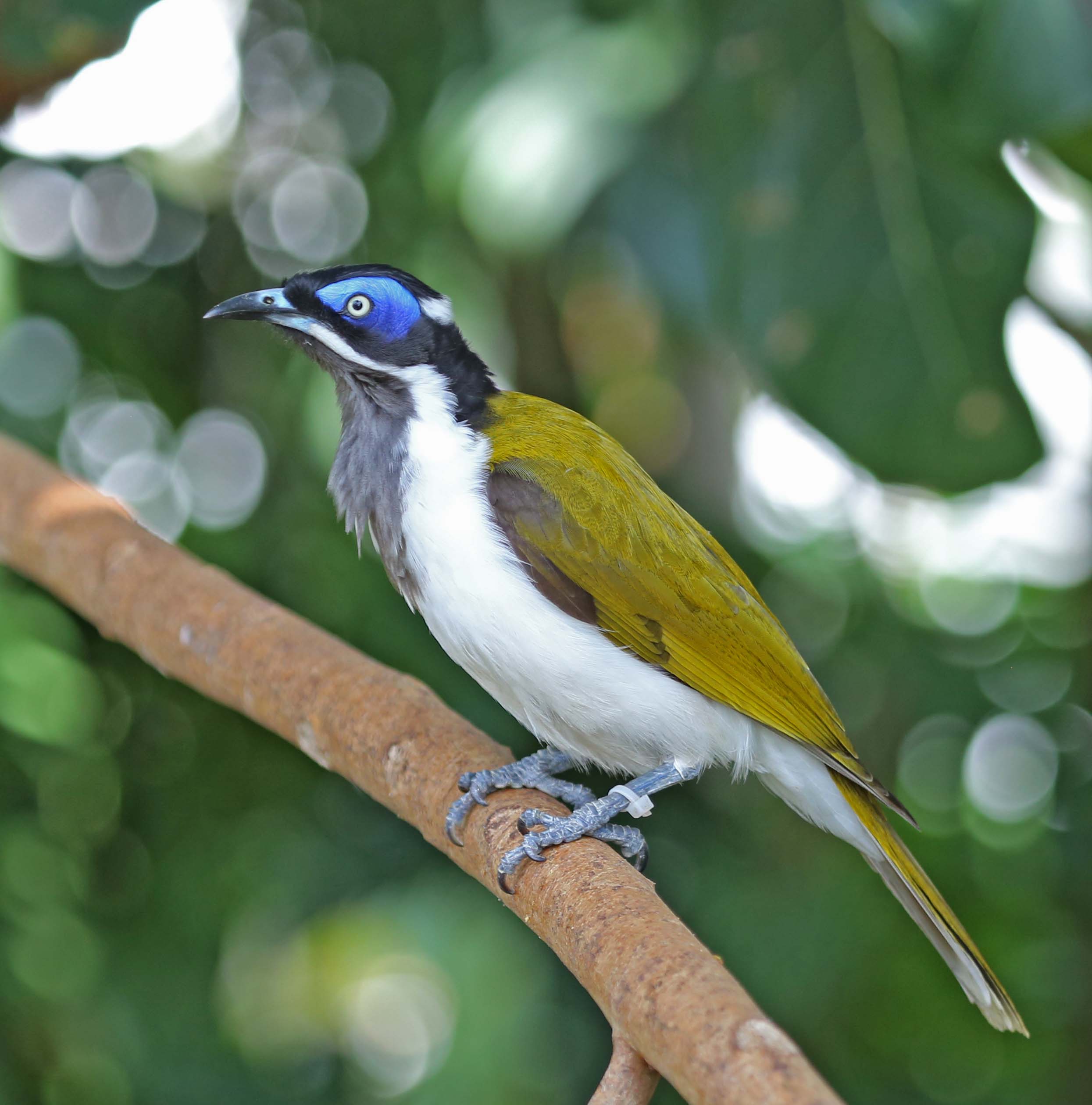 Three subspecies of Blue-faced Honeyeaters are found in Australia and Papua New Guinea. Blue-faced Honeyeaters have white underparts and olive green upperparts. They have a black head and throat, white nape and blue skin around their yellow eyes. Their legs and feet are gray. Both sexes are similar in plumage. Juveniles differ from adults by the color of the bare skin around their eyes which is a yellowish-green.