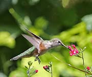 The Broad-tailed Hummingbird breeds in the western U.S. and winters in Mexico. This hummingbird hunts insects as well as eating nectar.