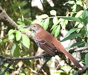 The Brown Thrasher is reddish-brown (or brown) with a white breast that is streaked. The Brown Thrasher is found in mid-western and eastern U.S. It's beaked is not as curved as the California Thrasher, which is local to California.