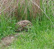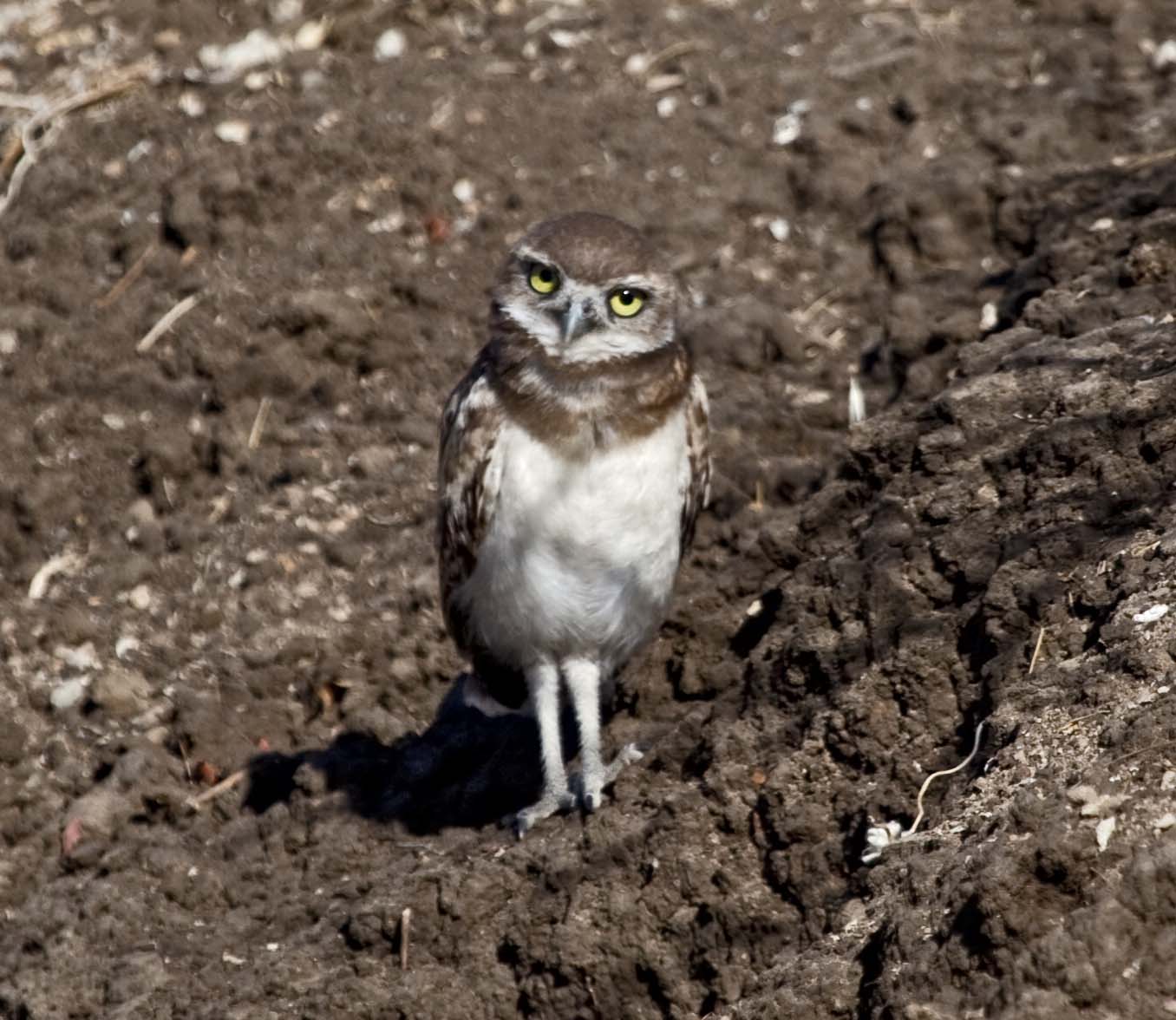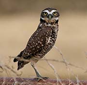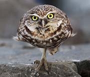 The Burrowing Owl is a small owl with long-legs and a short tail that is found in North and South America. They primarily eat large insects and small mammals (principally rodents). They nest in abandoned animal burrows or crevices. They frequently perch on posts and rocks or can be seen peeking out of their burrows.