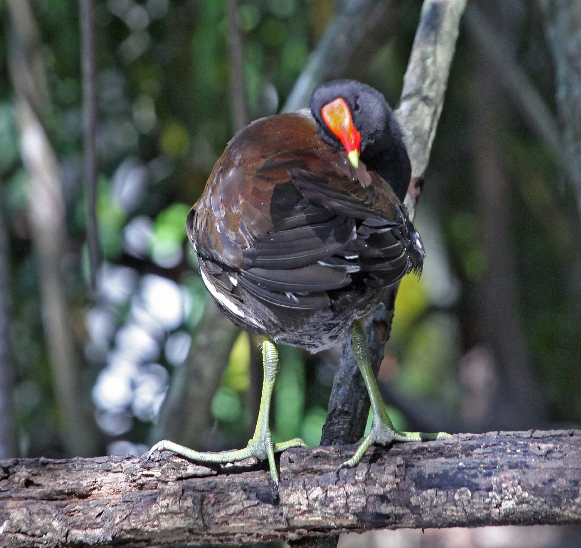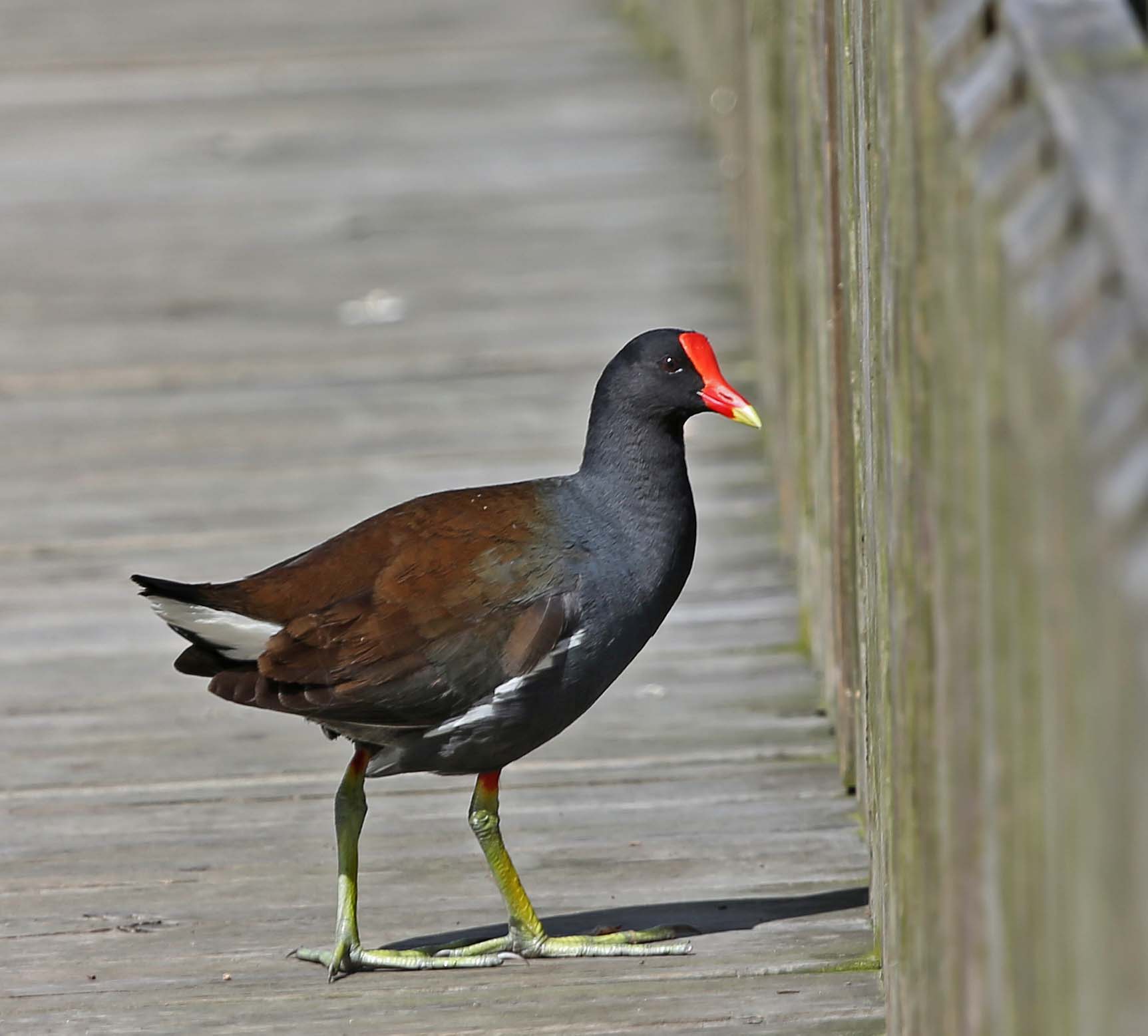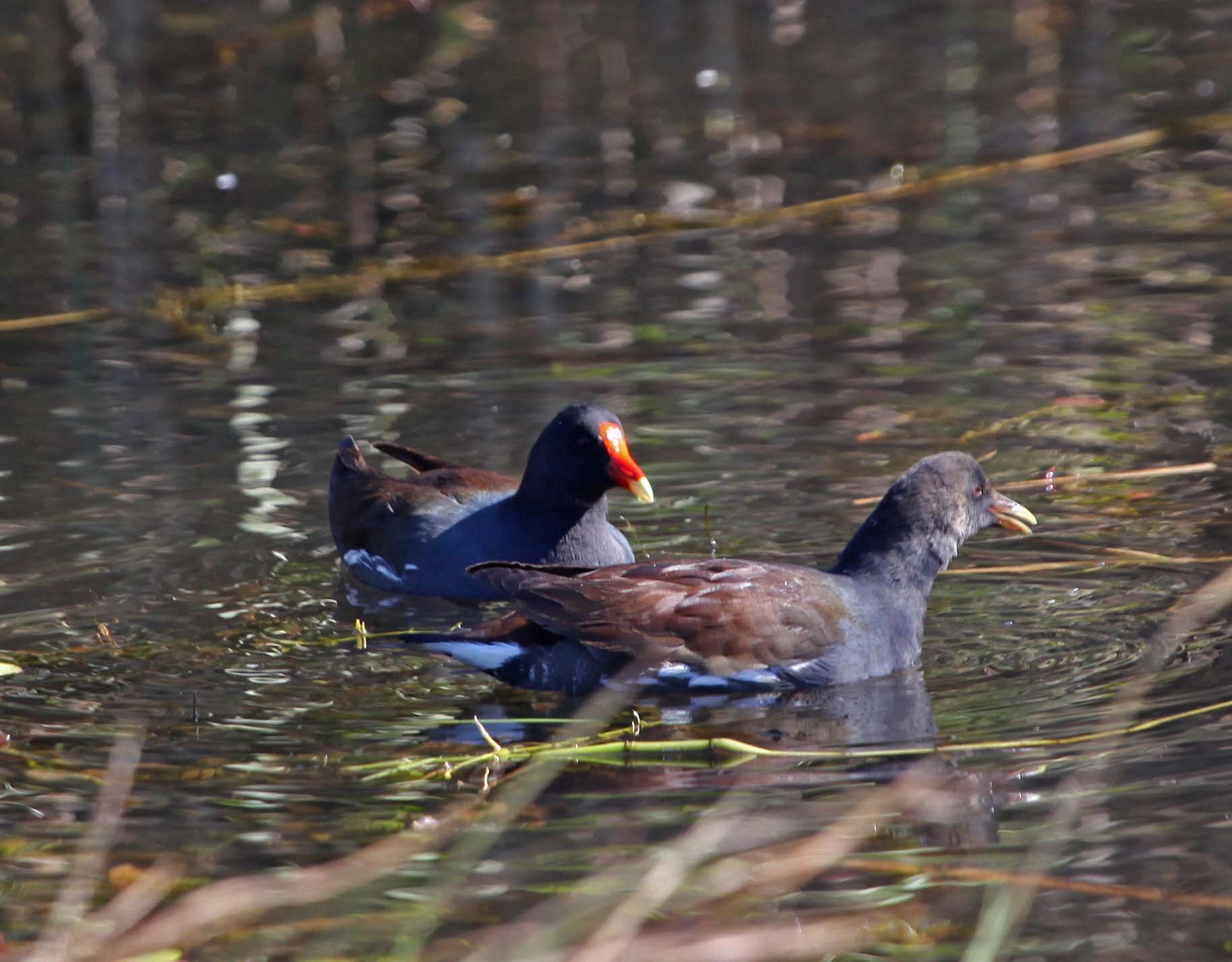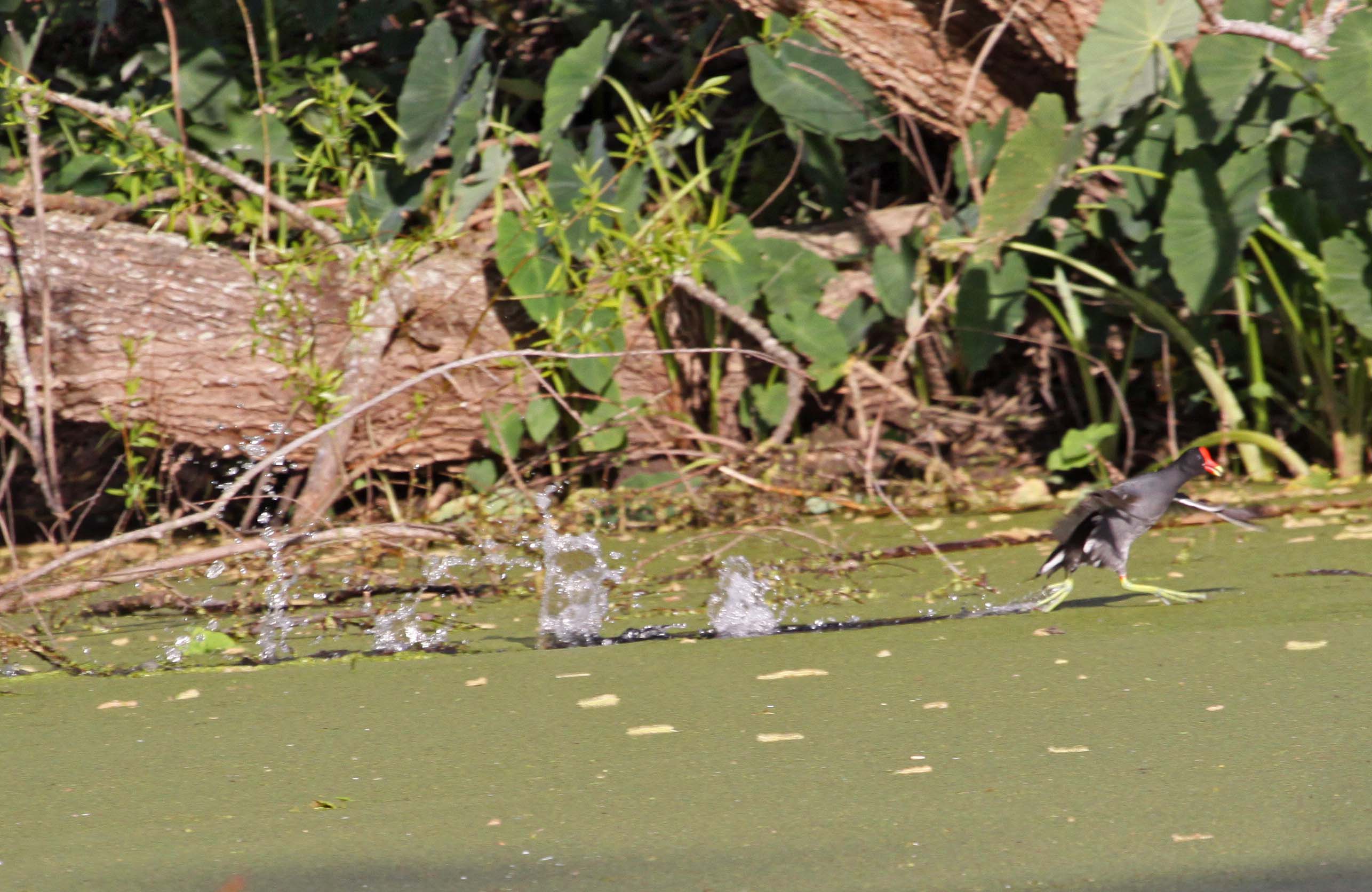The Common Gallinule (formerly the Common Moorhen) was split from the Common Moorhen by the American Ornithologists' Union in July 2011. The Common Gallinule prefers freshwater marshes and is found throughout North America. Their diet consists of grasses, sedges and sometimes snails. The toes on the Common Moorhen are extremely long and there is no webbing. This supposedly makes it possible for them to walk on floating vegetation. As one of the pictures below shows, they can also run across water.