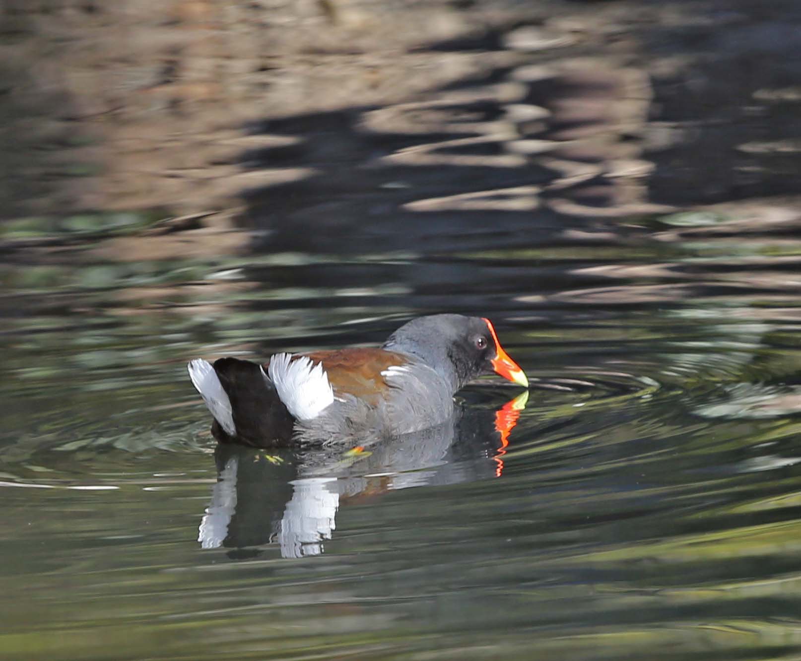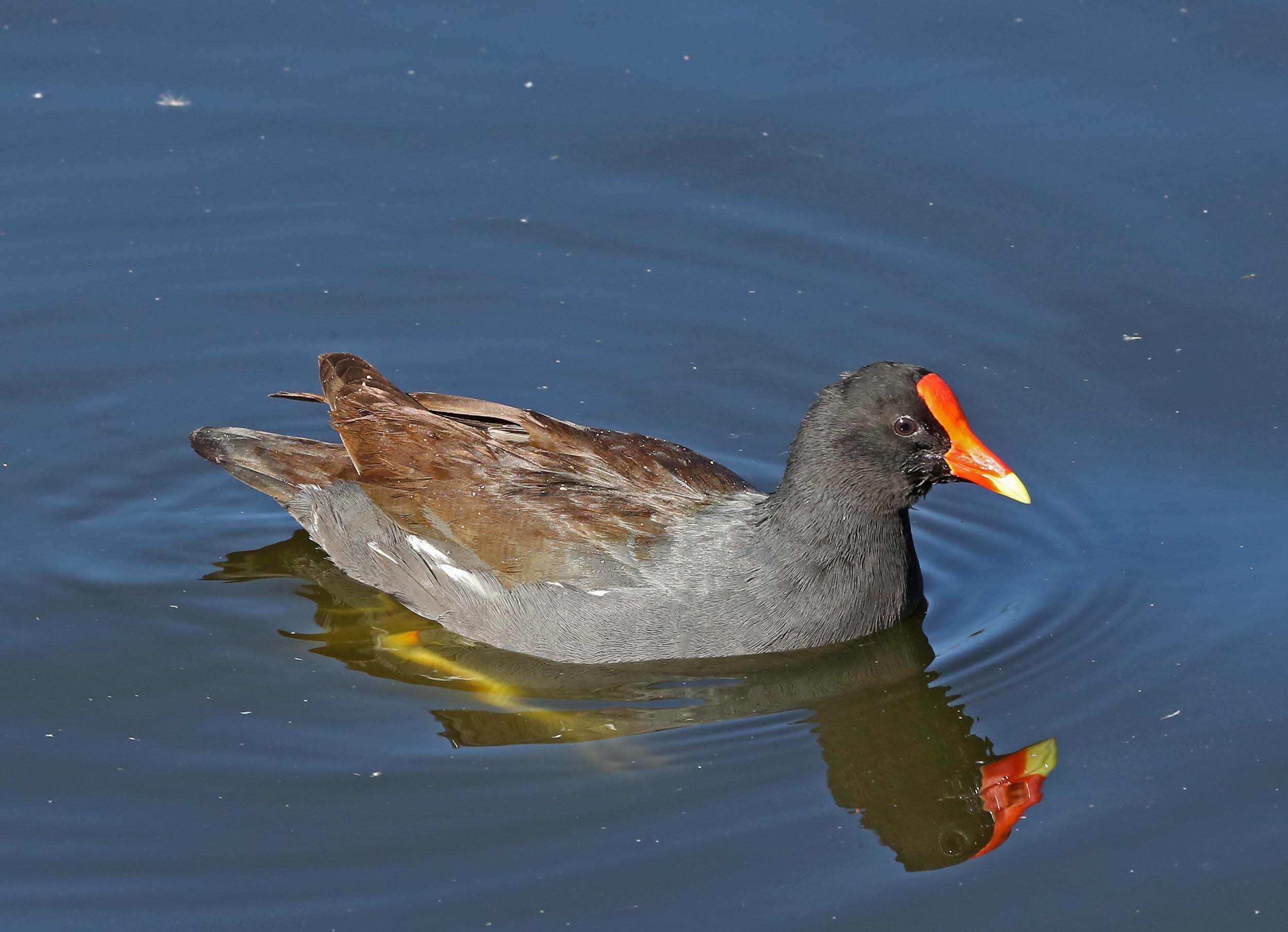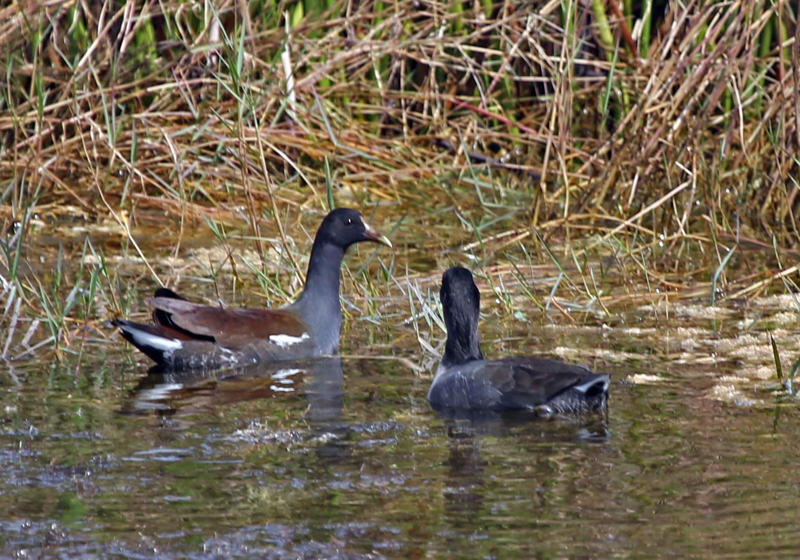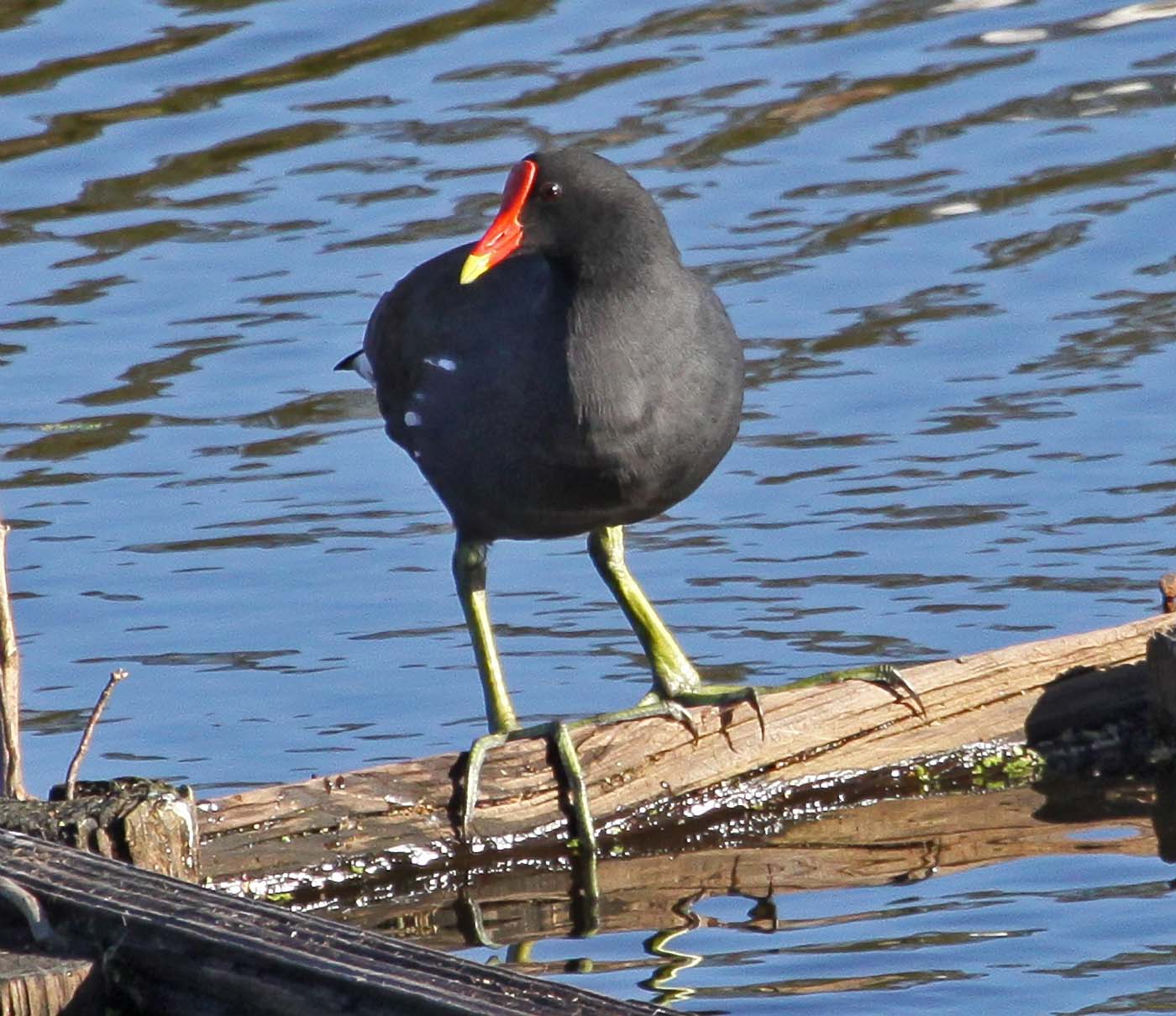 The Common Gallinule (formerly the Common Moorhen) was split from the Common Moorhen by the American Ornithologists' Union in July 2011. The Common Gallinule prefers freshwater marshes and is found throughout North America. Their diet consists of grasses, sedges and sometimes snails. The toes on the Common Moorhen are extremely long and there is no webbing. This supposedly makes it possible for them to walk on floating vegetation. As one of the pictures below shows, they can also run across water.