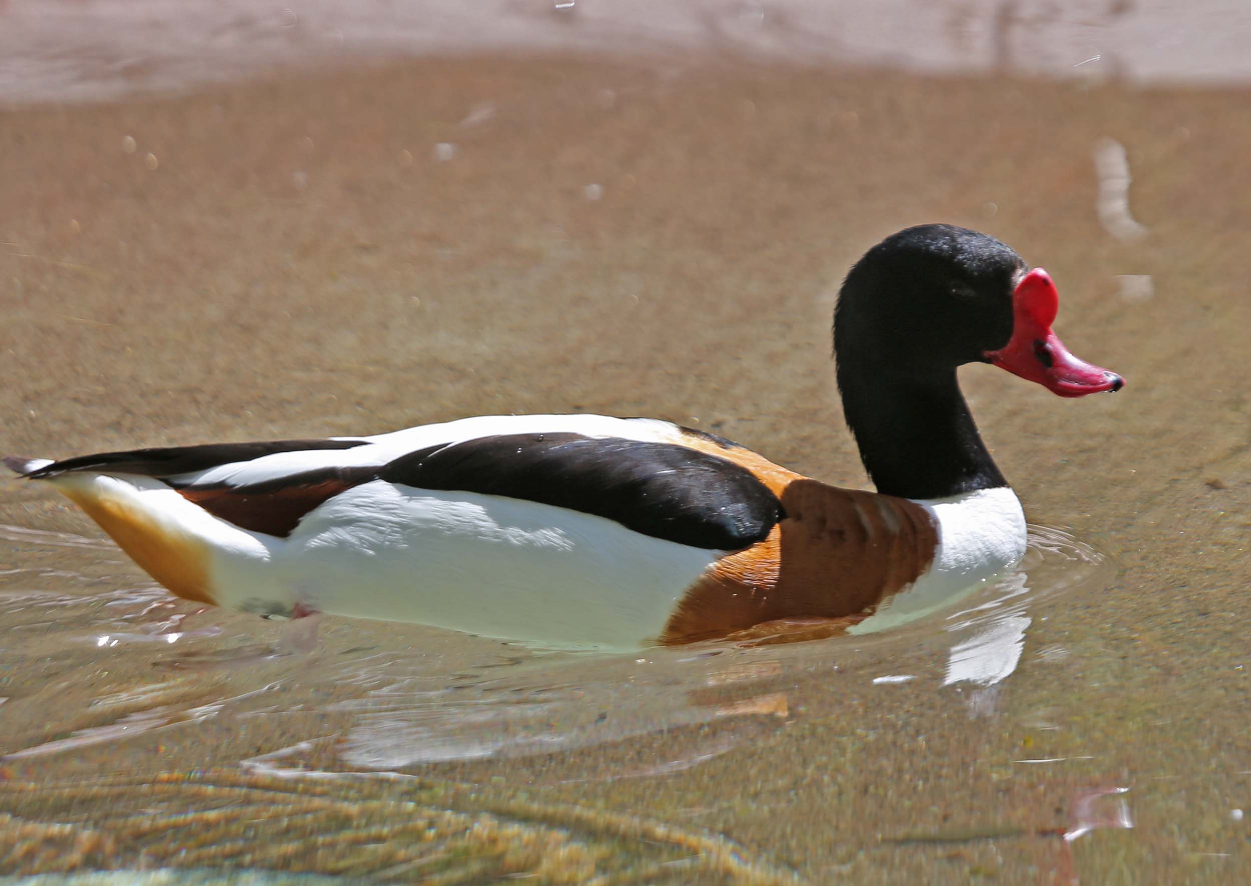 The Common Shelduck is a common bird that is widespread throughout Europe and parts of Asia and Africa. They are predominately white with a dark green head and neck and a chestnut breast-band. The wings coverts are white, the primaries are black, and the secondaries are green and chestnut colored. They have a black belly and their bills are red with pinkish red feet and legs. During the breeding season, the male's bill has a red knob at the base. The sexes are similar but the female is smaller and has white facial markings.