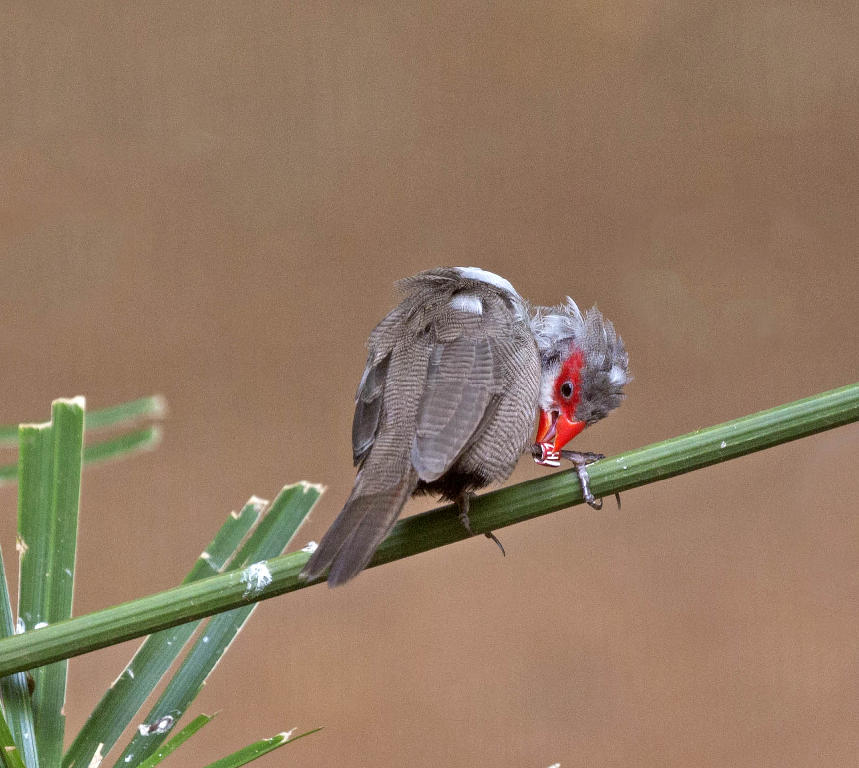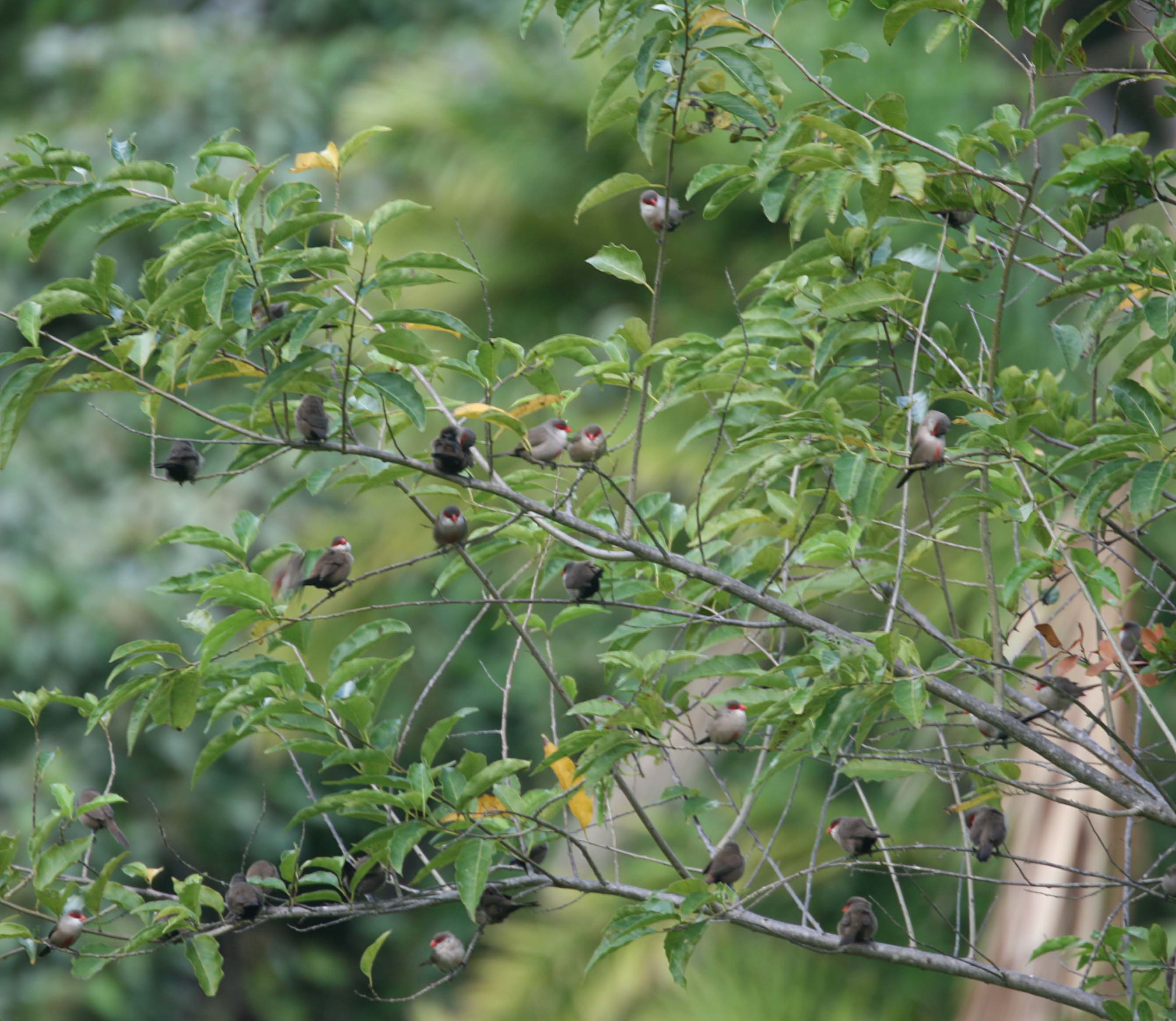 The Common Waxbill is a small passerine bird belonging to the estrildid finch family. They are also known as the St. Helena Waxbill. Common Waxbills are a beautiful little bird that have been imported to Hawaii. Originally, native to sub-Saharan Africa they have been imported to other countries as pets. They eat grass seeds and sometimes insects (especially during breeding season). They usually feed by clinging to the stems of the grass and feeding off the flower heads.