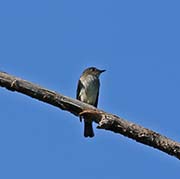 The Eastern Wood-Pewee breeds in the eastern half of the U.S. and winters in northern South America. Diet is insects.