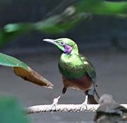 The Emerald Starling or Iris Glossy Starling is found in West Africa. It is a beautiful metallic green starling with a metallic purple underparts and ear-coverts. The iris is dark brown and the bill and legs are black. Juveniles are more brown with some green. This starling is one of the smallest of the starlings.