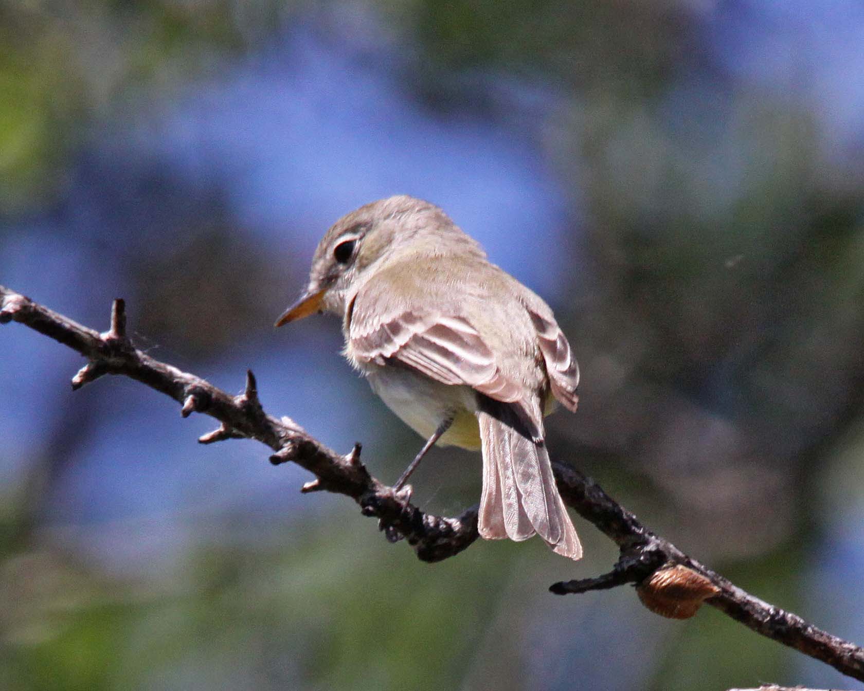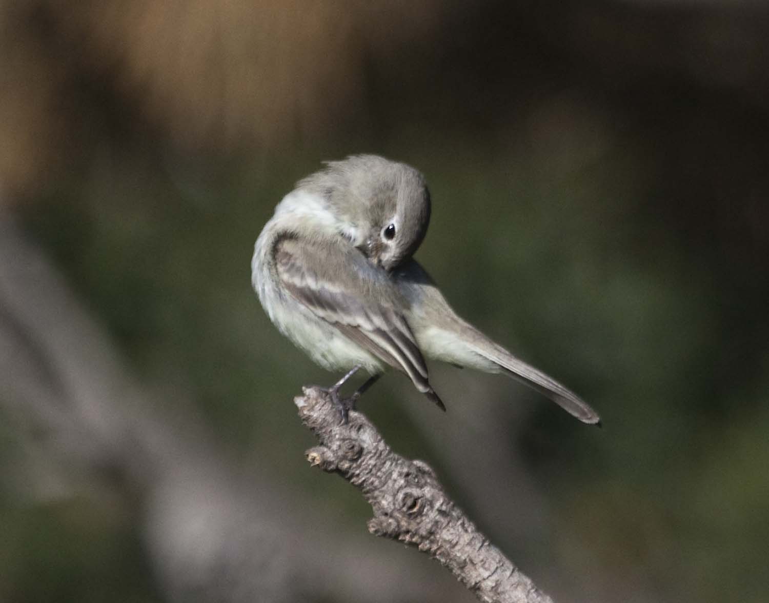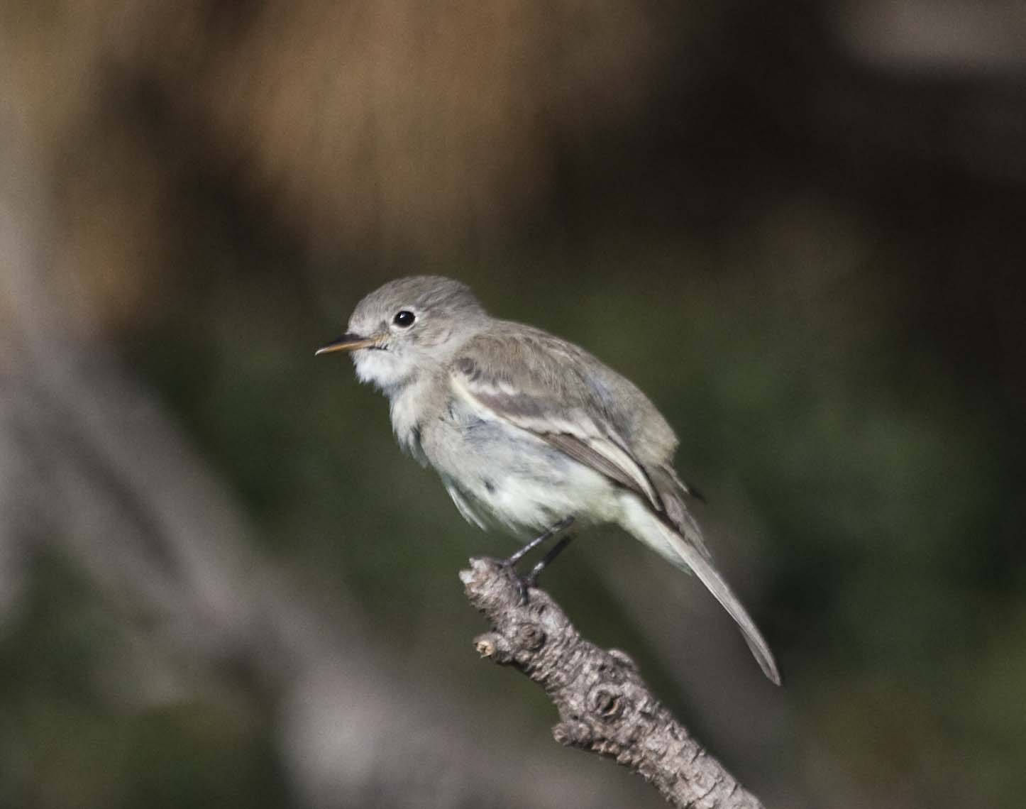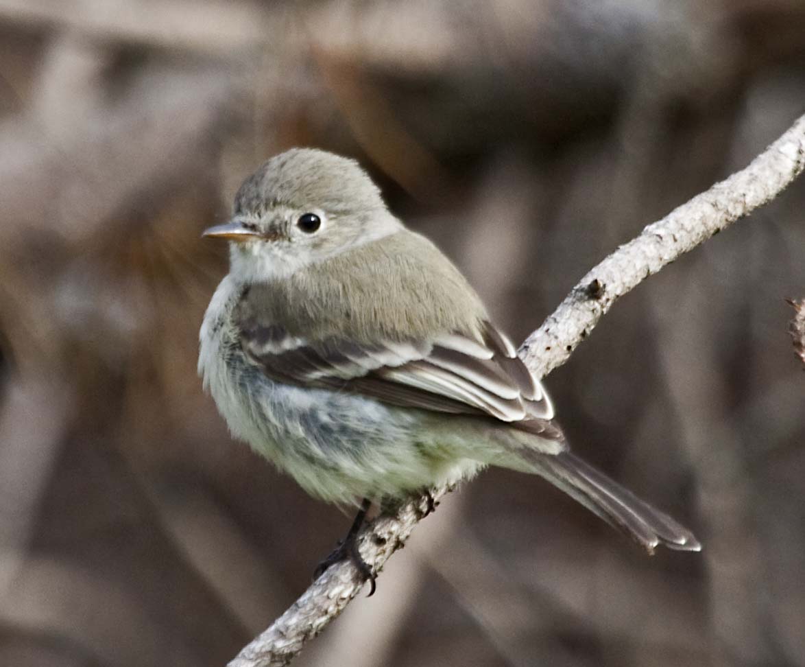 The Gray Flycatcher breeds in mostly in western U.S. and winters in Mexico. The Gray Flycatcher is a rare visitor to the S.F. Bay Area. It was spotted in a park in the East Bay hills. Quite a few birdwatchers came to see it. The best way to identify these birds is that they wag their tail downward.